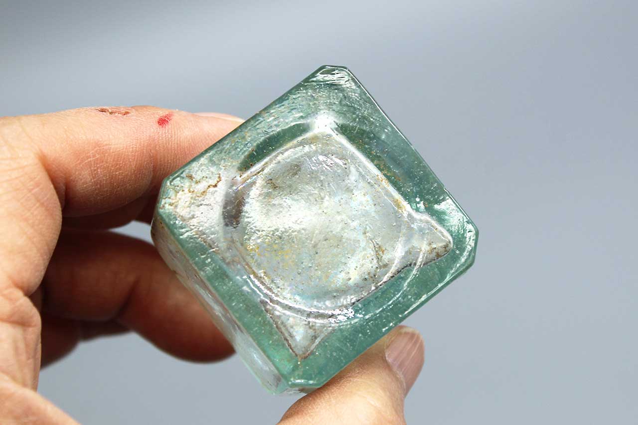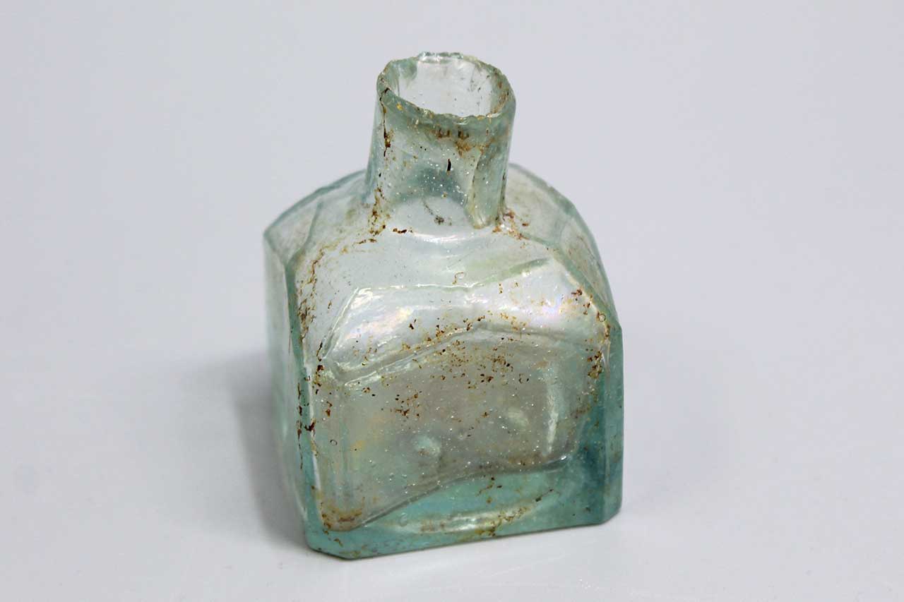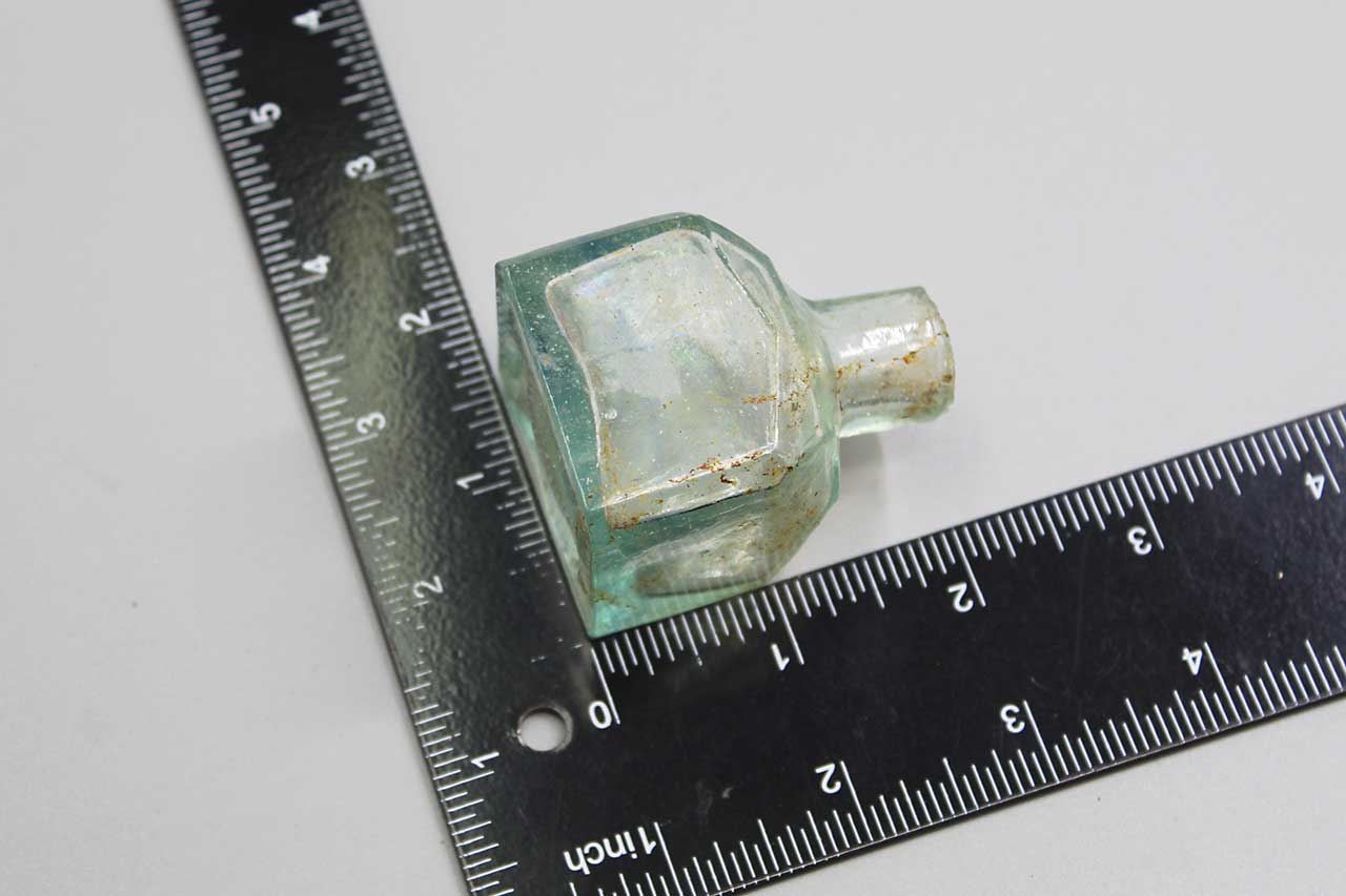 American Civil War Era Ink Bottle. This charming sheared glass ink bottle features an aqua hue and a rough sheared lip, crafted from blown glass. It stands 2 1/4 inches tall and is 1 1/2 inches across. While the lip has some sheared roughness, the bottle remains in good condition overall.