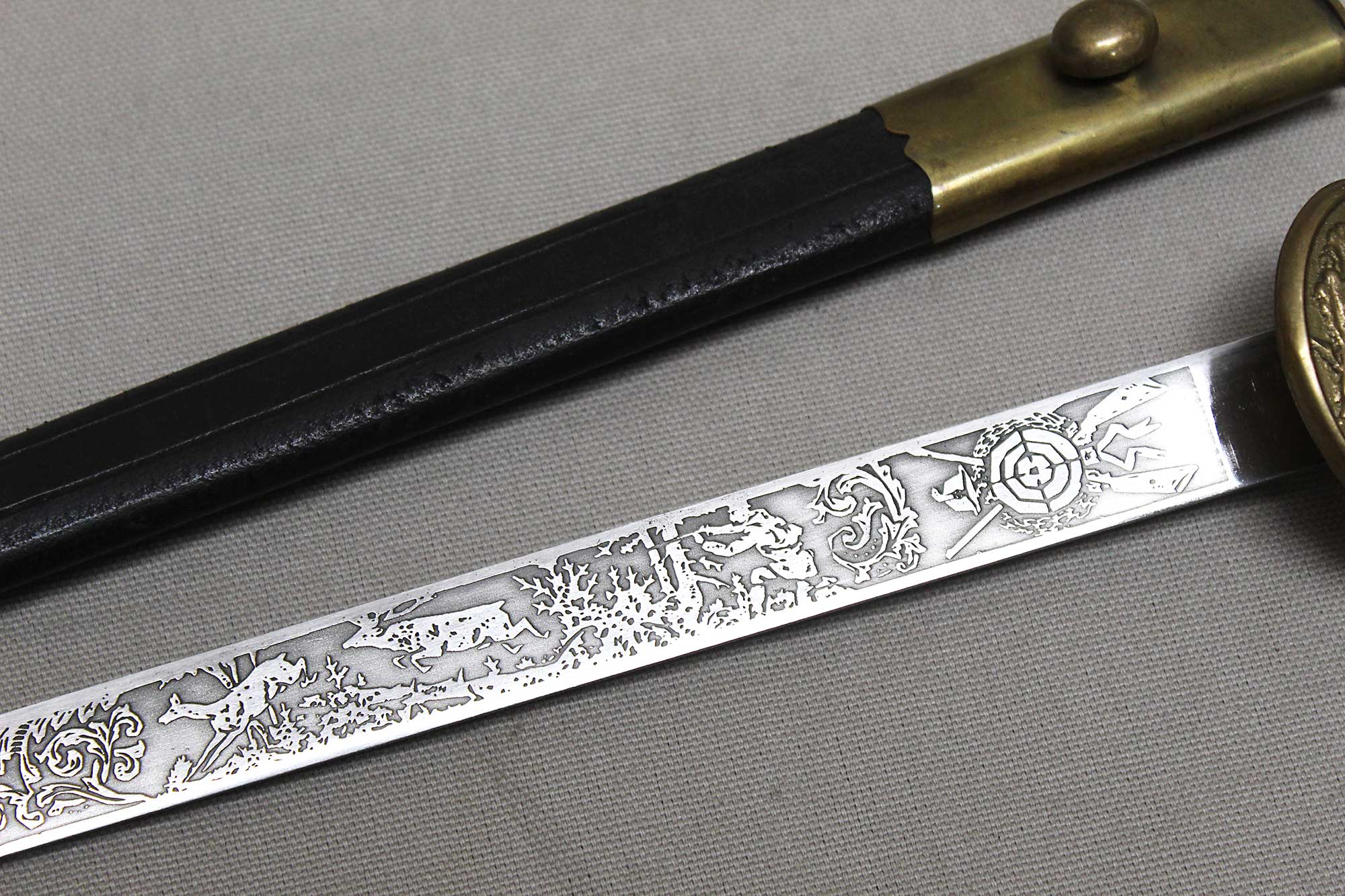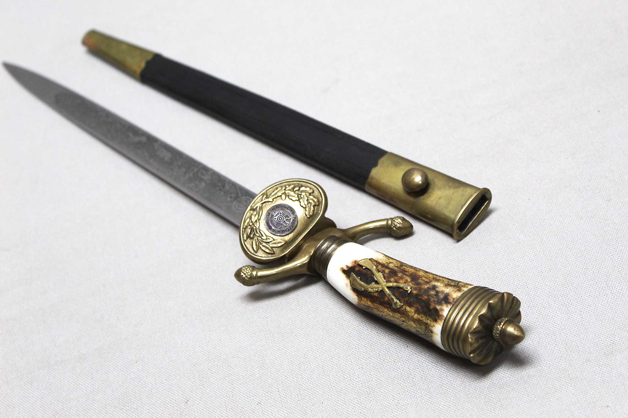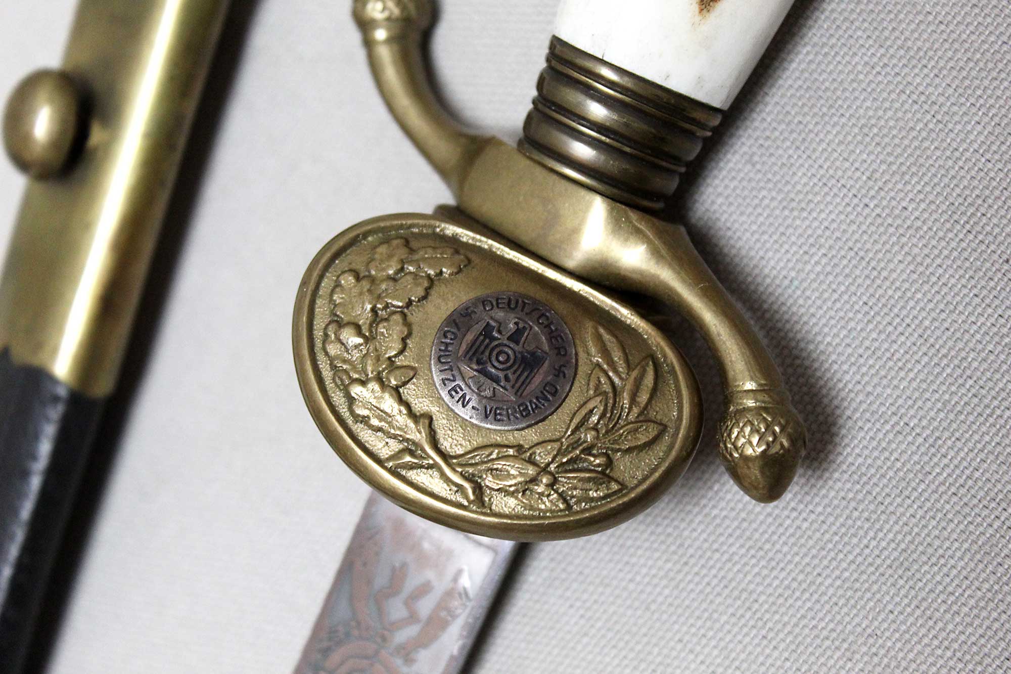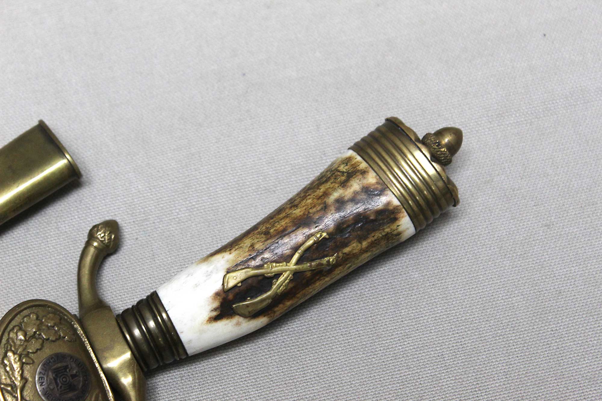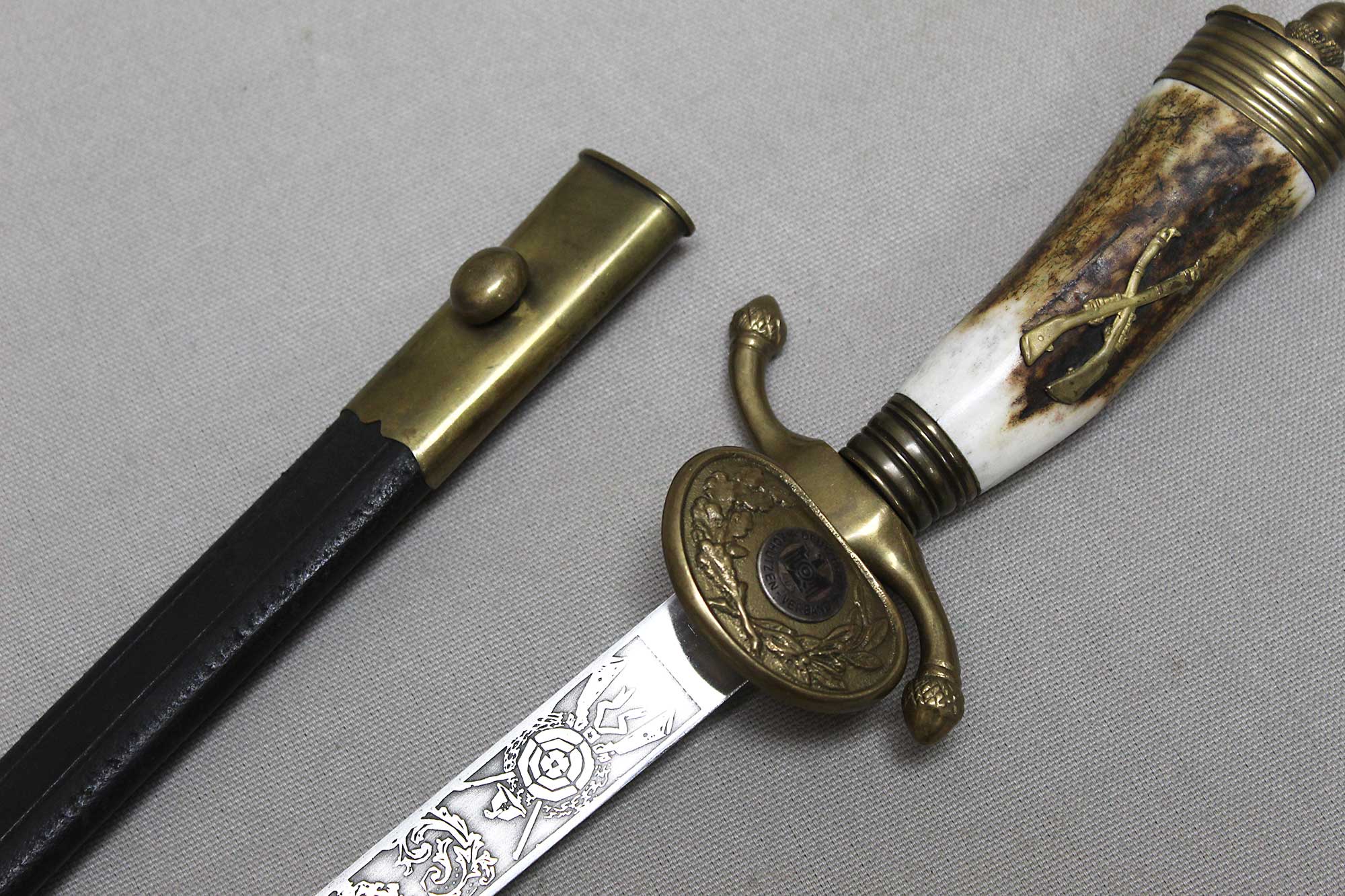 WW2 German Rifle Association Dagger. Marker marked on blade ricasso with the Eickhorn Solingen maker logo. Very nicely etched blade that has hunting type deer scenes and also has the rifle association type logo in the etching as well. The grip is not the standard grip and is a nice variation grip with the two crossed rifles. The leather scabbard is in nice condition as well. The oval clamshell guard has an oak leaf and acorn laurel leaf design surrounding an enameled “Deutscher – Schützen-Verband” Rifle Association Membership emblem which is pinned in place. Nice condition of a very hard to find dagger.