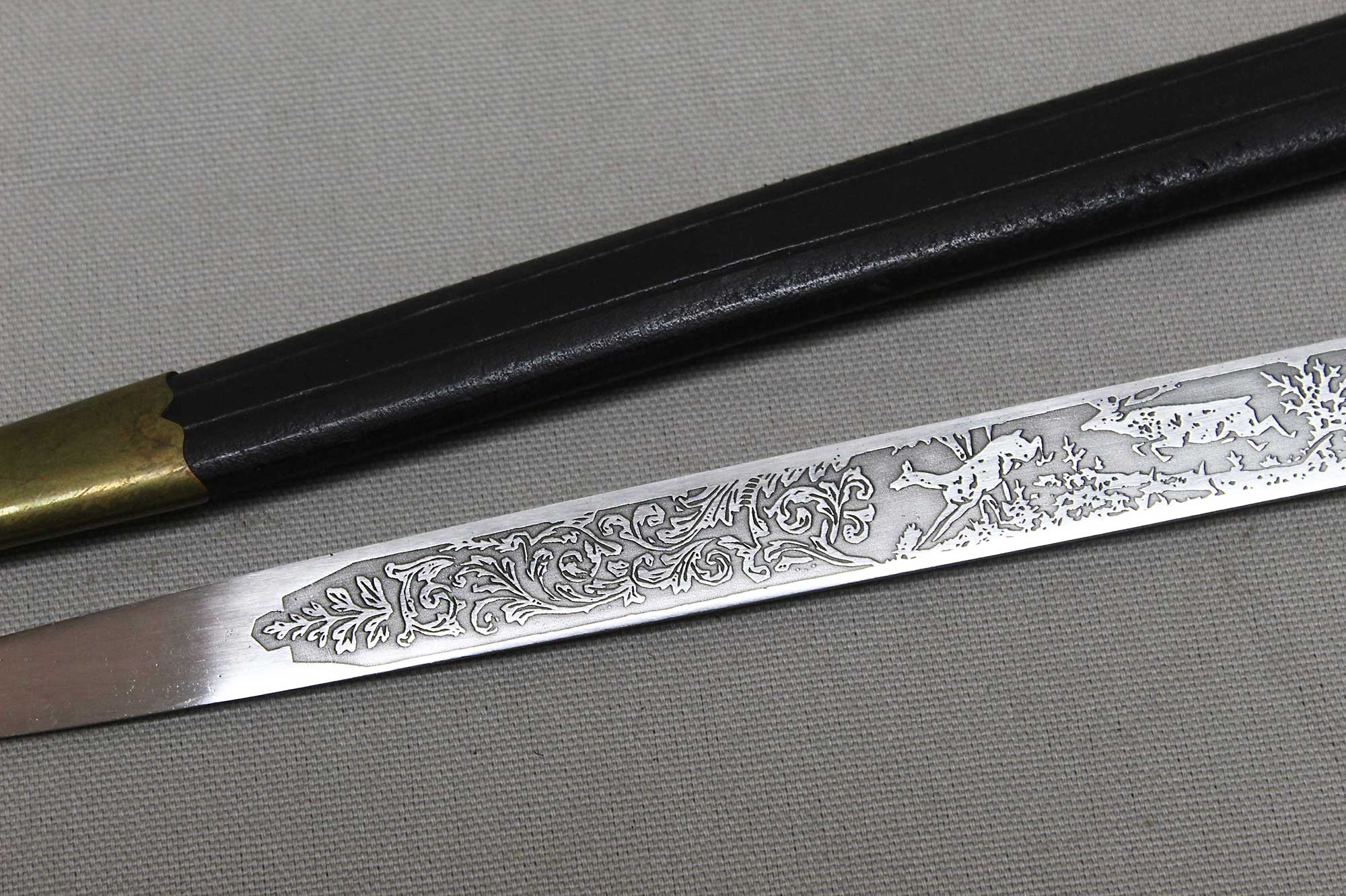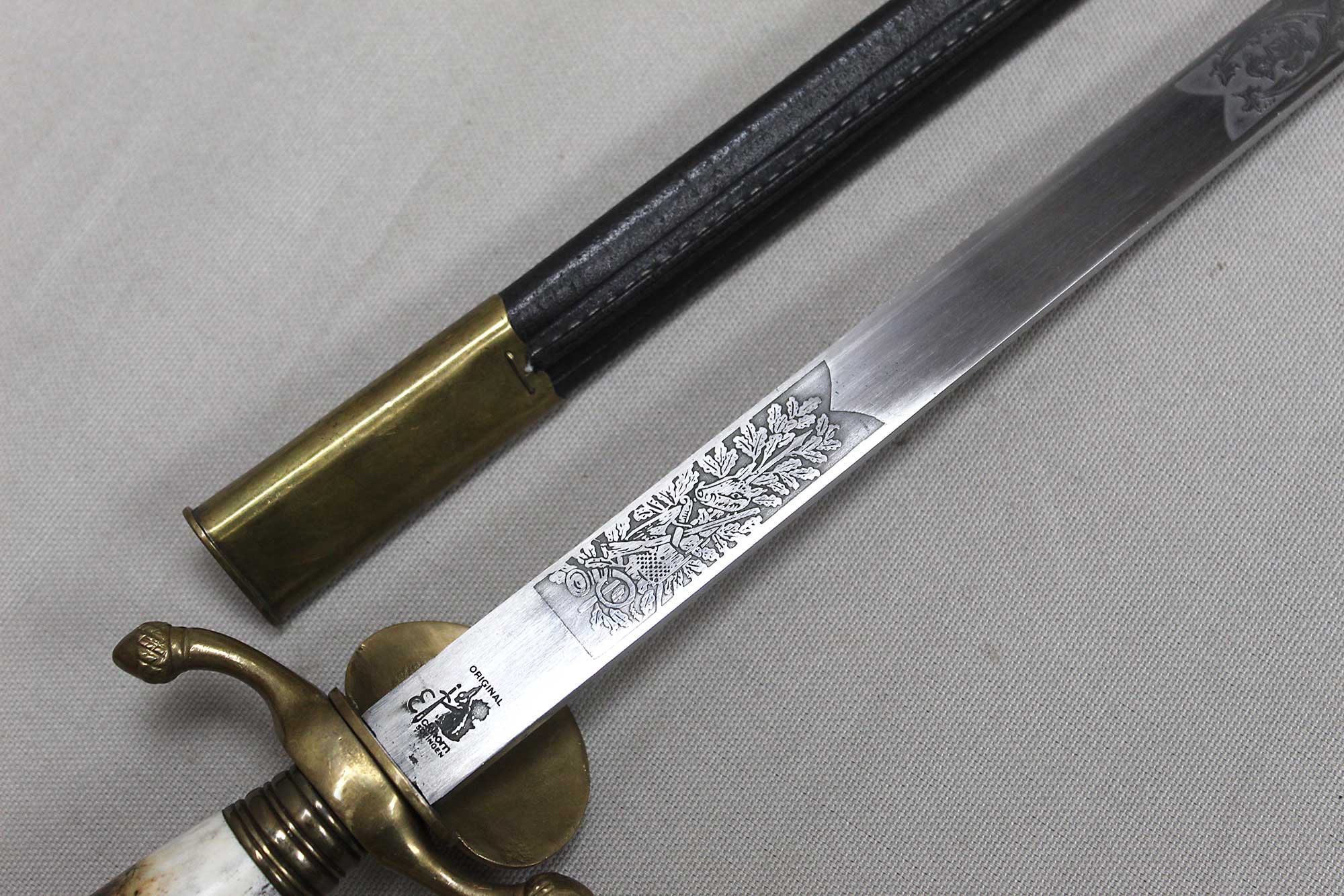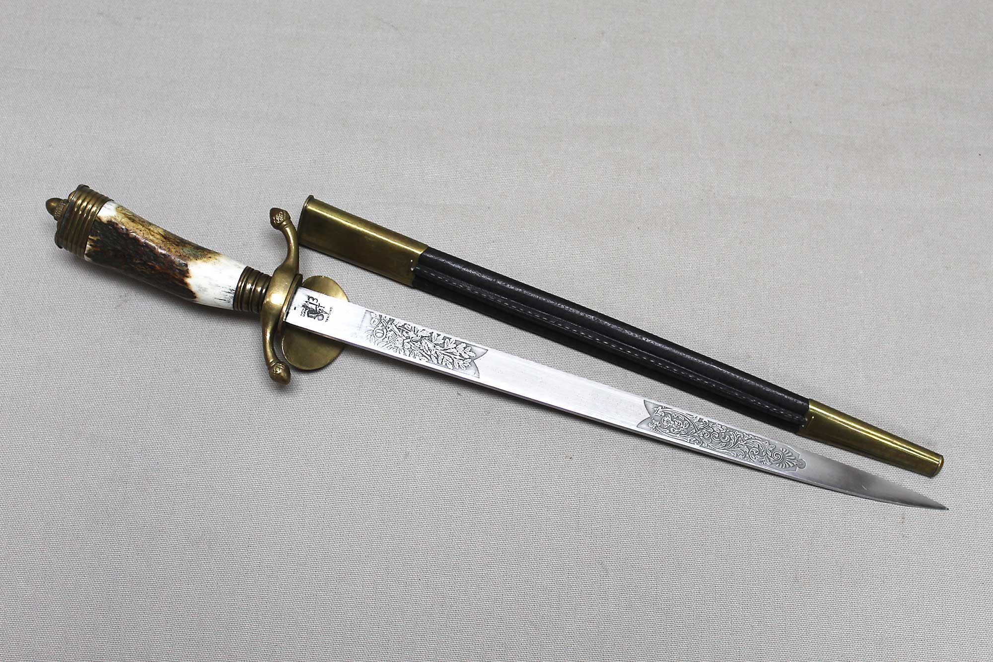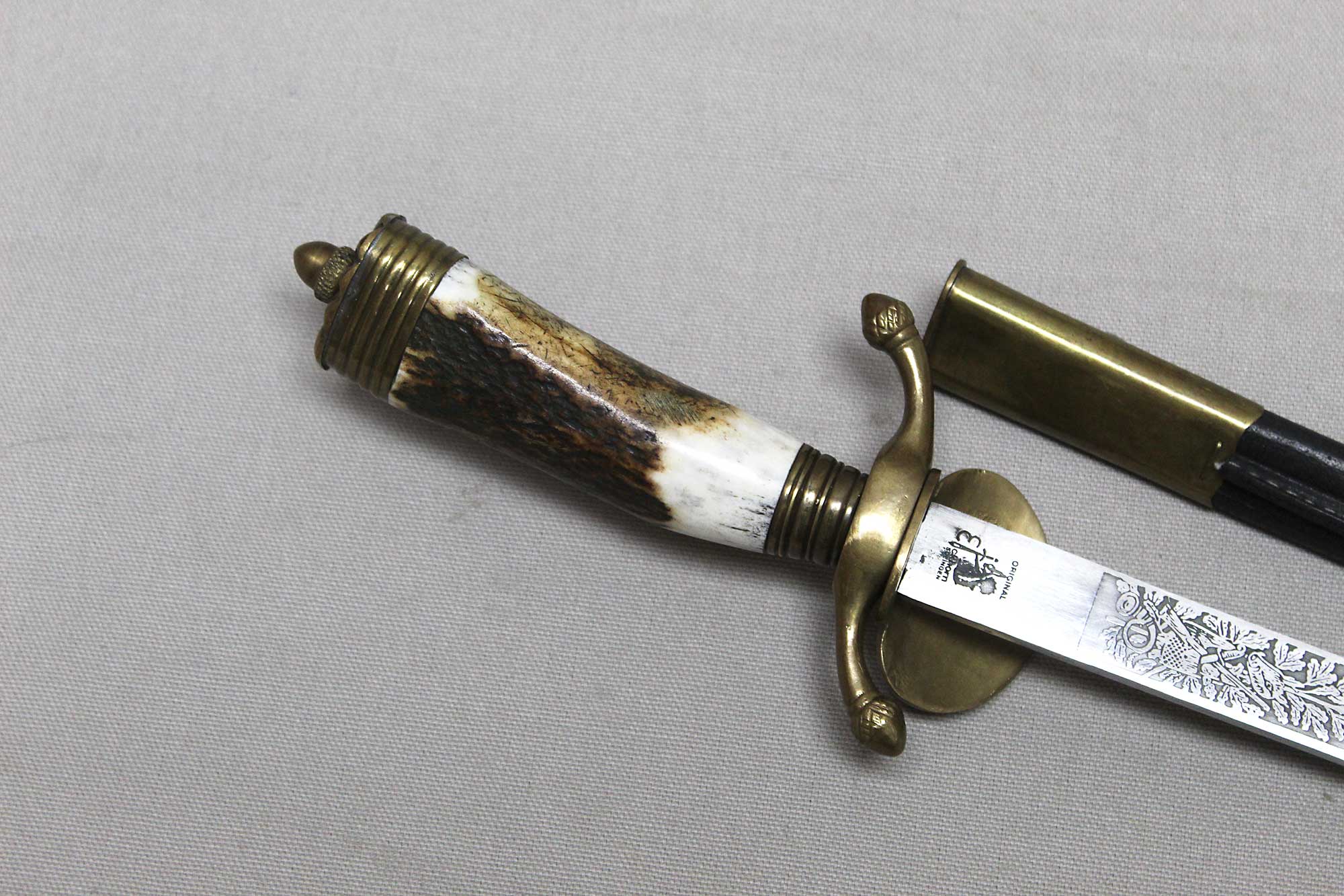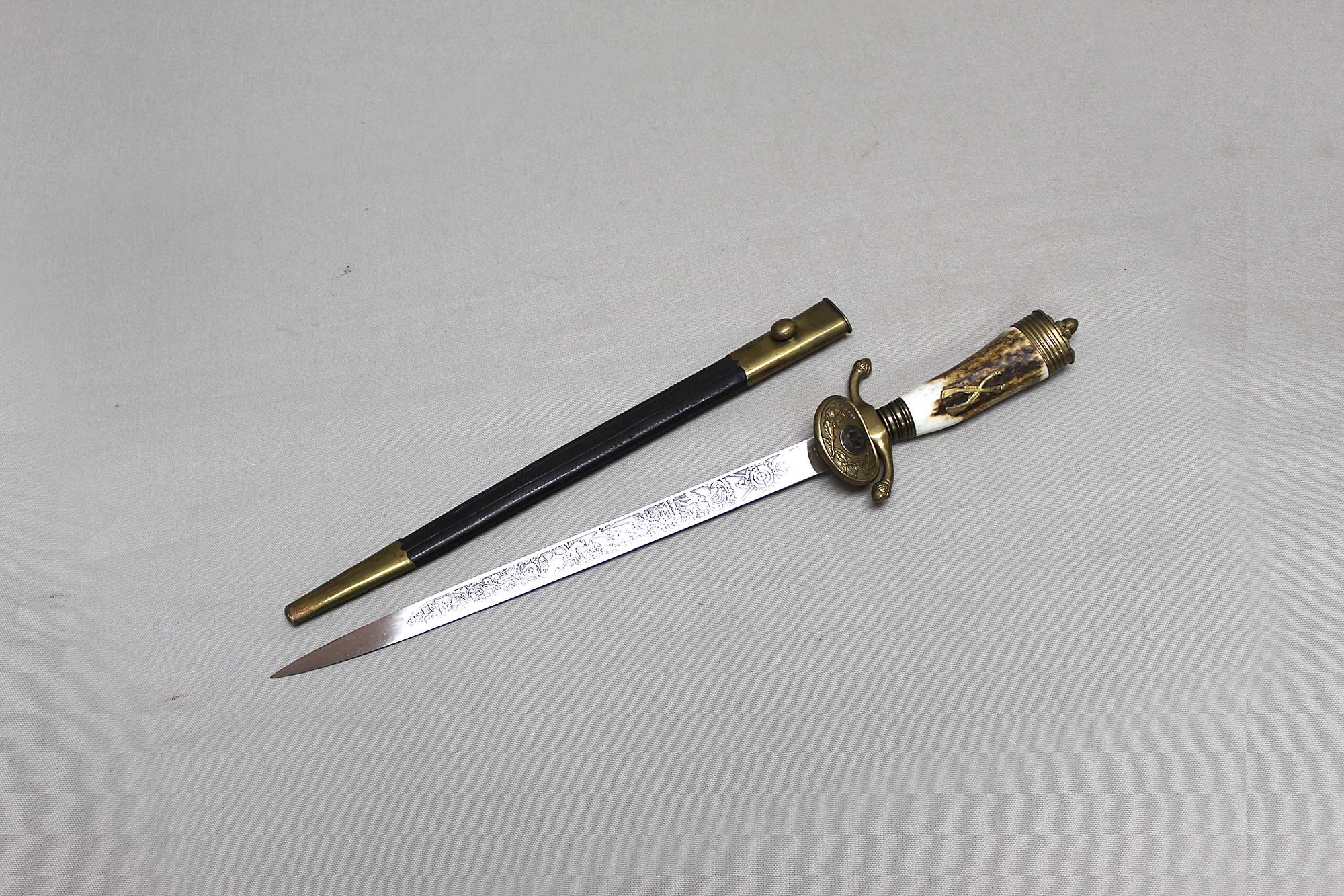 WW2 German Rifle Association Dagger. Marker marked on blade ricasso with the Eickhorn Solingen maker logo. Very nicely etched blade that has hunting type deer scenes and also has the rifle association type logo in the etching as well. The grip is not the standard grip and is a nice variation grip with the two crossed rifles. The leather scabbard is in nice condition as well. The oval clamshell guard has an oak leaf and acorn laurel leaf design surrounding an enameled “Deutscher – Schützen-Verband” Rifle Association Membership emblem which is pinned in place. Nice condition of a very hard to find dagger.