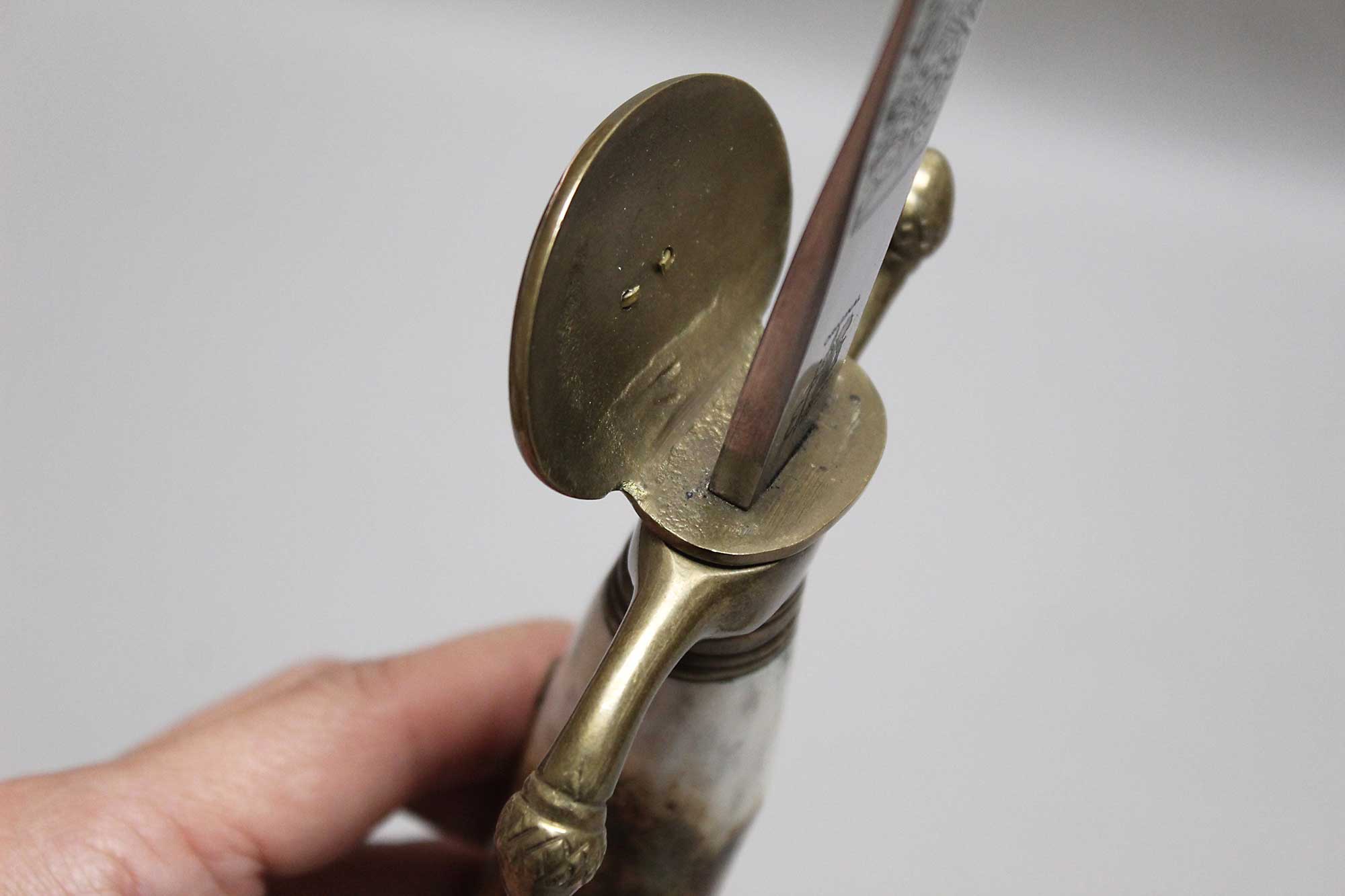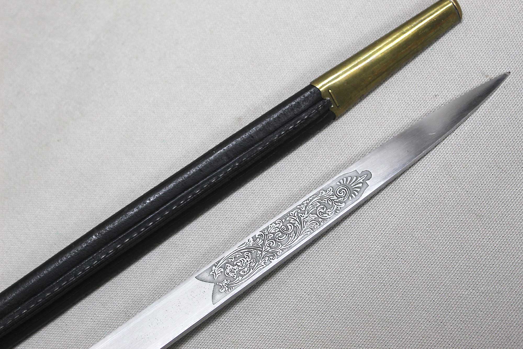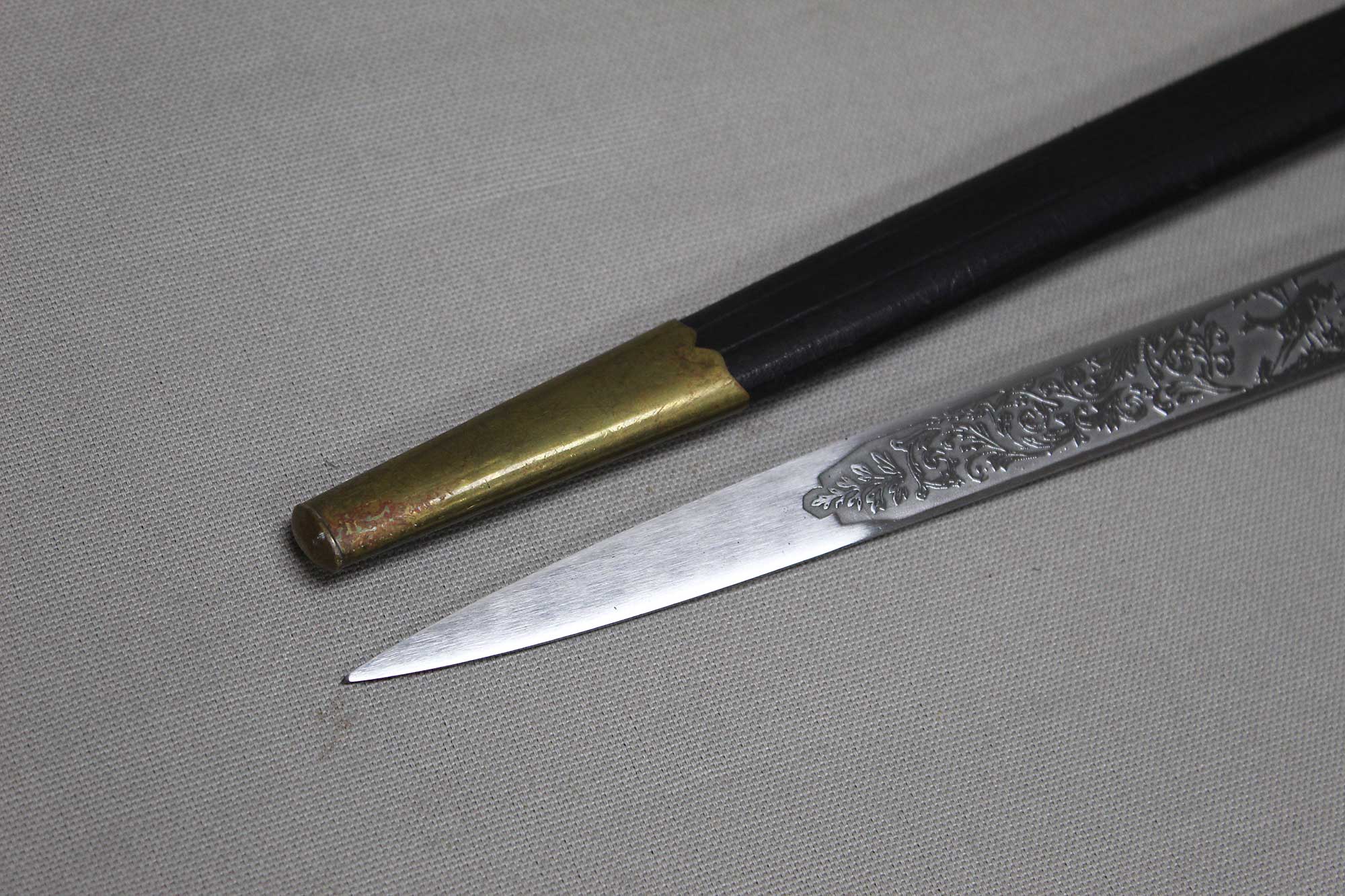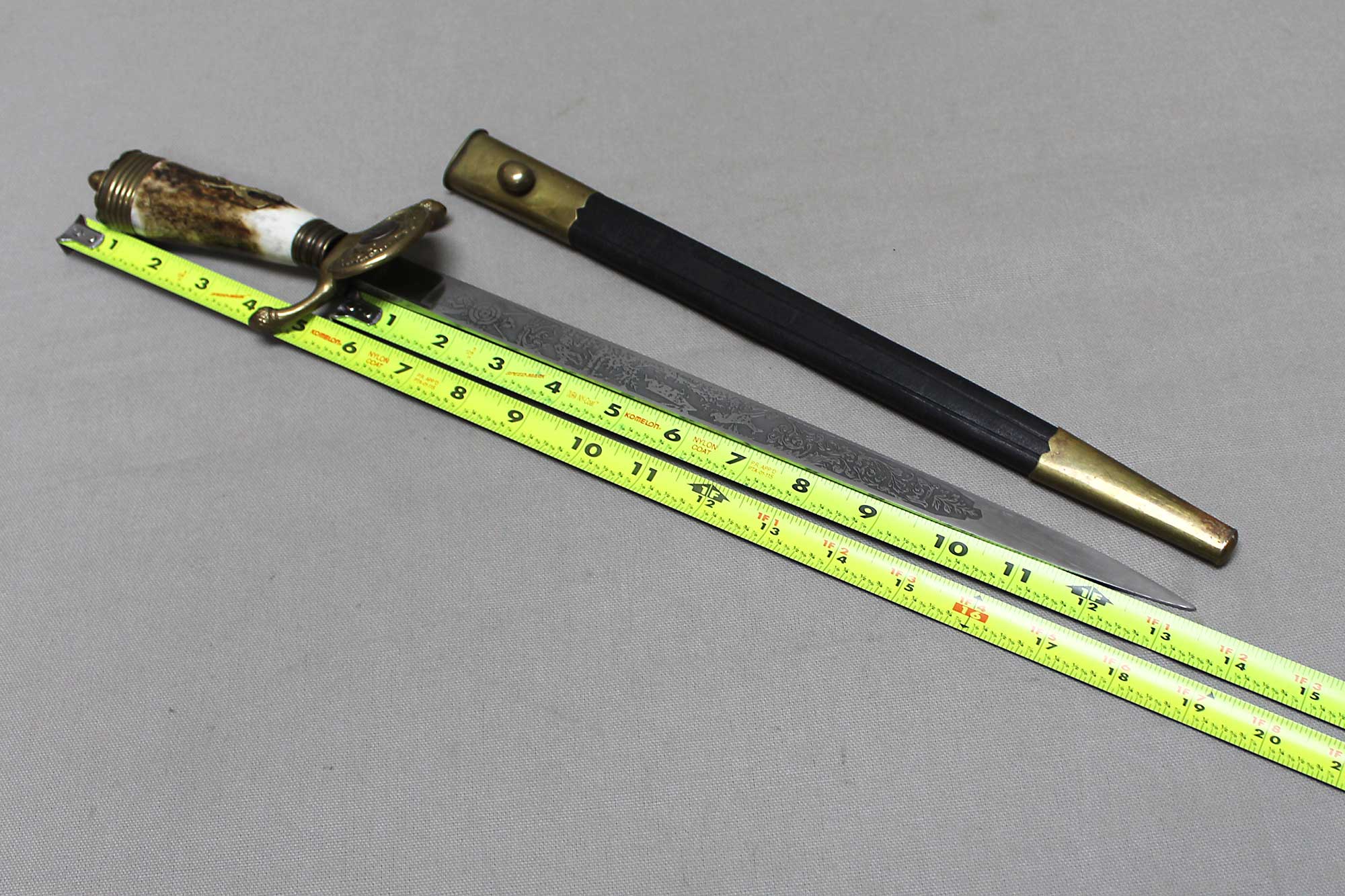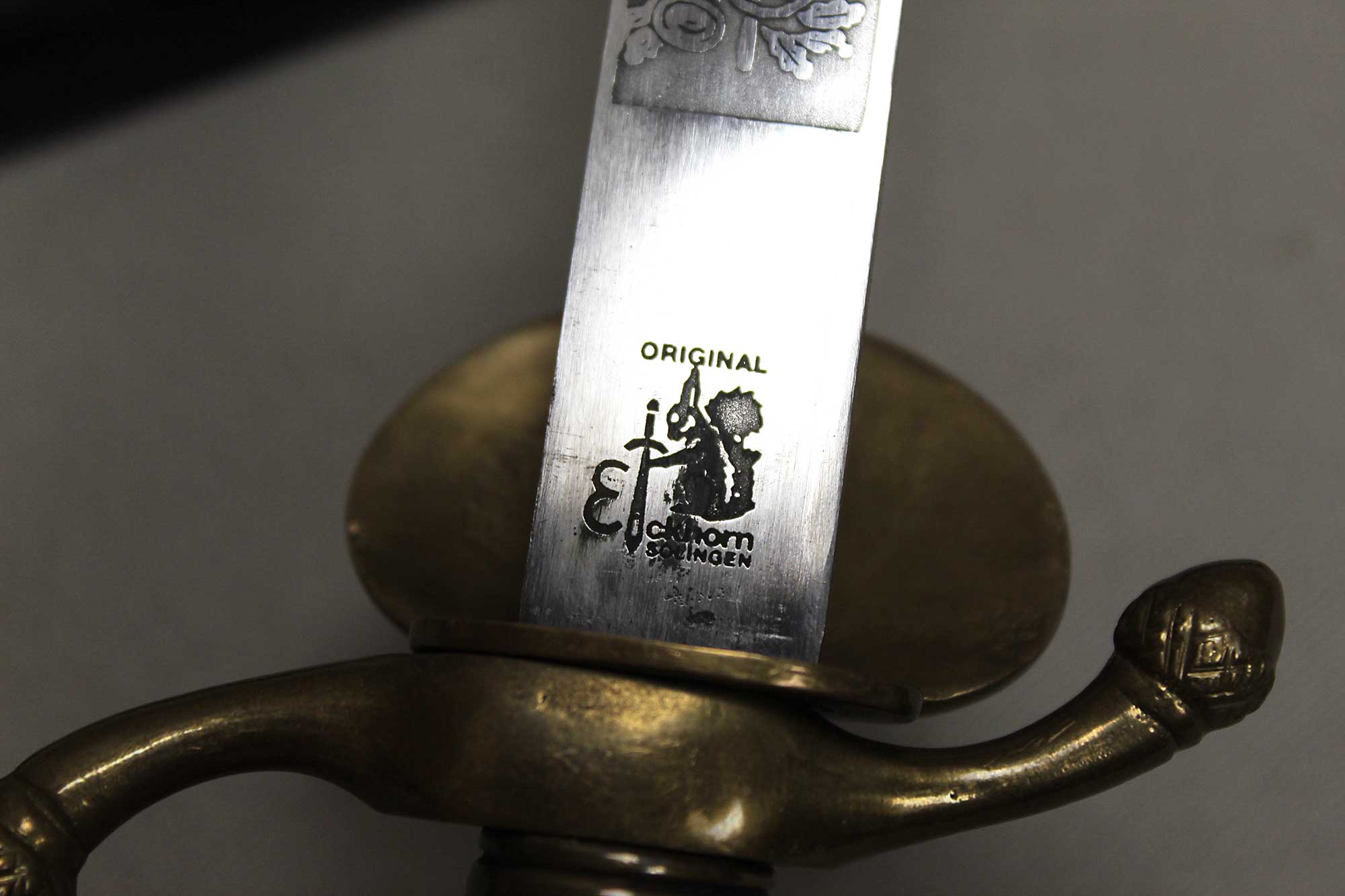WW2 German Rifle Association Dagger. Marker marked on blade ricasso with the Eickhorn Solingen maker logo. Very nicely etched blade that has hunting type deer scenes and also has the rifle association type logo in the etching as well. The grip is not the standard grip and is a nice variation grip with the two crossed rifles. The leather scabbard is in nice condition as well. The oval clamshell guard has an oak leaf and acorn laurel leaf design surrounding an enameled “Deutscher – Schützen-Verband” Rifle Association Membership emblem which is pinned in place. Nice condition of a very hard to find dagger.