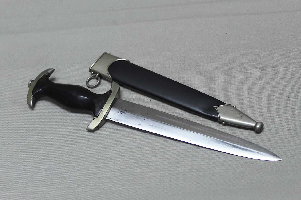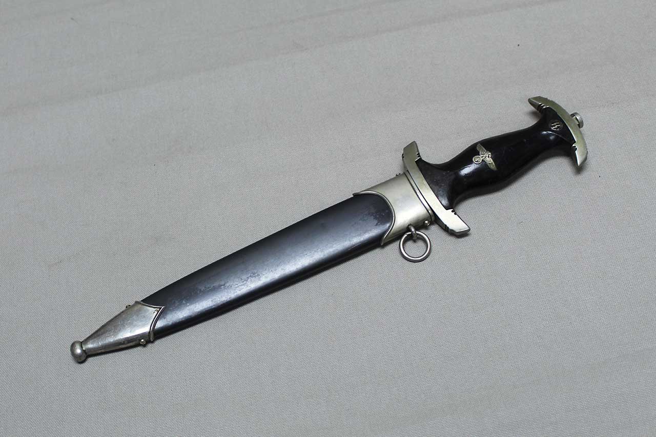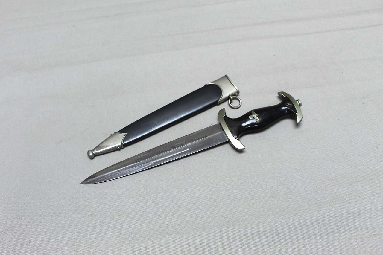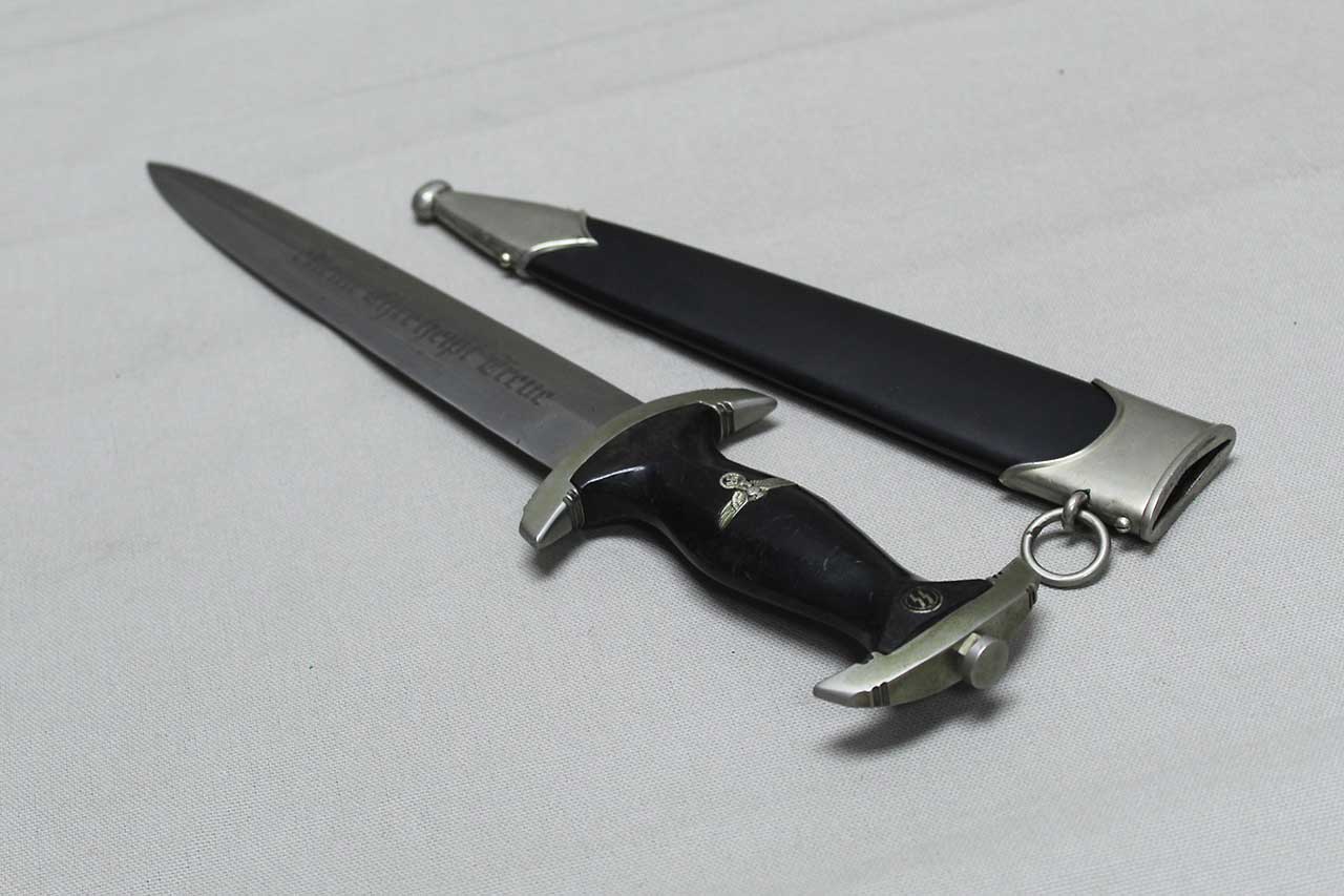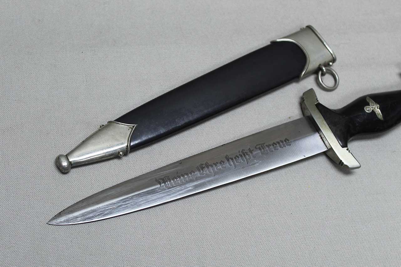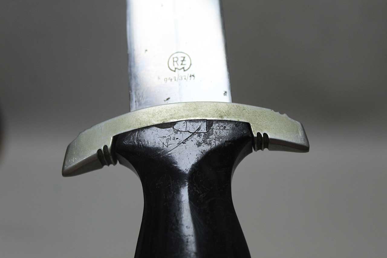 WW2 German SS Service Dagger. RZM code of: RZM 941/37/SS (for Eickhorn Solingen). Middle period SS Service dagger 1936-38. Blade with graying, wear, and in-and-out marks. Blade has the typical SS motto, “Meine Erhe heisst Treue” or “My Honor is Loyalty”. The black ebony grip is in decent condition with some surface chipping especially near top area with a large surface chipped portion on upper back section. Dagger has a nice-looking nickel-plated eagle and SS roundel. Nickel-alloy (Neusilber) fittings and cross guards with the lower crossguard has Eickhorn work bench number of “5” mark on underside of crossguard. Has steel based anodized/blacken scabbard with some wear and slight indentation on lower back side. Scabbard screws all in place and in good condition and scabbard ball in decent condition. Overall, a nice Eickhorn RZM code SS service dagger.