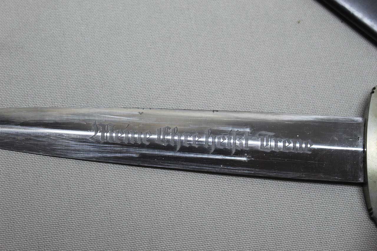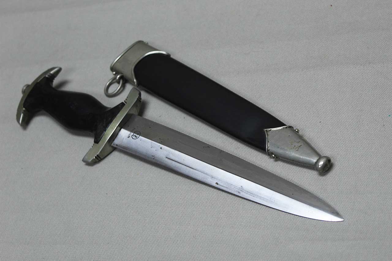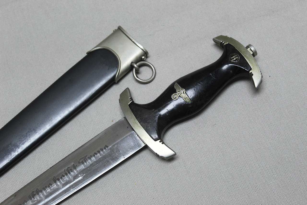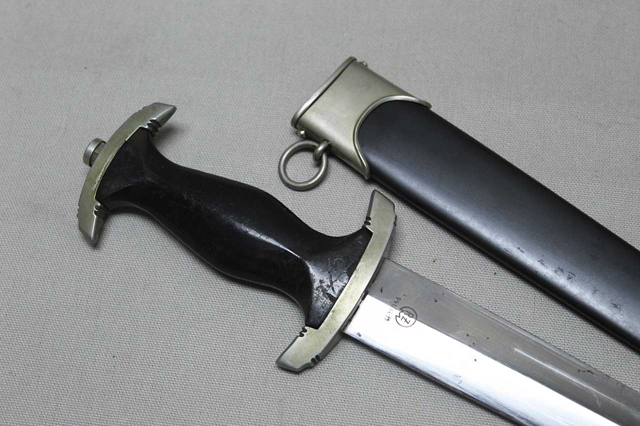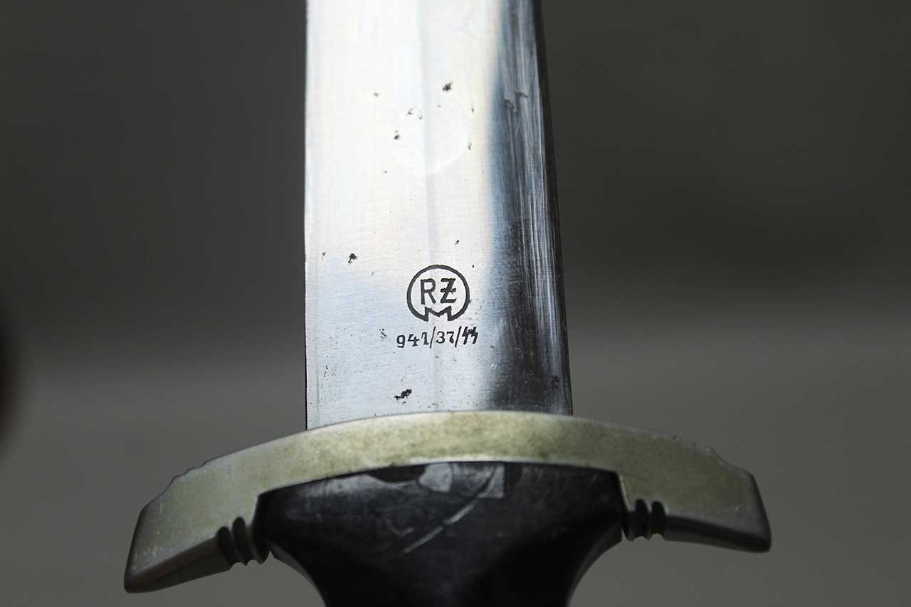 WW2 German SS Service Dagger. RZM code of: RZM 941/37/SS (for Eickhorn Solingen). Middle period SS Service dagger 1936-38. Blade with graying, wear, and in-and-out marks. Blade has the typical SS motto, “Meine Erhe heisst Treue” or “My Honor is Loyalty”. The black ebony grip is in decent condition with some surface chipping especially near top area with a large surface chipped portion on upper back section. Dagger has a nice-looking nickel-plated eagle and SS roundel. Nickel-alloy (Neusilber) fittings and cross guards with the lower crossguard has Eickhorn work bench number of “5” mark on underside of crossguard. Has steel based anodized/blacken scabbard with some wear and slight indentation on lower back side. Scabbard screws all in place and in good condition and scabbard ball in decent condition. Overall, a nice Eickhorn RZM code SS service dagger.