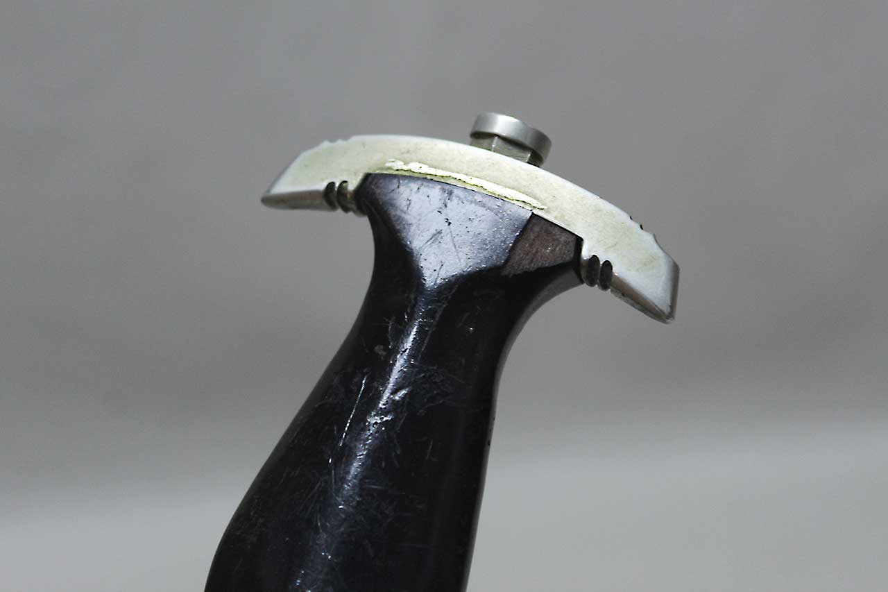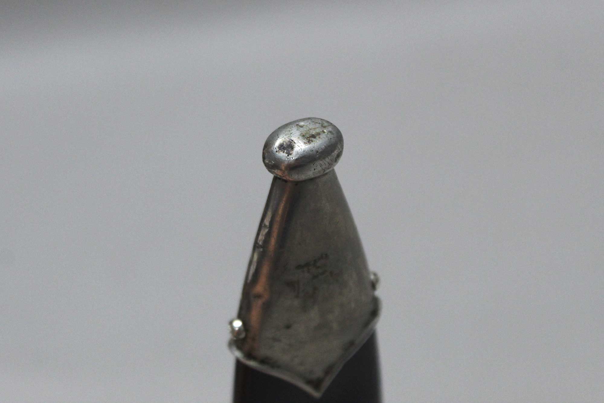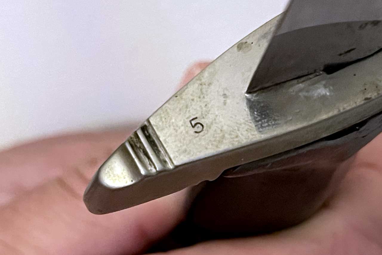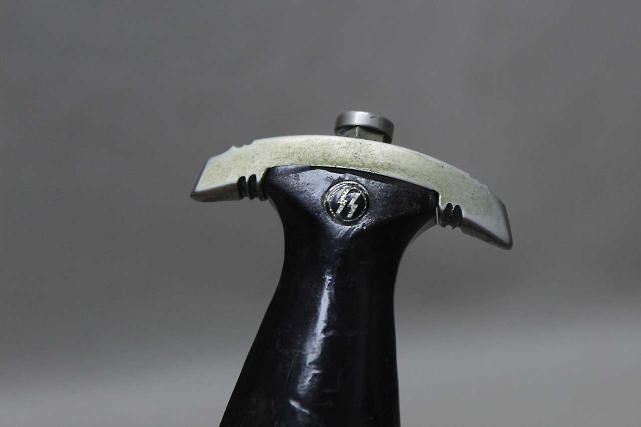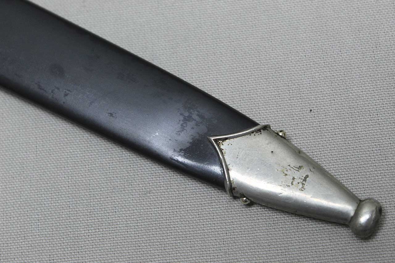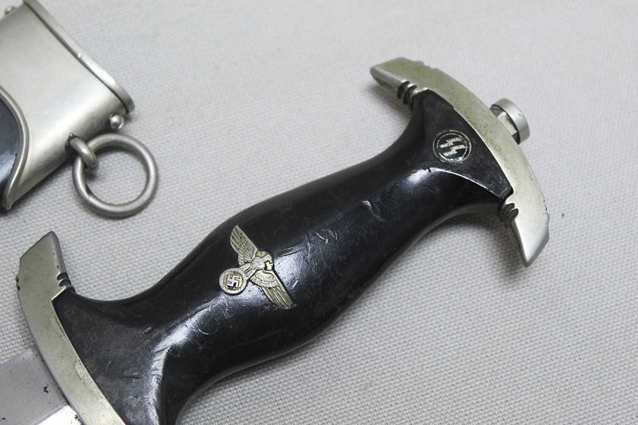 WW2 German SS Service Dagger. RZM code of: RZM 941/37/SS (for Eickhorn Solingen). Middle period SS Service dagger 1936-38. Blade with graying, wear, and in-and-out marks. Blade has the typical SS motto, “Meine Erhe heisst Treue” or “My Honor is Loyalty”. The black ebony grip is in decent condition with some surface chipping especially near top area with a large surface chipped portion on upper back section. Dagger has a nice-looking nickel-plated eagle and SS roundel. Nickel-alloy (Neusilber) fittings and cross guards with the lower crossguard has Eickhorn work bench number of “5” mark on underside of crossguard. Has steel based anodized/blacken scabbard with some wear and slight indentation on lower back side. Scabbard screws all in place and in good condition and scabbard ball in decent condition. Overall, a nice Eickhorn RZM code SS service dagger.