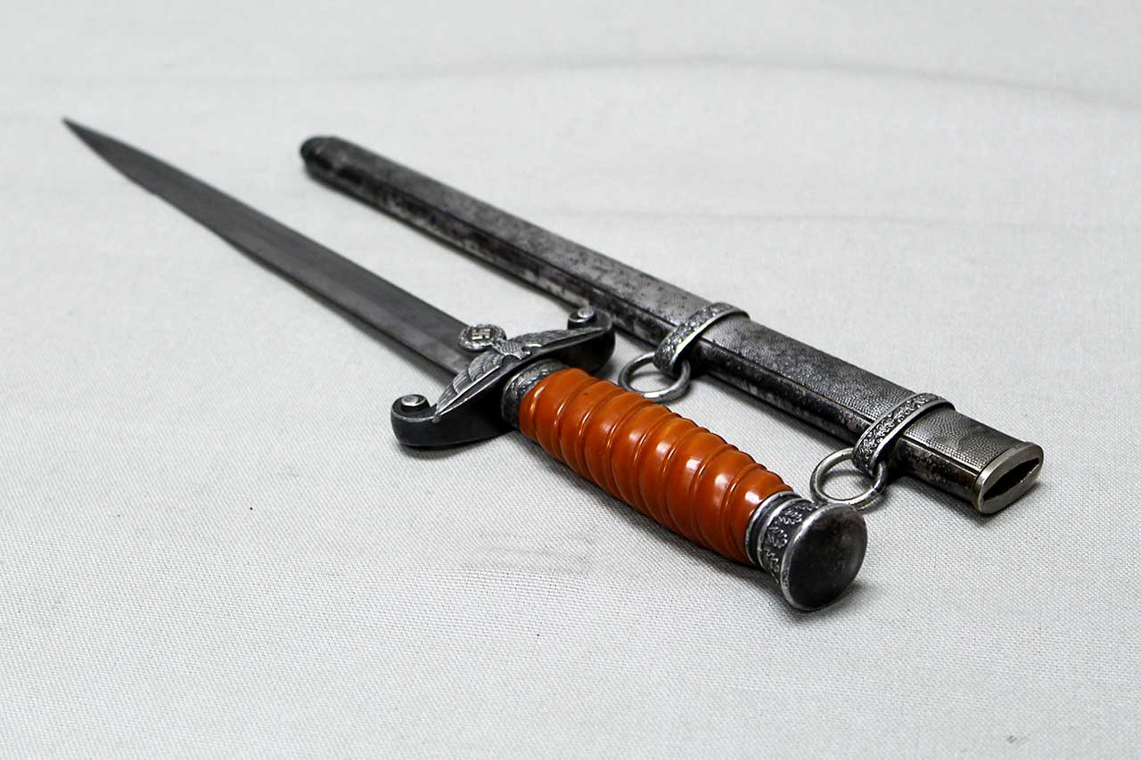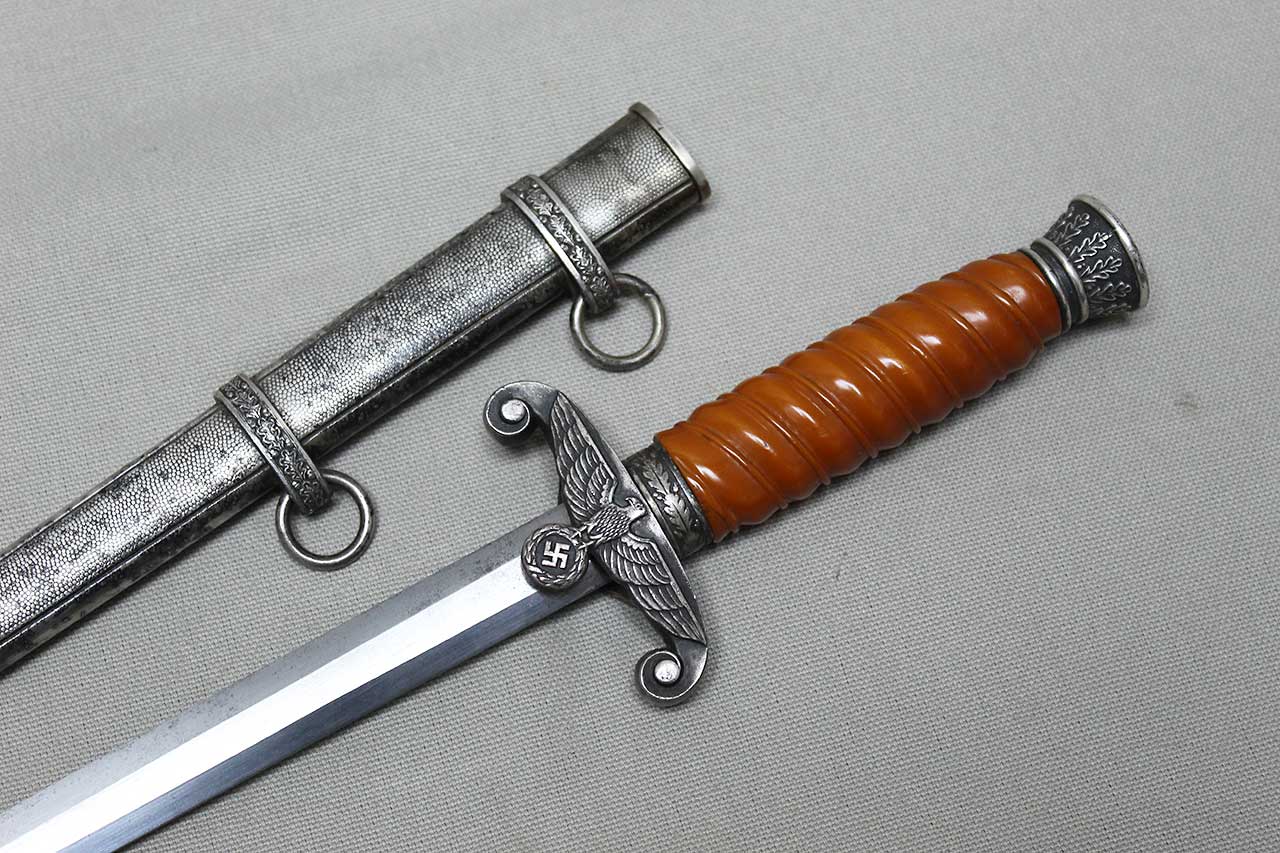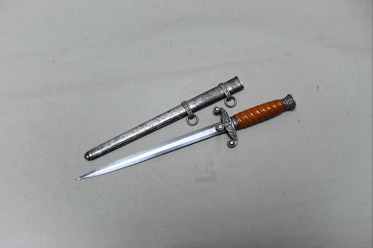 Additional Notes: The WW2 German Army (Heer) officer dagger was first authorized for army personnel to carry in 1935. These daggers were privately purchased items and were part of the officer’s uniform. The design featured a silvered exterior with a white or colored grip, a cross guard depicting a Wehrmacht open-winged eagle clutching a wreathed swaz, and a pommel with a pattern of vertical standing oak leaves and acorns. The scabbard body had two panels of a random pebbled design with two oak leaf and acorn designed bands. Early examples had brass or tombac-based fittings that were quality plated, tapered tang blades, and trylon slant grips. Later examples transitioned to zinc-based fittings, celluloid plaster grips, and were finished in a natural gray metal.
