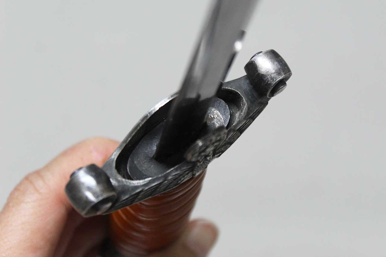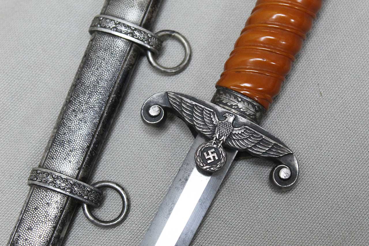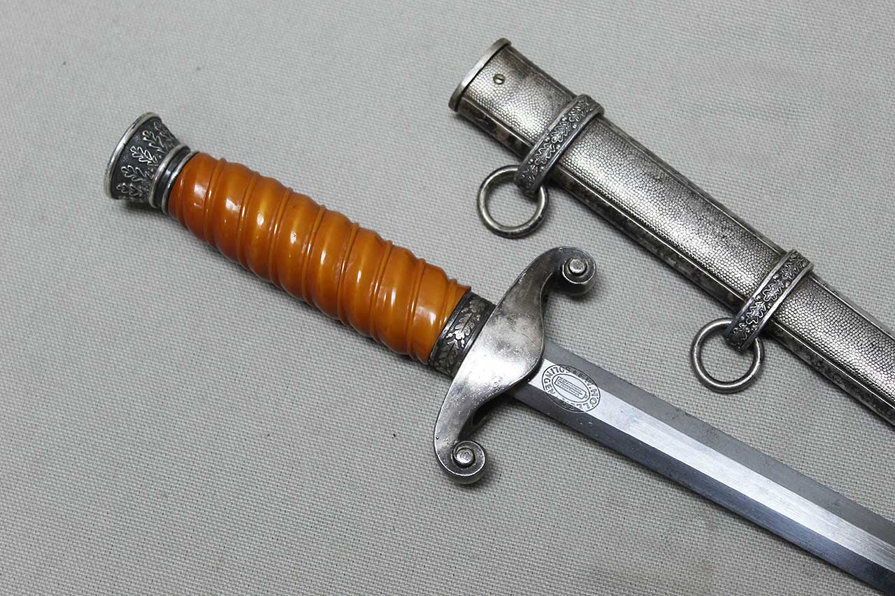 Additional Notes: The WW2 German Army (Heer) officer dagger was first authorized for army personnel to carry in 1935. These daggers were privately purchased items and were part of the officer’s uniform. The design featured a silvered exterior with a white or colored grip, a cross guard depicting a Wehrmacht open-winged eagle clutching a wreathed swaz, and a pommel with a pattern of vertical standing oak leaves and acorns. The scabbard body had two panels of a random pebbled design with two oak leaf and acorn designed bands. Early examples had brass or tombac-based fittings that were quality plated, tapered tang blades, and trylon slant grips. Later examples transitioned to zinc-based fittings, celluloid plaster grips, and were finished in a natural gray metal.