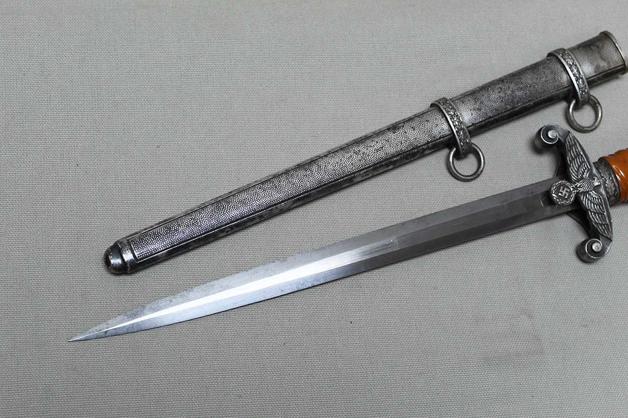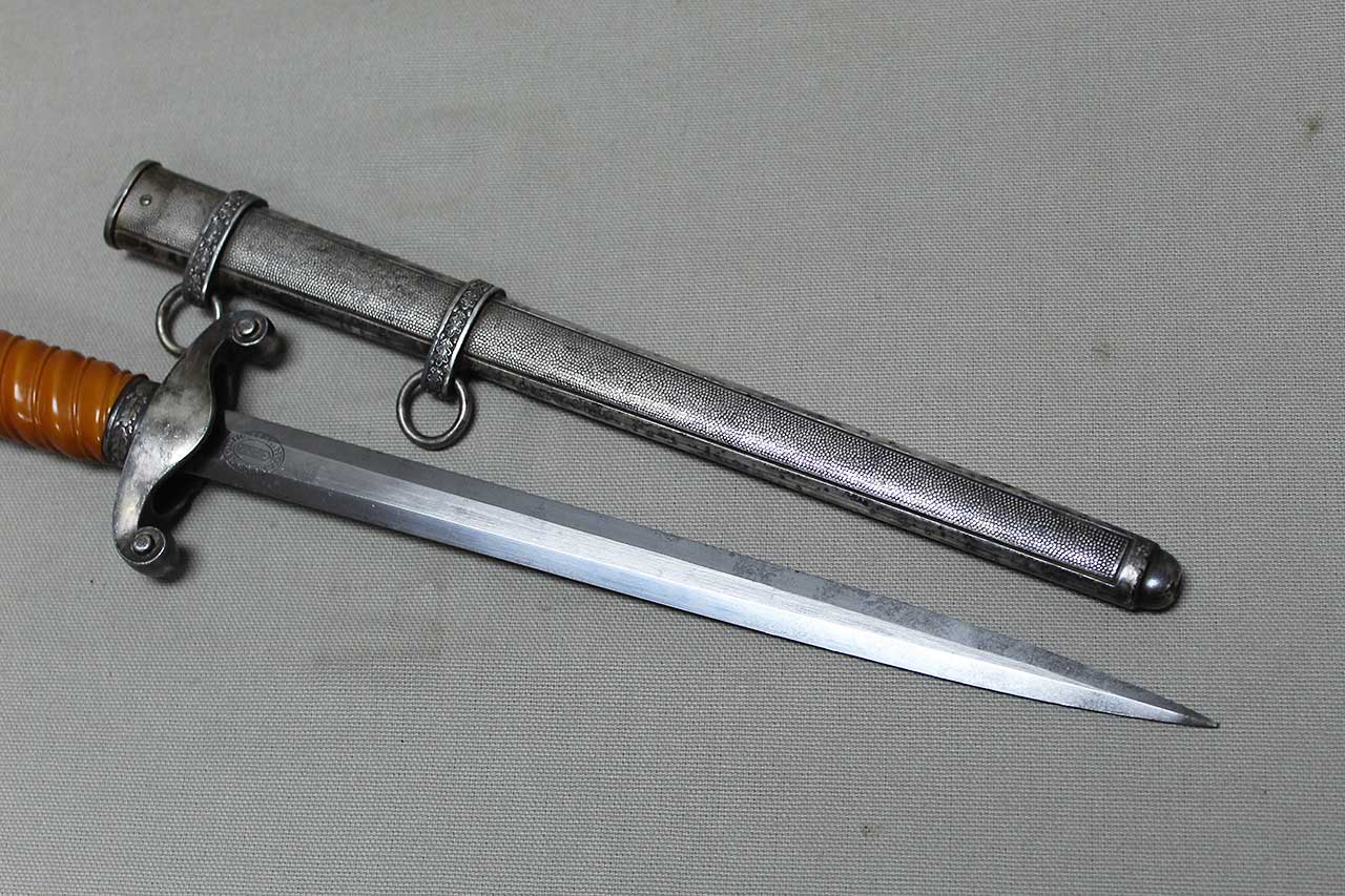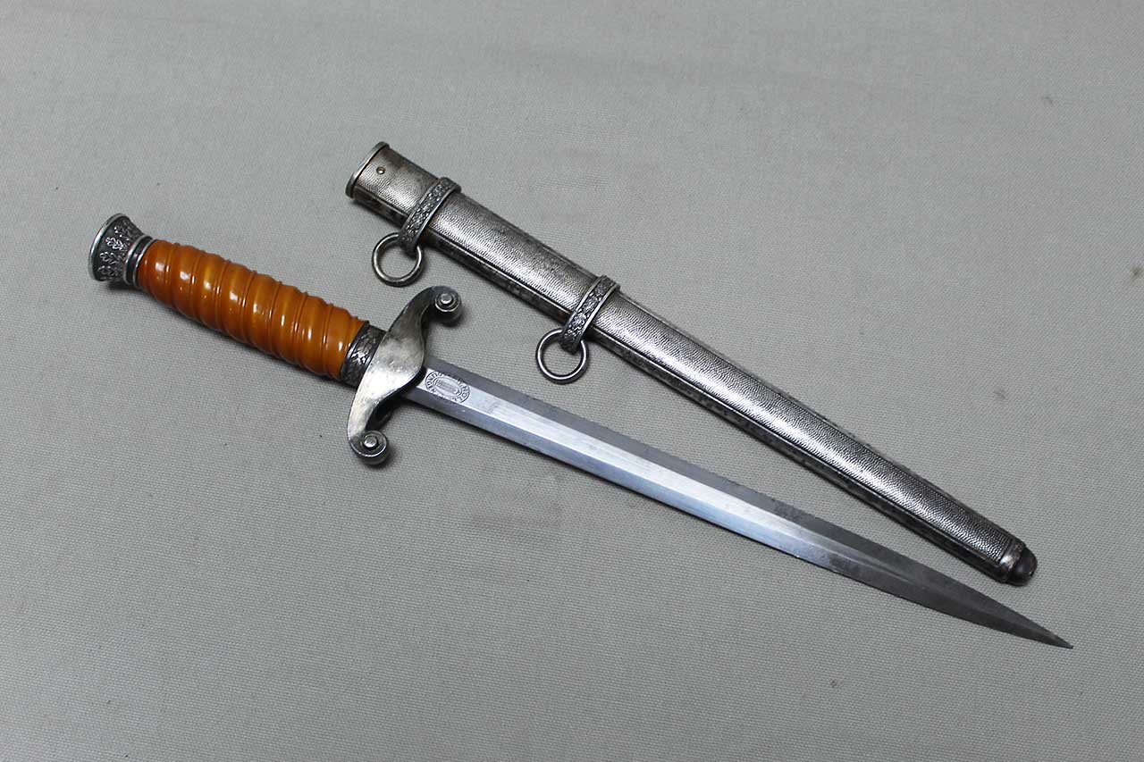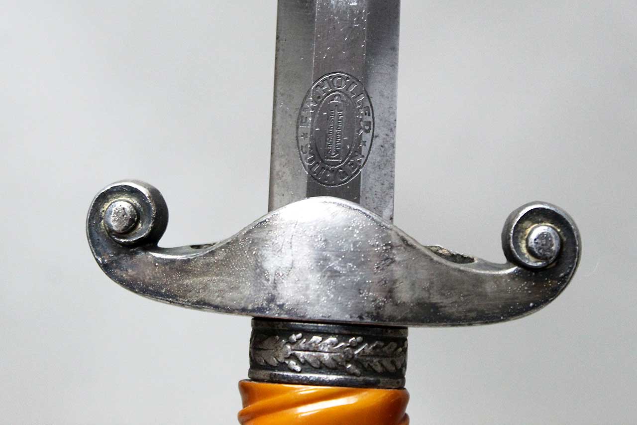 WW2 German Army Officer Dagger. Blade is marker marked with the F.W. Holler Solingen logo. The medium orange color trylon grip is in good overall condition. Blade with some wear and in-and-out marks. Scabbard in decent condition. Dagger fittings, eagle cross guard, and pommel all in good condition. Proper Holler eagle cross guard. Overall, good basic condition.