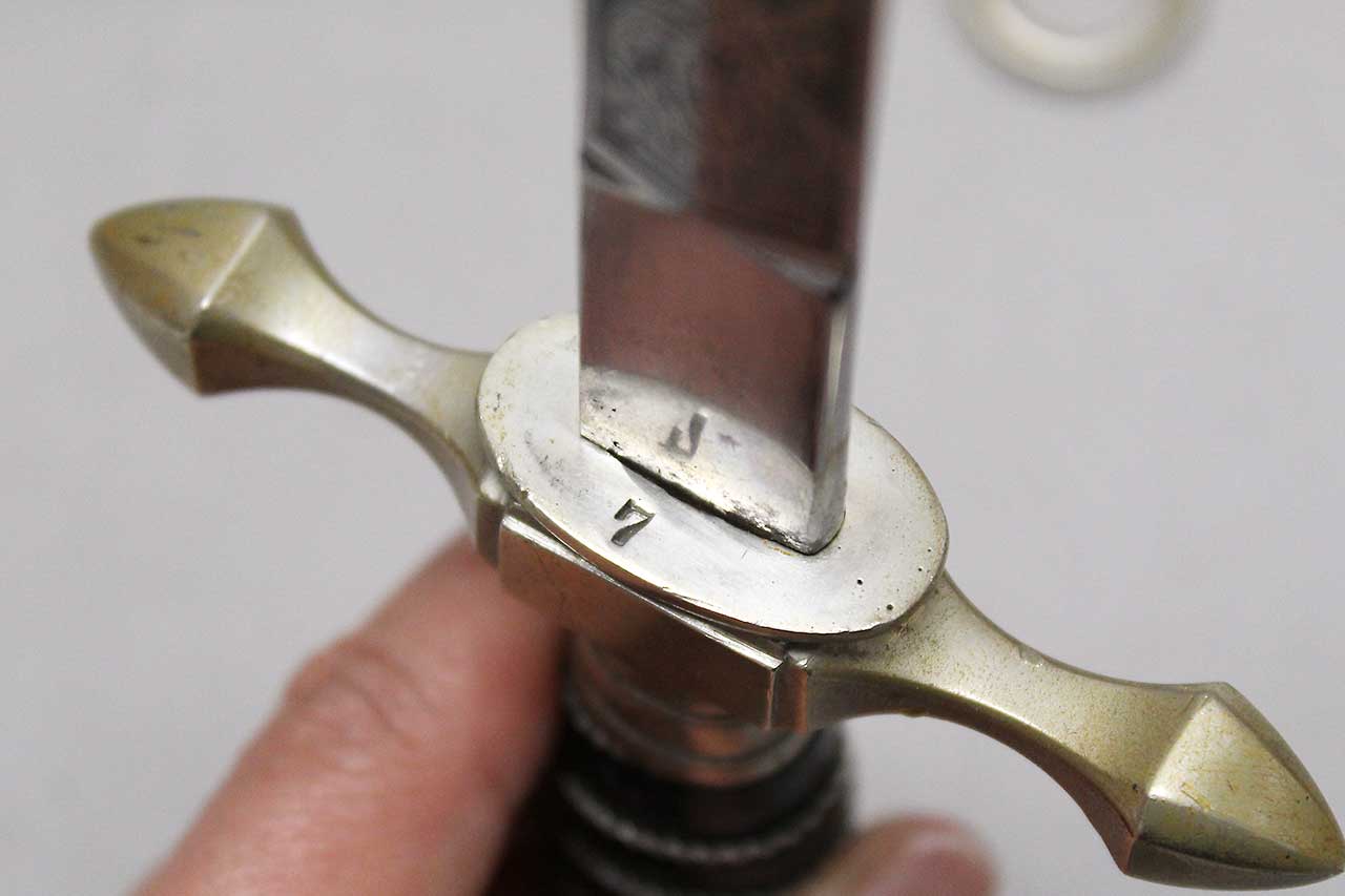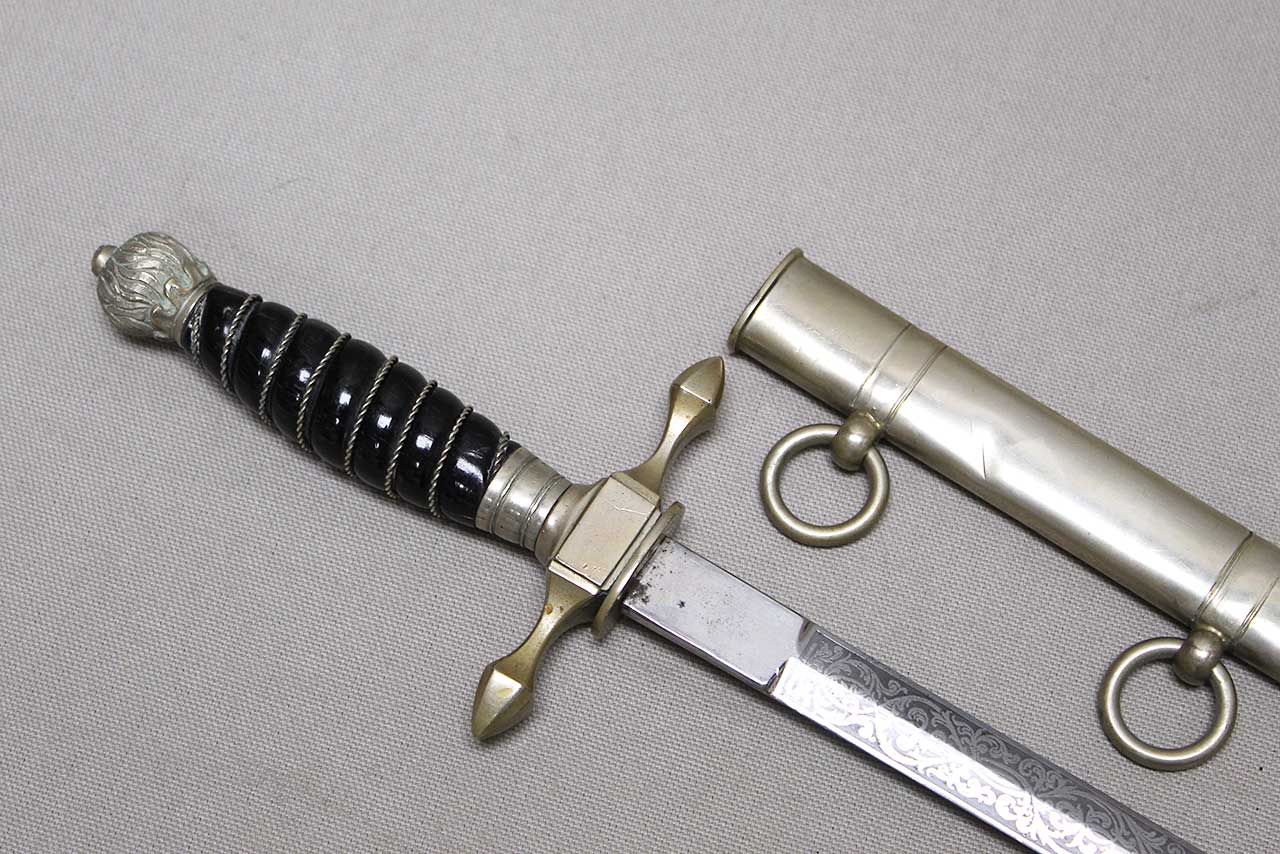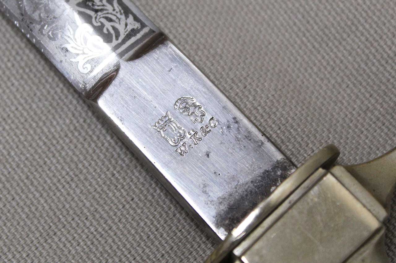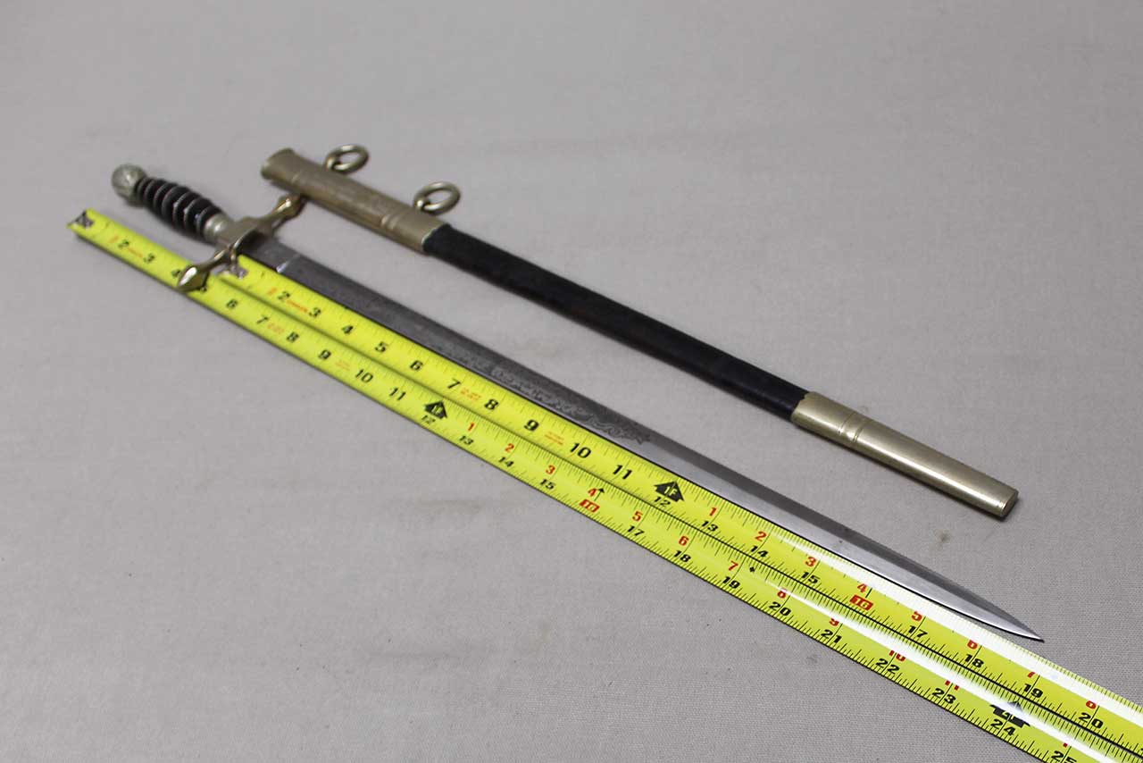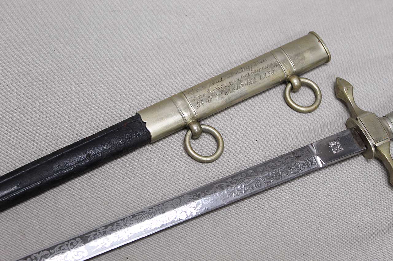 Imperial German Fire Service Dagger. Marker marked W.K. & C. on blade ricasso. The dagger has a nice double etched blade with Fire Service type motif. The grip and nickel silver grip wire in good condition and nickel silver handle fitting also in good condition. Marked “7” under cross guard area. The leather scabbard with nickel silver fittings on scabbard has nice dedication dated 1.9.93 on upper fitting. There is a hit to the back side of the upper scabbard fitting and some surface wear to the leather scabbard portion as well. Approximately 19-inch blade. A hard-to-find Fire Service dagger.