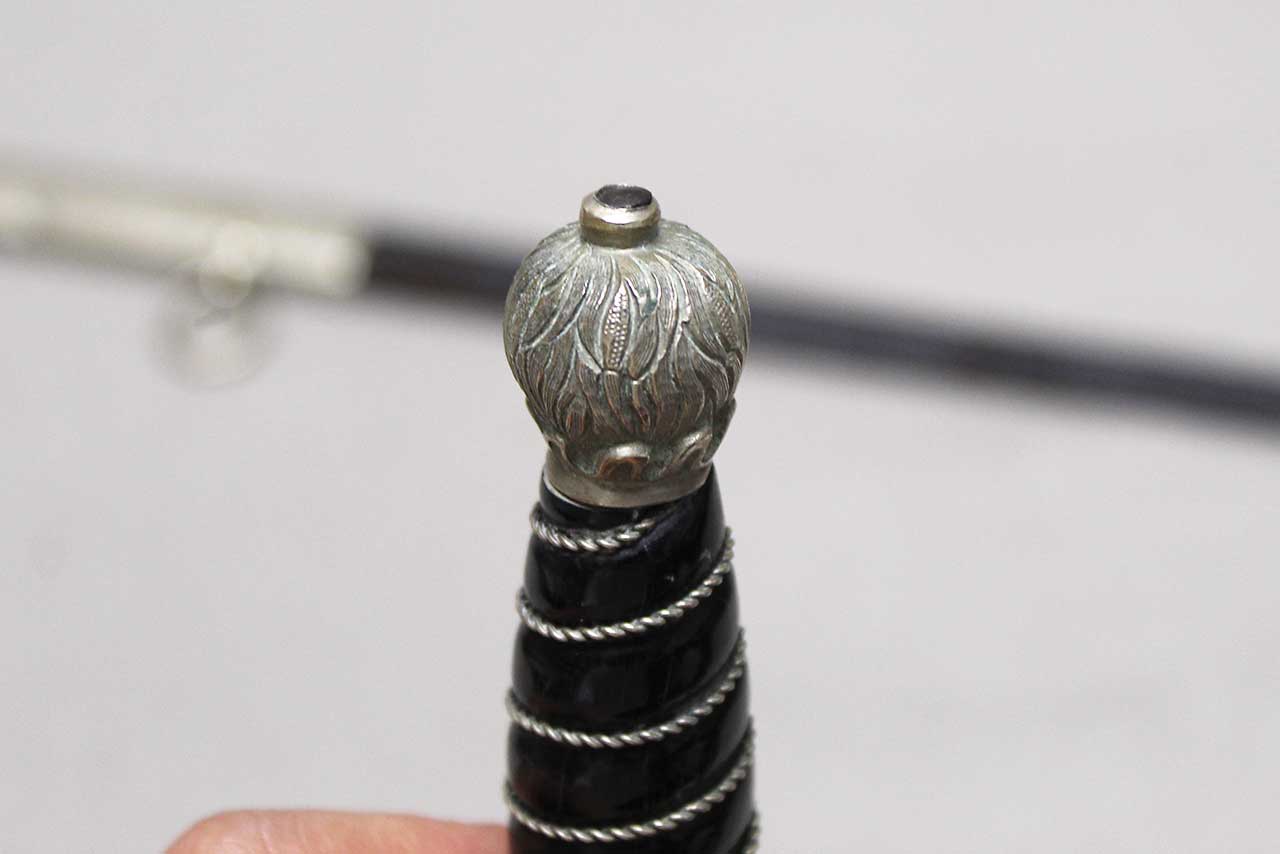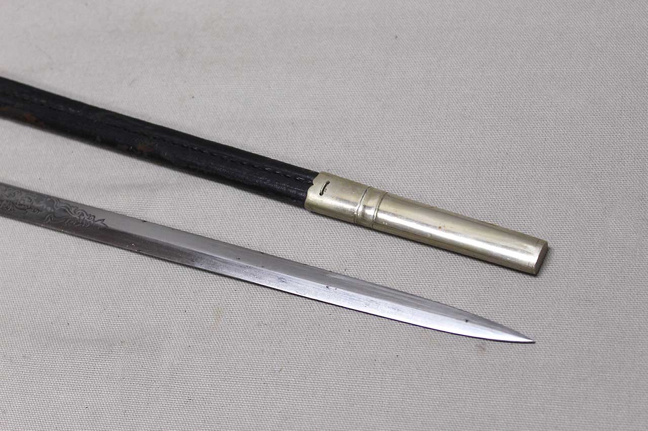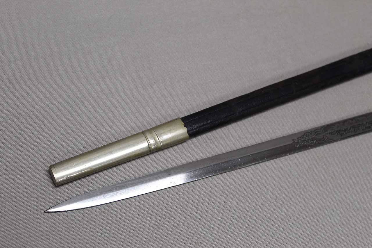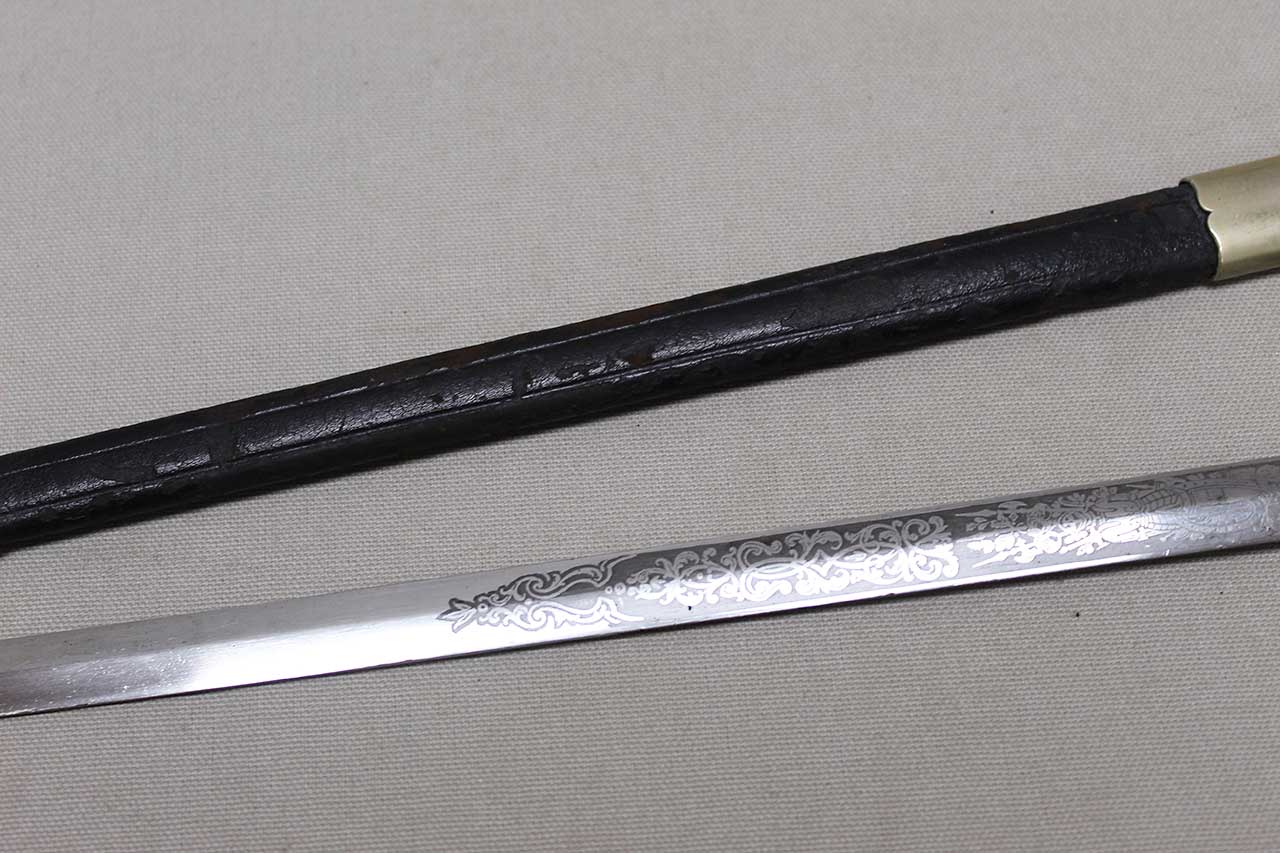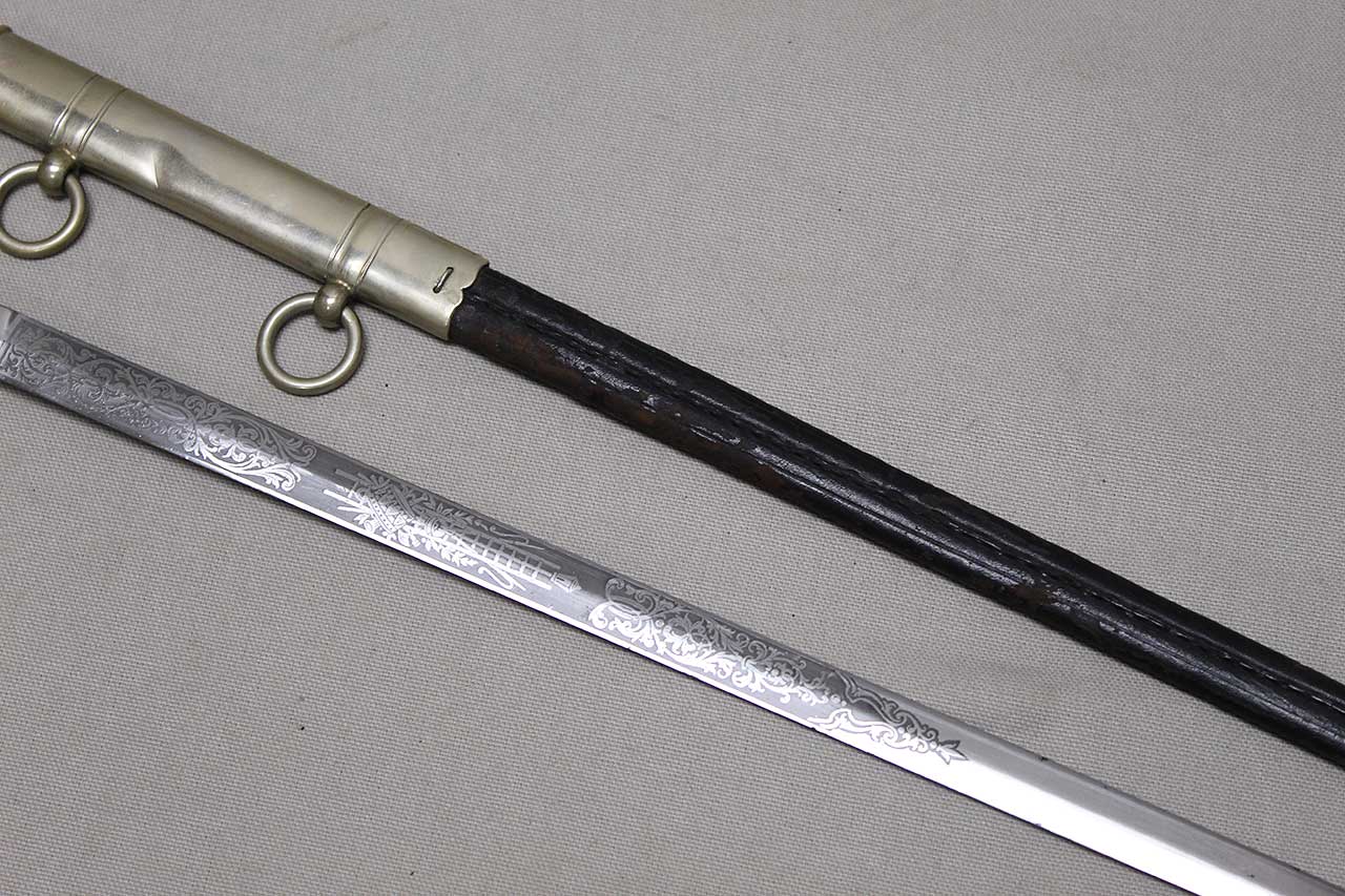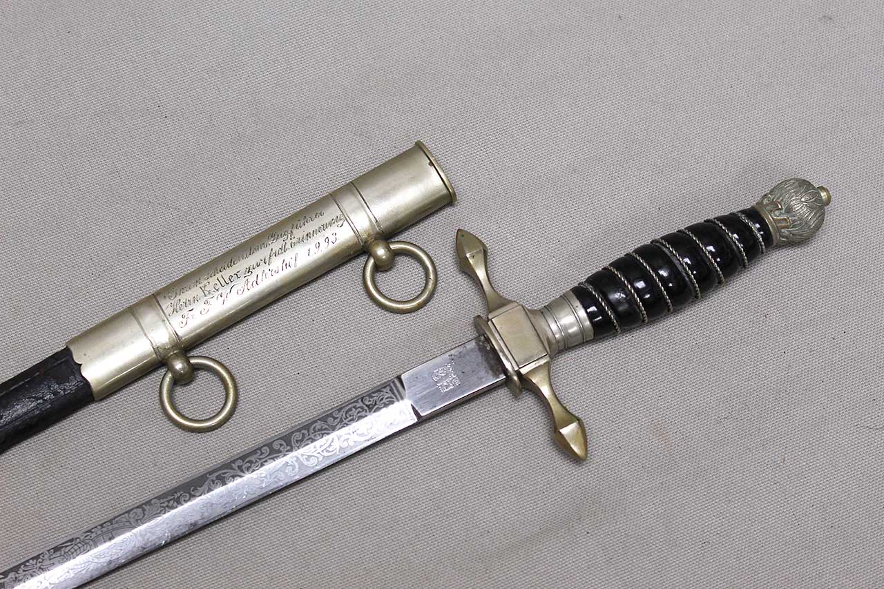 Imperial German Fire Service Dagger. Marker marked W.K. & C. on blade ricasso. The dagger has a nice double etched blade with Fire Service type motif. The grip and nickel silver grip wire in good condition and nickel silver handle fitting also in good condition. Marked “7” under cross guard area. The leather scabbard with nickel silver fittings on scabbard has nice dedication dated 1.9.93 on upper fitting. There is a hit to the back side of the upper scabbard fitting and some surface wear to the leather scabbard portion as well. Approximately 19-inch blade. A hard-to-find Fire Service dagger.