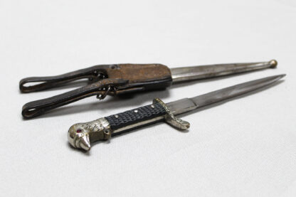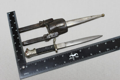 WW2 Royal Romanian Army Officer Dagger with leather hanger. Dagger has eagle head style pommel with red glass eyes. The black bakelite grip is in good condition with 3 rivets holding in place. The lateral ring hole below the eagle’s head is missing the squarish ring that would have attached to a portepee. The nickel-plated blade in overall good condition with some wear spots, no marker marks or logos on blade. Leather hanger/frog is worn, however, overall decent condition. The nickel finished scabbard in nice overall condition. I am not sure if this is German made or Romanian made dagger, however, from what I see from basic design I believe this is a Romanian made dagger. Blade length approximately 5 1/2 inches. Overall length approximately 10 inches.