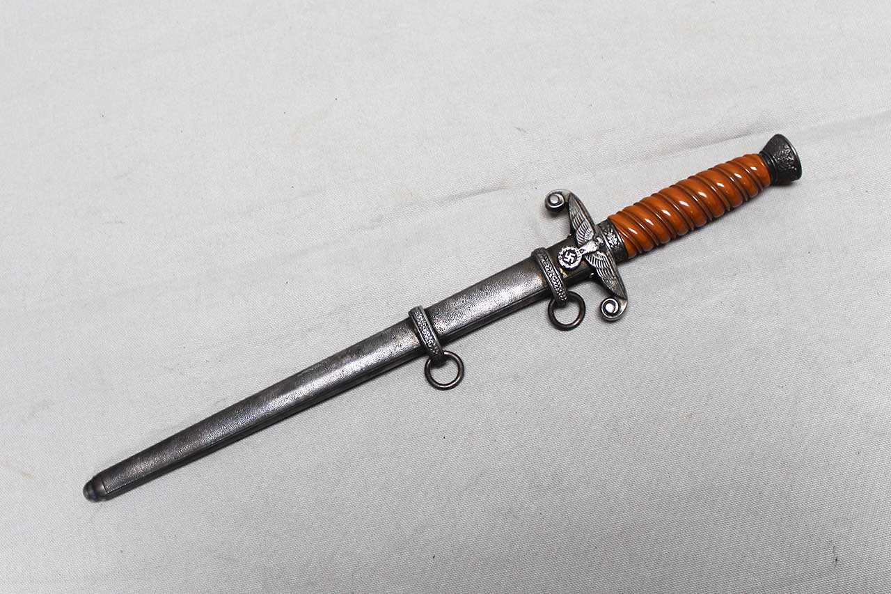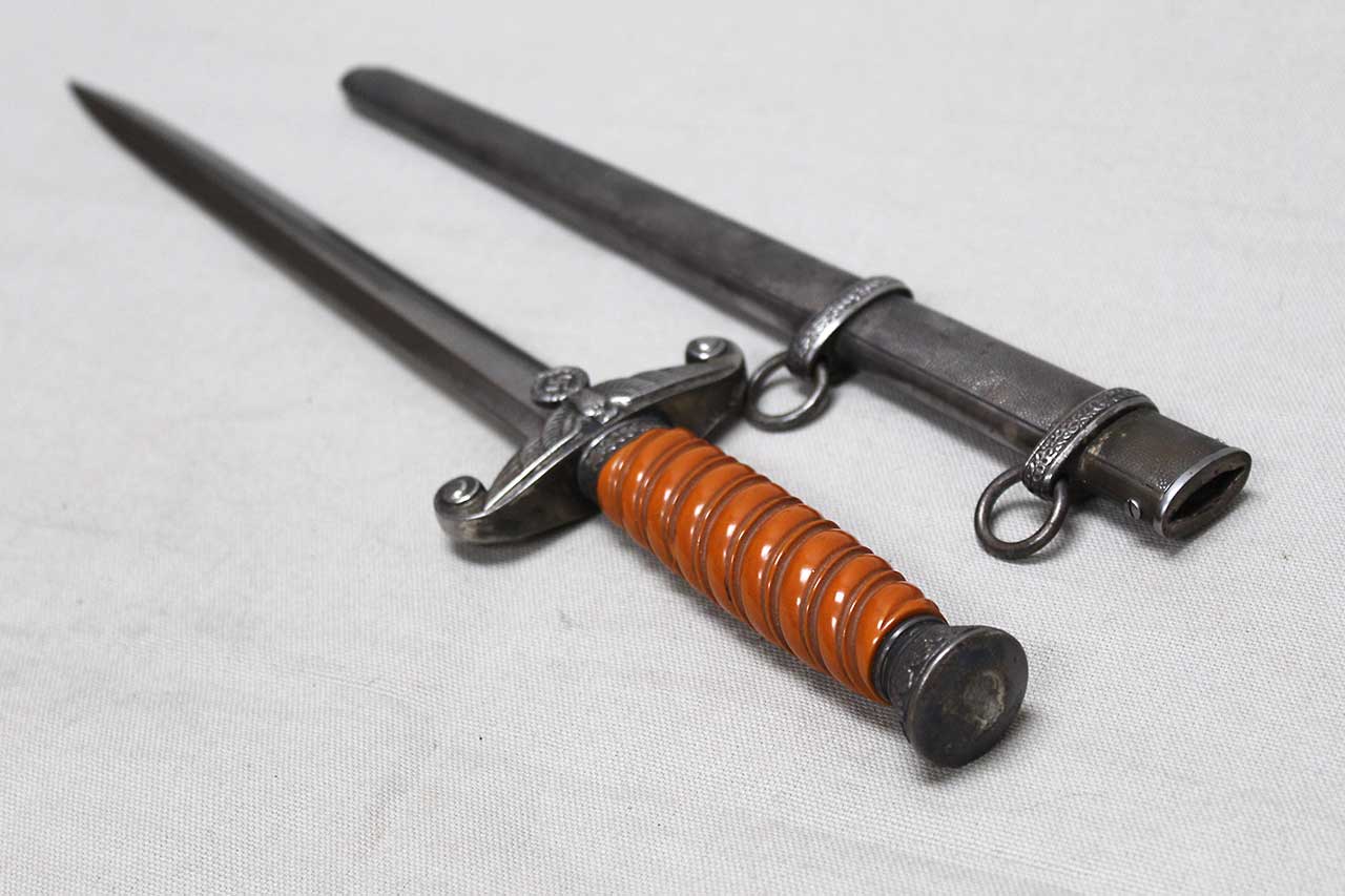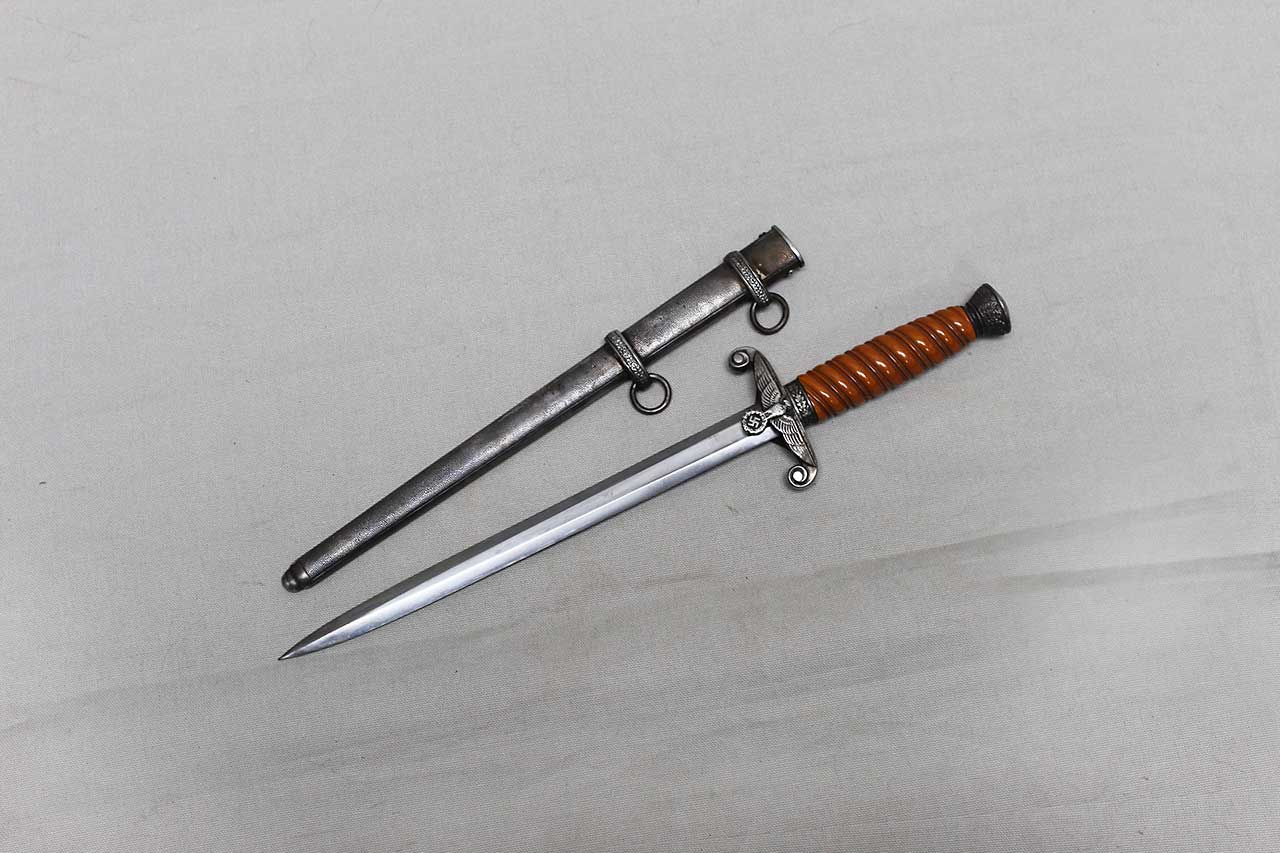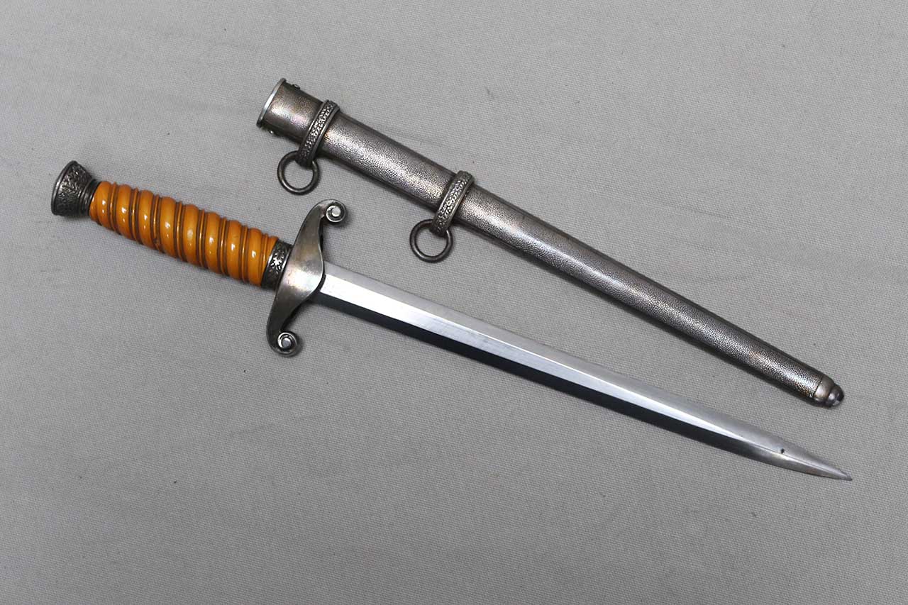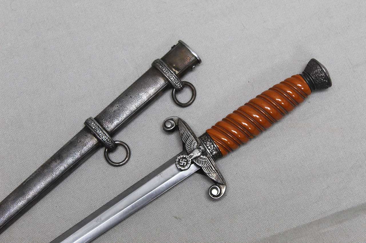 Additional Notes: The WW2 German Army (Heer) officer dagger was first authorized for army personnel to carry in 1935. These daggers were privately purchased items and were part of the officer’s uniform. The design featured a silvered exterior with a white or colored grip, a cross guard depicting a Wehrmacht open-winged eagle clutching a wreathed swaz, and a pommel with a pattern of vertical standing oak leaves and acorns. The scabbard body had two panels of a random pebbled design with two oak leaf and acorn designed bands. Early examples had brass or tombac-based fittings that were quality plated, tapered tang blades, and trylon slant grips. Later examples transitioned to zinc-based fittings, celluloid plaster grips, and were finished in a natural gray metal.