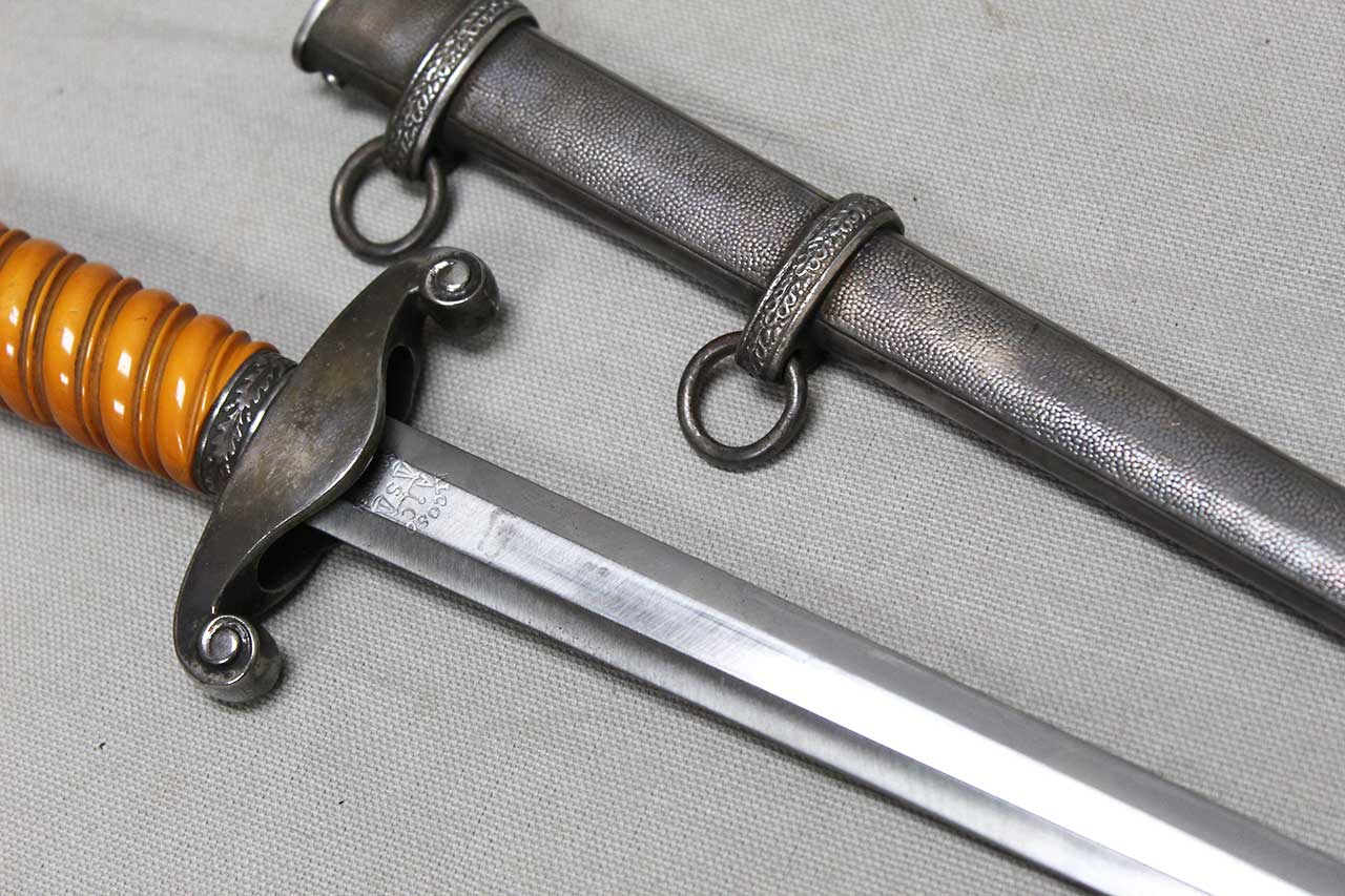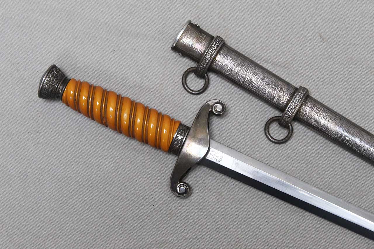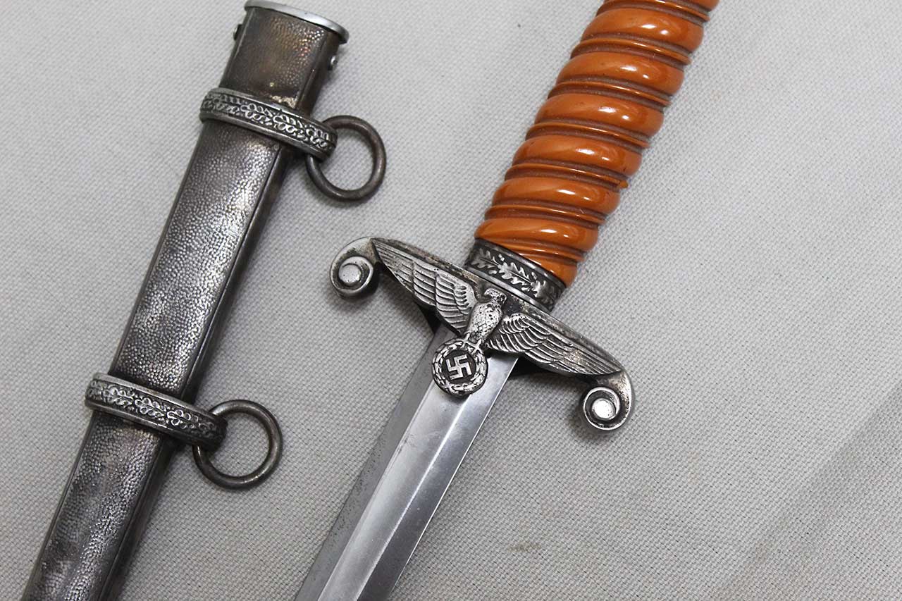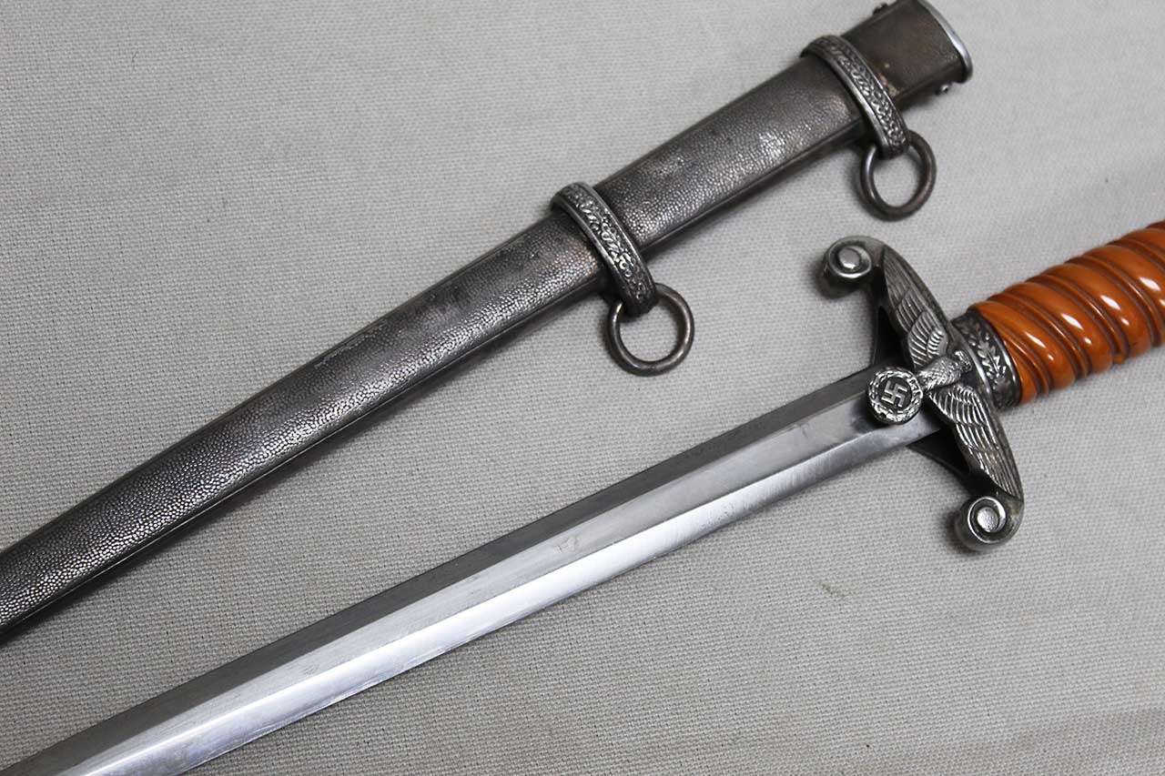 Additional Notes: The WW2 German Army (Heer) officer dagger was first authorized for army personnel to carry in 1935. These daggers were privately purchased items and were part of the officer’s uniform. The design featured a silvered exterior with a white or colored grip, a cross guard depicting a Wehrmacht open-winged eagle clutching a wreathed swaz, and a pommel with a pattern of vertical standing oak leaves and acorns. The scabbard body had two panels of a random pebbled design with two oak leaf and acorn designed bands. Early examples had brass or tombac-based fittings that were quality plated, tapered tang blades, and trylon slant grips. Later examples transitioned to zinc-based fittings, celluloid plaster grips, and were finished in a natural gray metal.