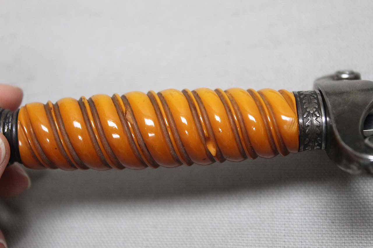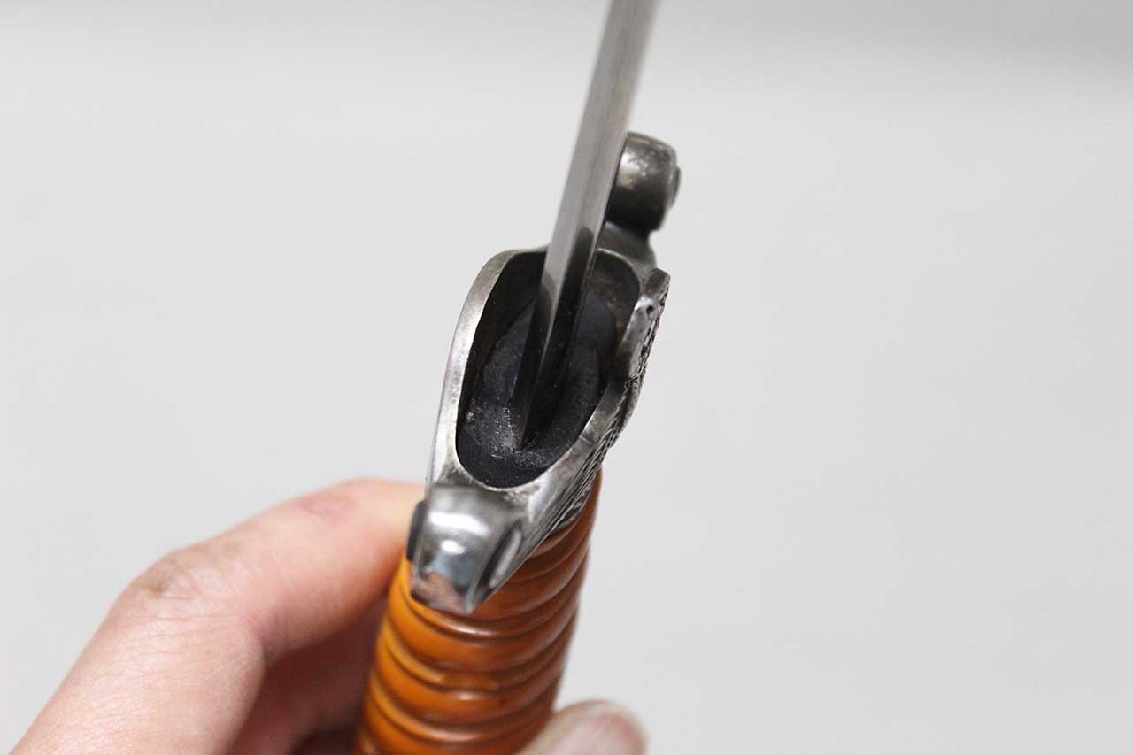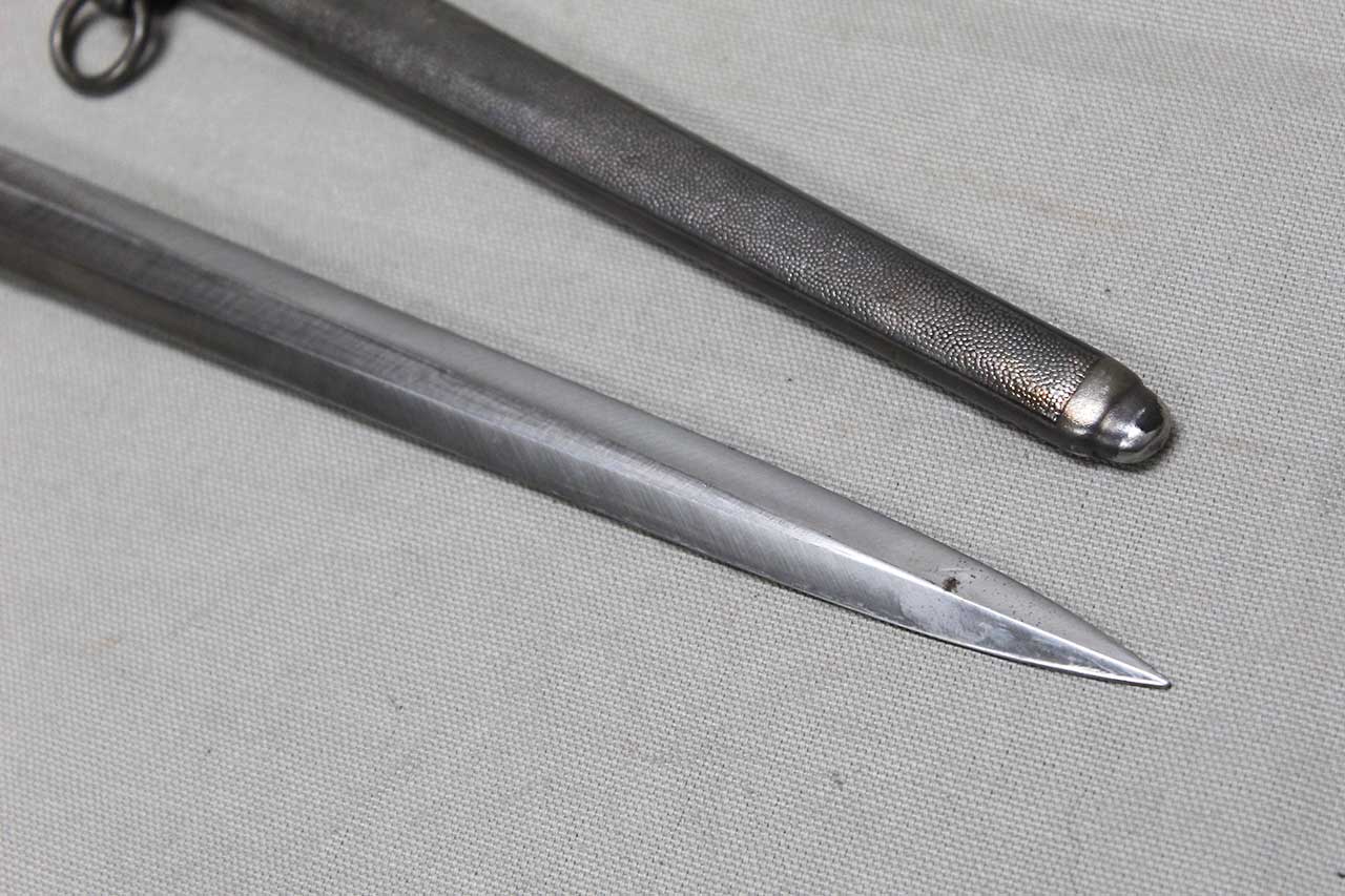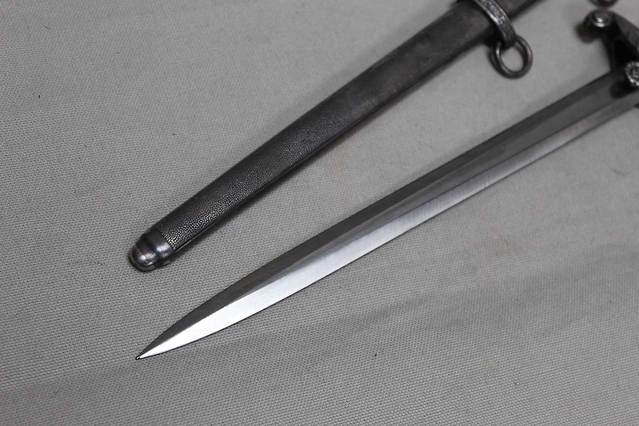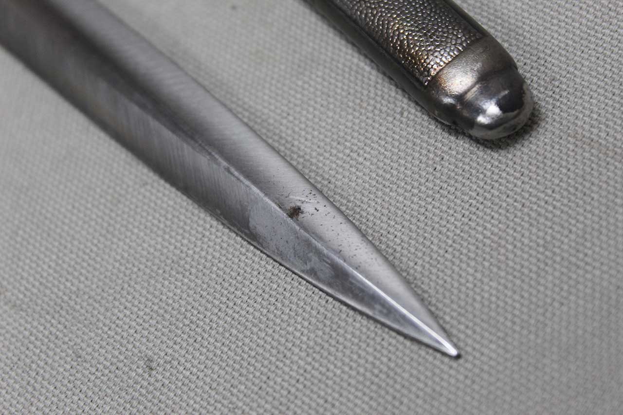 Additional Notes: The WW2 German Army (Heer) officer dagger was first authorized for army personnel to carry in 1935. These daggers were privately purchased items and were part of the officer’s uniform. The design featured a silvered exterior with a white or colored grip, a cross guard depicting a Wehrmacht open-winged eagle clutching a wreathed swaz, and a pommel with a pattern of vertical standing oak leaves and acorns. The scabbard body had two panels of a random pebbled design with two oak leaf and acorn designed bands. Early examples had brass or tombac-based fittings that were quality plated, tapered tang blades, and trylon slant grips. Later examples transitioned to zinc-based fittings, celluloid plaster grips, and were finished in a natural gray metal.