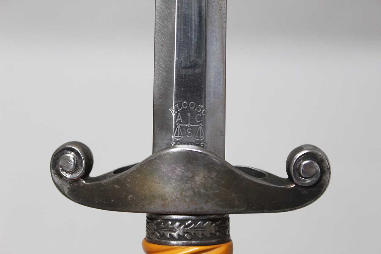 WW2 German Army Officer Dagger. Blade is marker marked with the Alcoso Solingen logo. The medium orange-red color grip is in decent condition with small chips out of side of grip. Blade with some wear, graying, spotting, and in-and-out marks. Scabbard is worn condition. The eagle cross guard is in decent condition with a bit of wear. Overall, worn condition officer dagger.