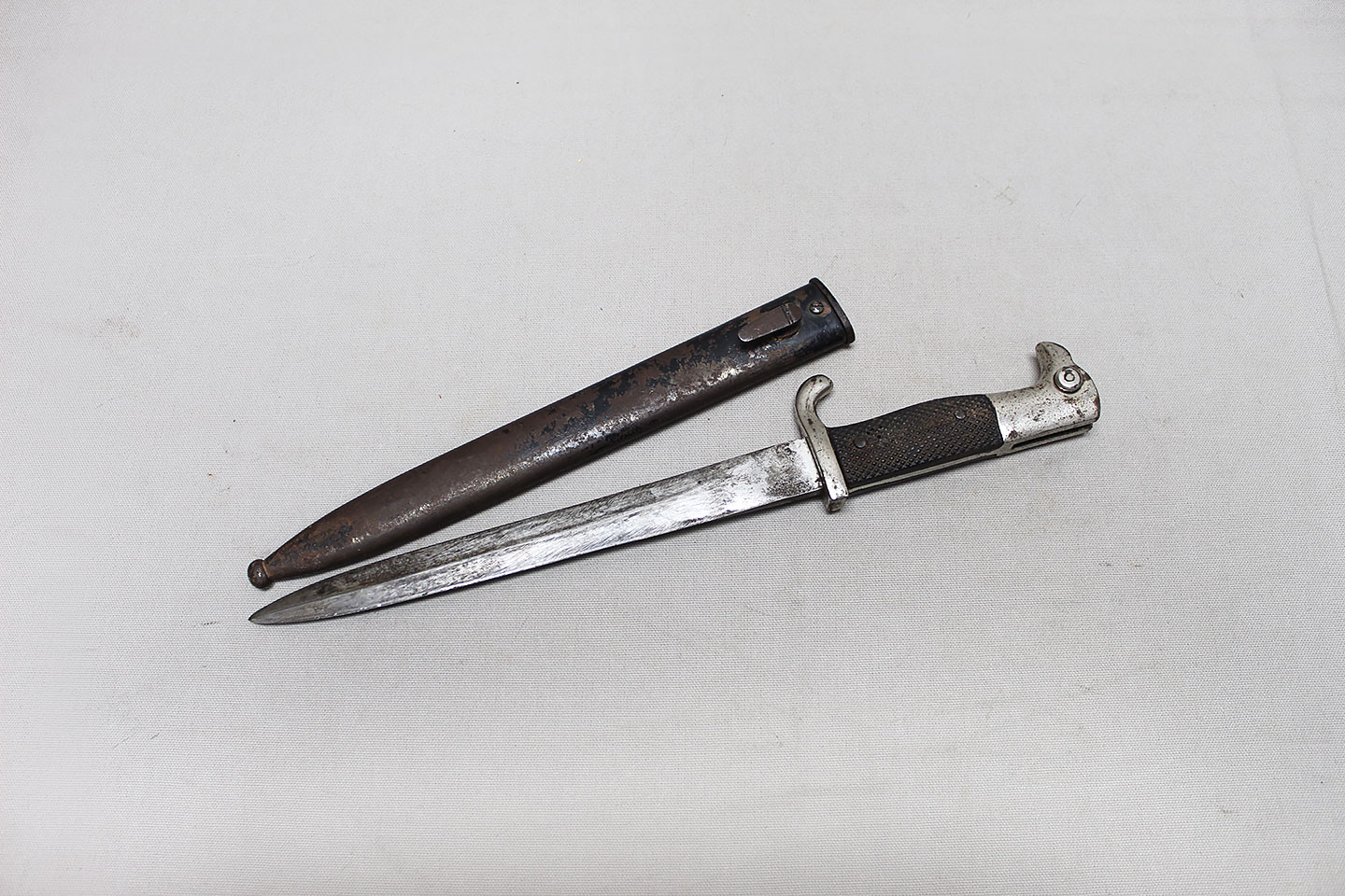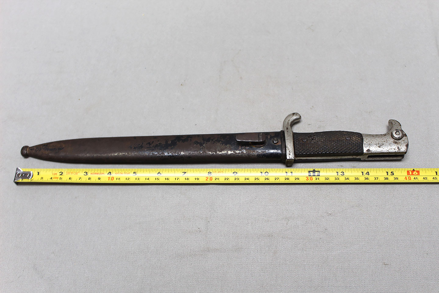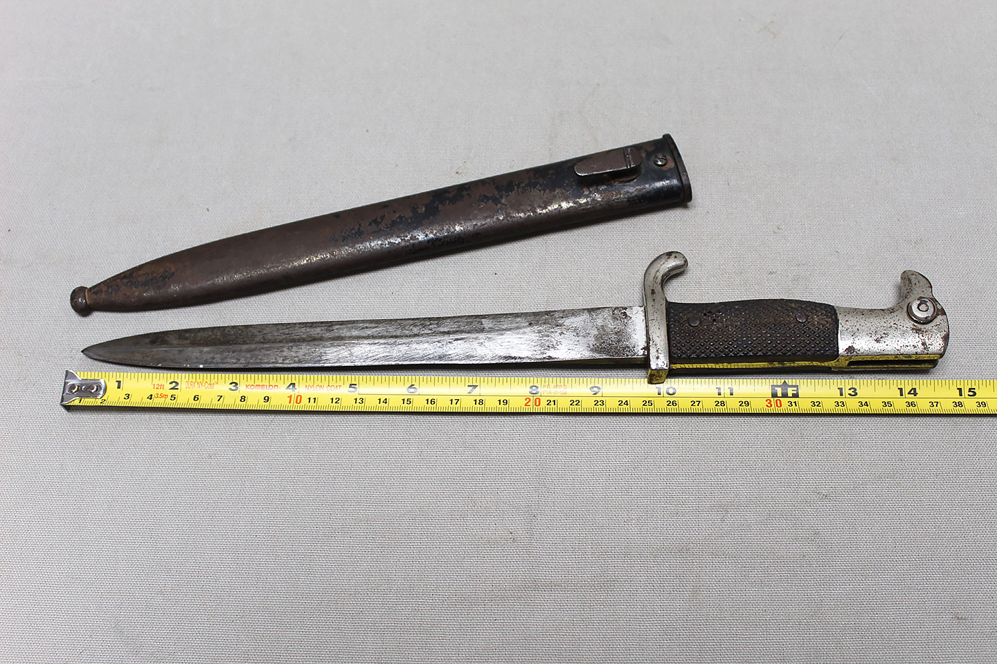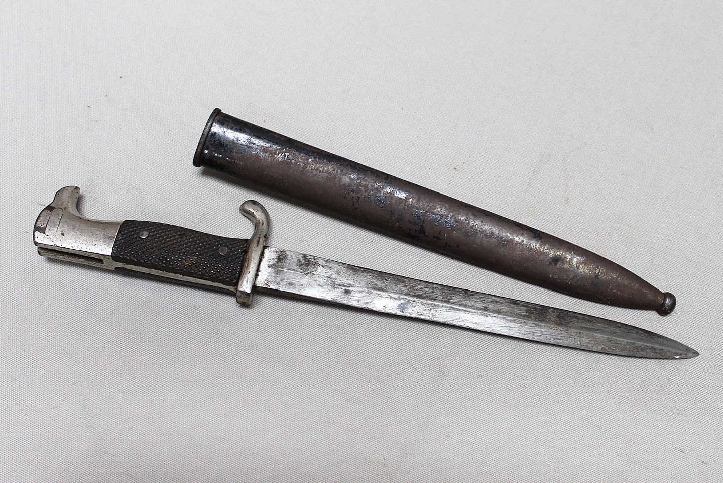 Nice early Pre-WW2 German Army long dress bayonet that is a little wider and has more of a spear style blade. Very worn condition blade is approximately 9 3/4 inches in length. Overall length approximately 15 3/4 inches. Heavily worn condition scabbard.