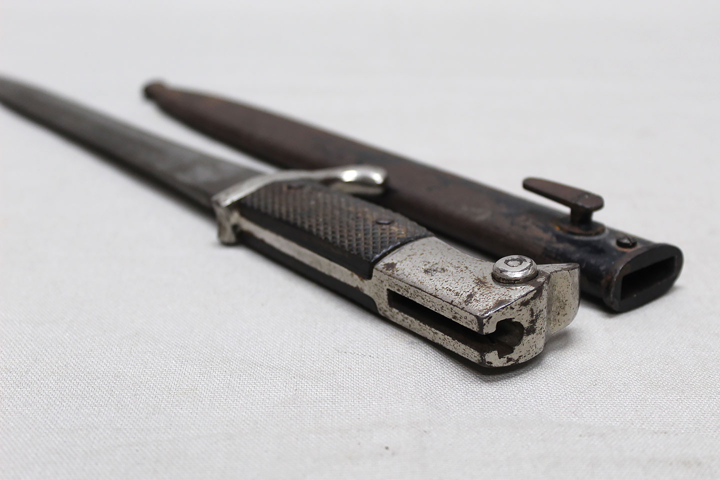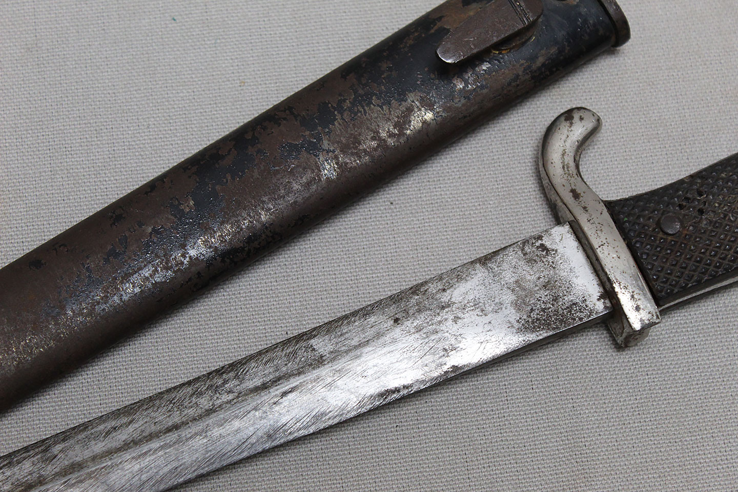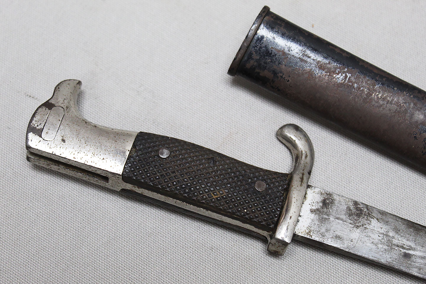 Nice early Pre-WW2 German Army long dress bayonet that is a little wider and has more of a spear style blade. Very worn condition blade is approximately 9 3/4 inches in length. Overall length approximately 15 3/4 inches. Heavily worn condition scabbard.
