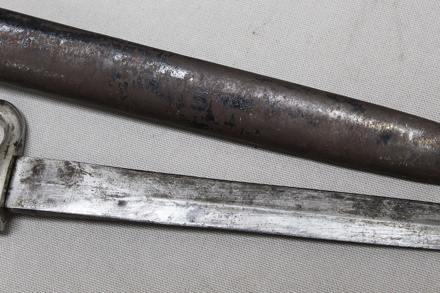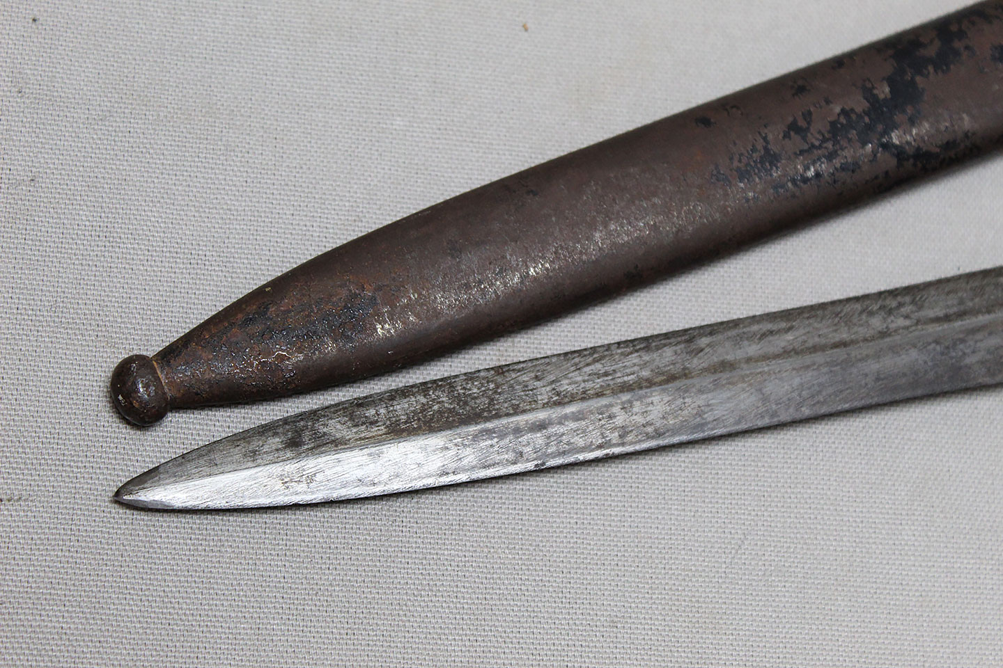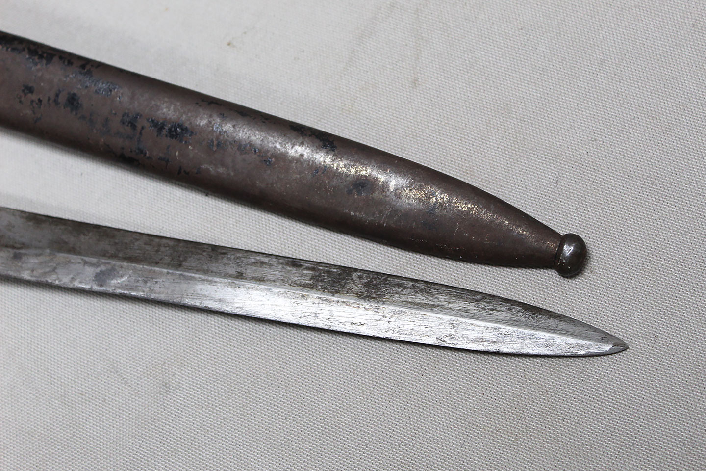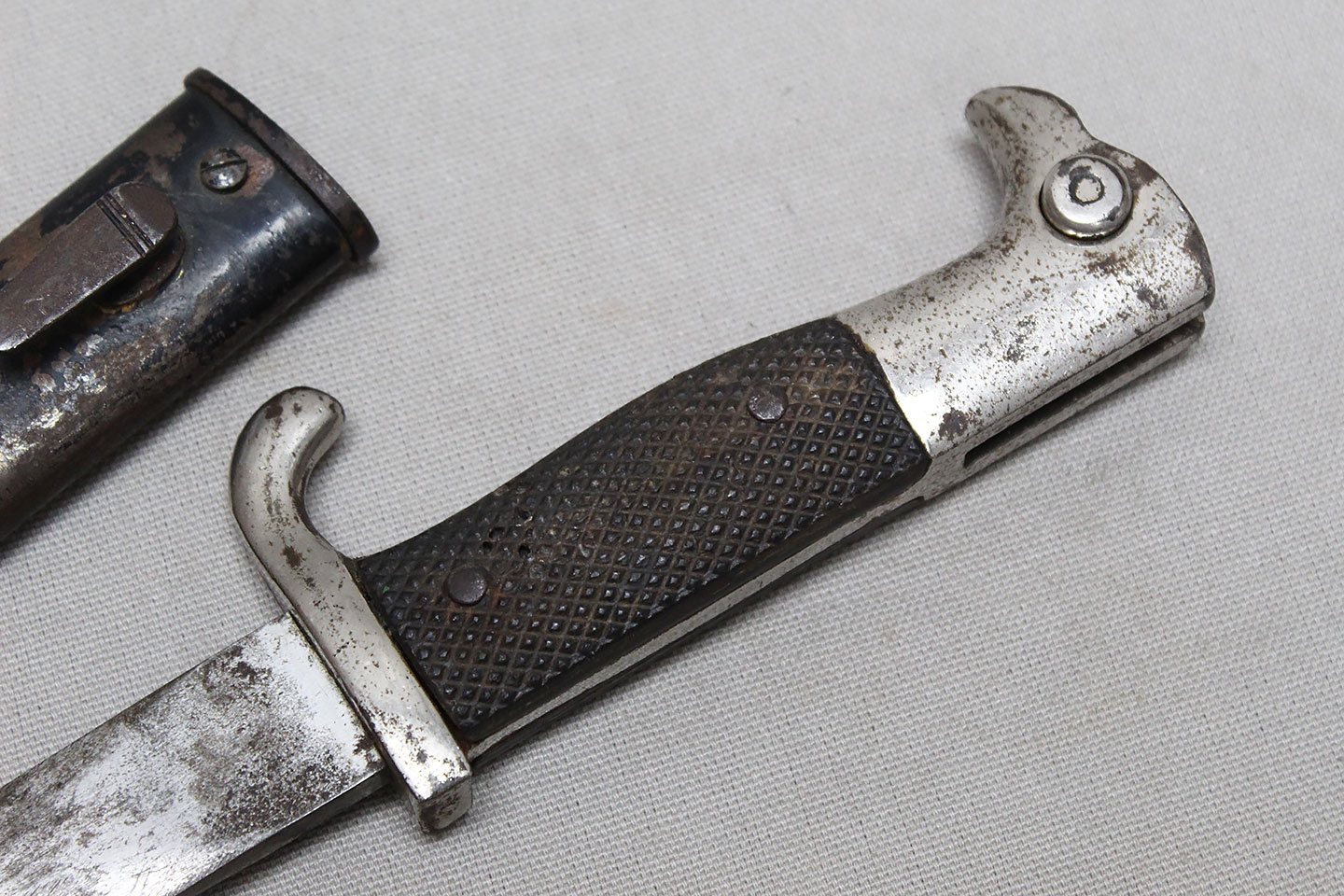 Nice early Pre-WW2 German Army long dress bayonet that is a little wider and has more of a spear style blade. Very worn condition blade is approximately 9 3/4 inches in length. Overall length approximately 15 3/4 inches. Heavily worn condition scabbard.