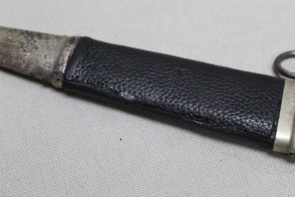 WW2 German RLB (Reichsluftschutzbund) 2nd Model Leader’s (Officer) Dagger. Blade is in very heavily worn condition with a lot of graying, spotting, and heavy wear and edge nick on portion of blade. I do not see any marker logos on blade. Blade still has blue leather washer. A lot of wear to silver-plated cross guard, hilt, and scabbard fittings (especially the lower scabbard fitting with a lot of heavy wear and corrosion damage). Dark blue Moroccan leather on handle and scabbard. The scabbard leather is a little “puffy” not sure if from improper storage or is the leather was redone on the scabbard, also, missing scabbard screw in top section of scabbard. The grip has a 2nd pattern RLB sunburst swaz emblem with a lot of enamel chipping and wear. The blade length is approximately 9 1/4 inches (maybe shortened a little bit). Overall length approximately 14 inches. Overall, a very heavily worn condition RLB Leaders dagger that was most likely improperly stored for quite a while.