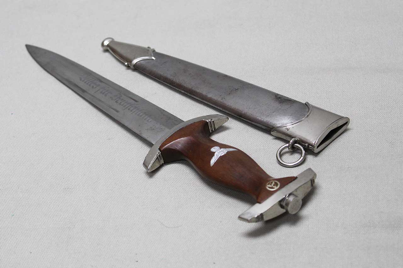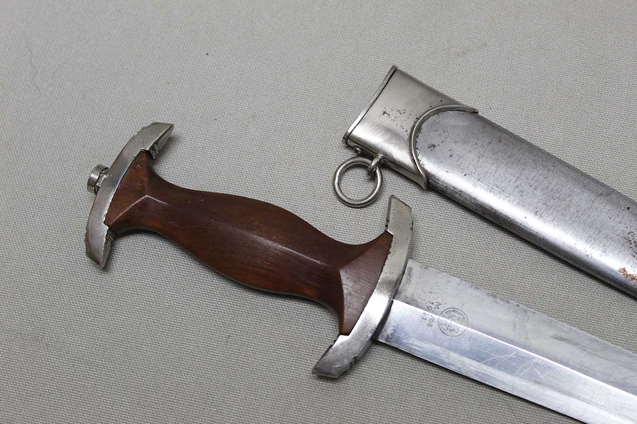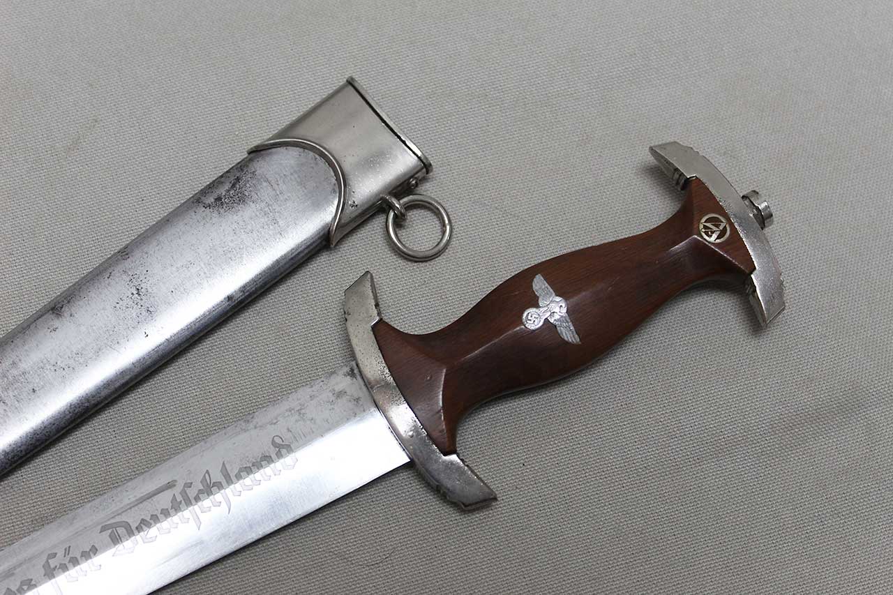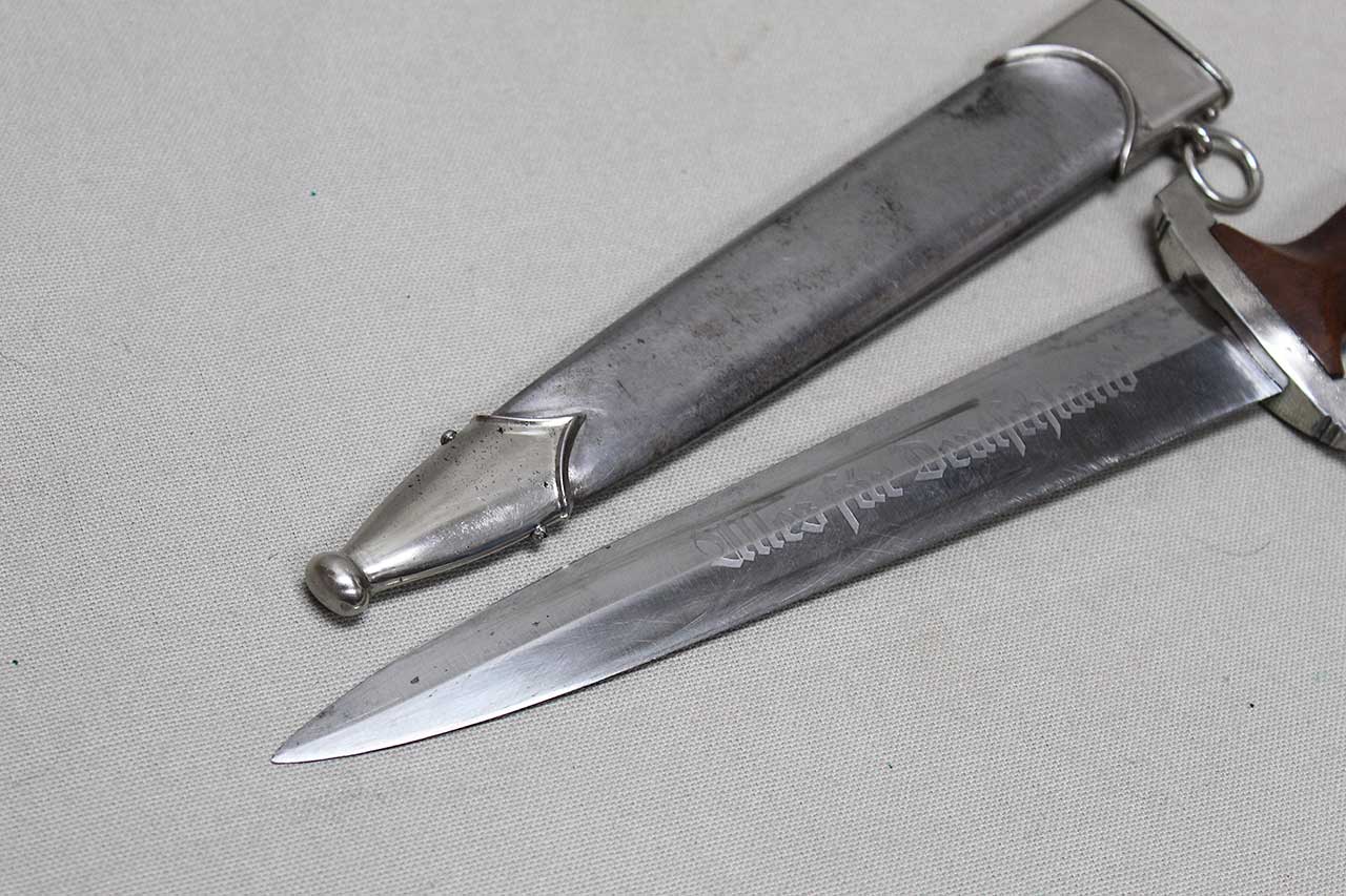 WW2 German SA Dagger. Blade marker marked RZM M7/68 1941 (for the maker of Tigerwerk Lauterjung & Co., Solingen and dated 1941) on one side and with acid etched “Alles für Deutschland” motto on other side of blade. Blade in very heavily worn condition with a lot of graying, spotting, scratches, and in-and-out marks. Also, blade was poorly sharpened. Plated grip fittings with a lot of wear. Hardwood handle has some wear to the handle. Scabbard paint is all worn away, rubbed off scabbard. One scabbard screw missing in top throat section and scabbard ball in decent shape. A very heavily worn condition dagger.