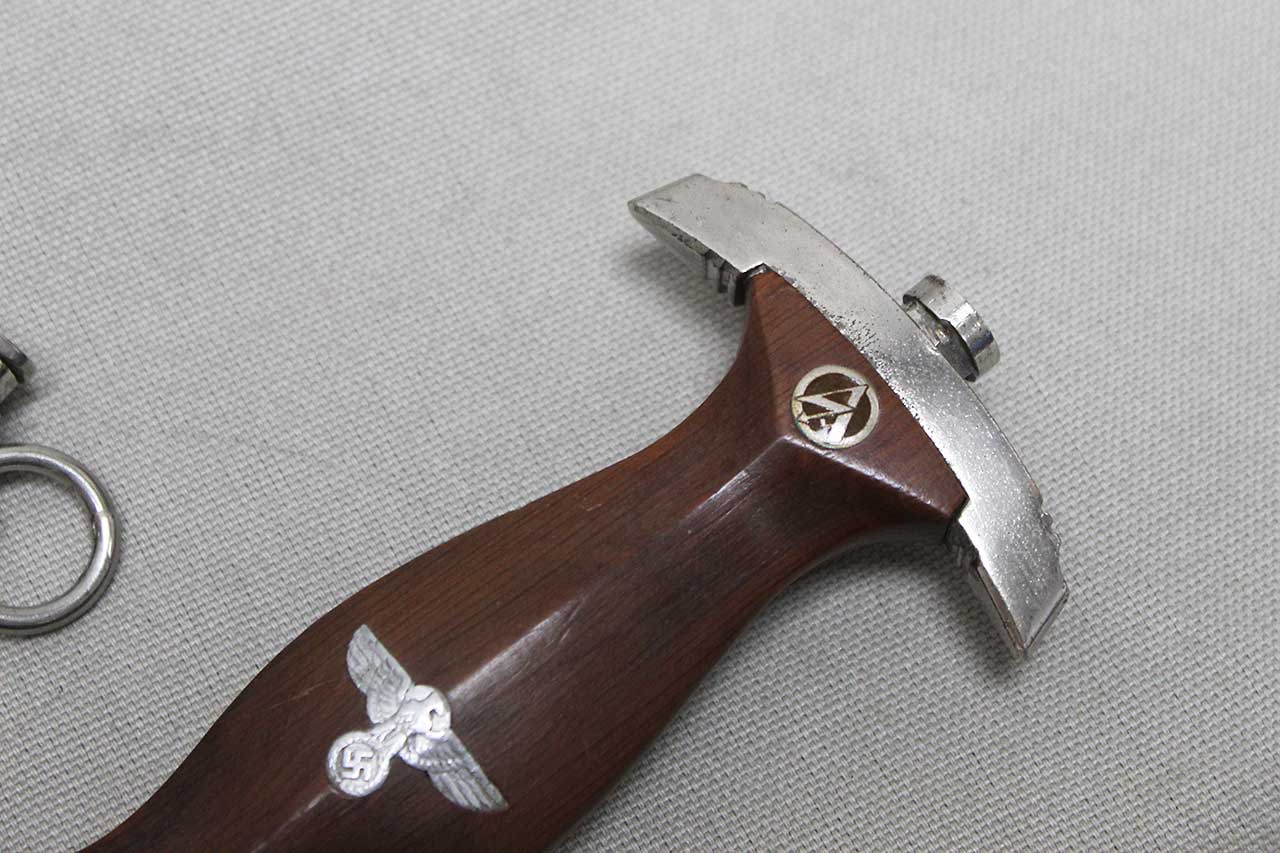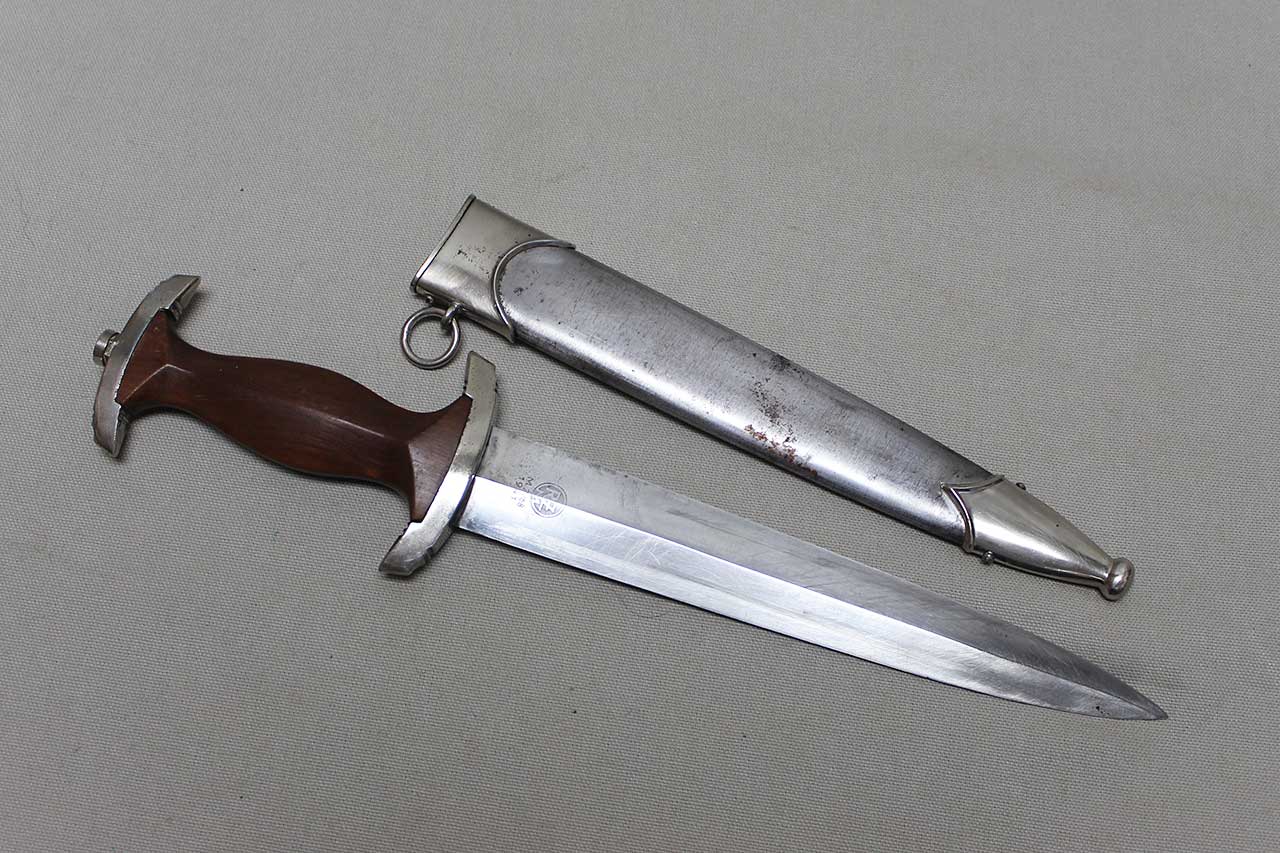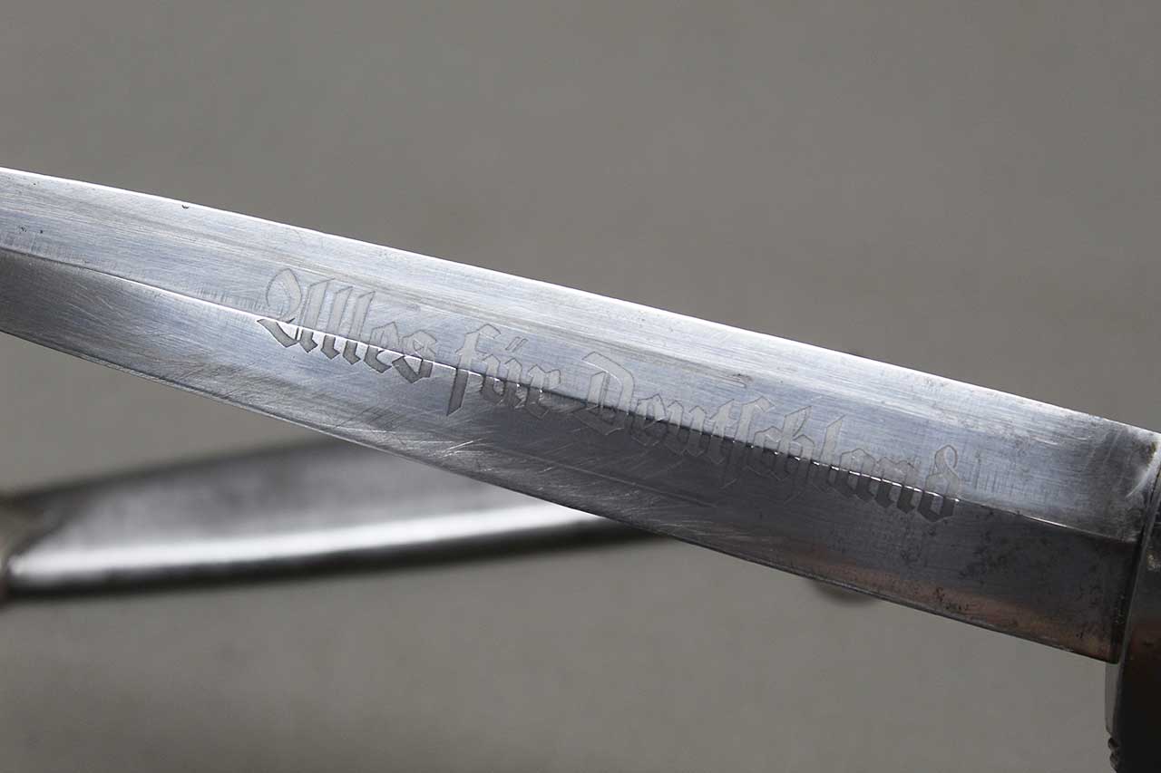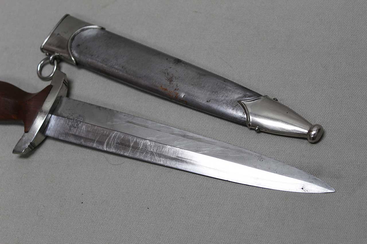 WW2 German SA Dagger. Blade marker marked RZM M7/68 1941 (for the maker of Tigerwerk Lauterjung & Co., Solingen and dated 1941) on one side and with acid etched “Alles für Deutschland” motto on other side of blade. Blade in very heavily worn condition with a lot of graying, spotting, scratches, and in-and-out marks. Also, blade was poorly sharpened. Plated grip fittings with a lot of wear. Hardwood handle has some wear to the handle. Scabbard paint is all worn away, rubbed off scabbard. One scabbard screw missing in top throat section and scabbard ball in decent shape. A very heavily worn condition dagger.