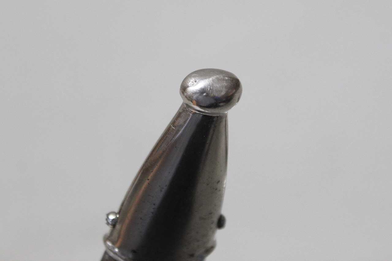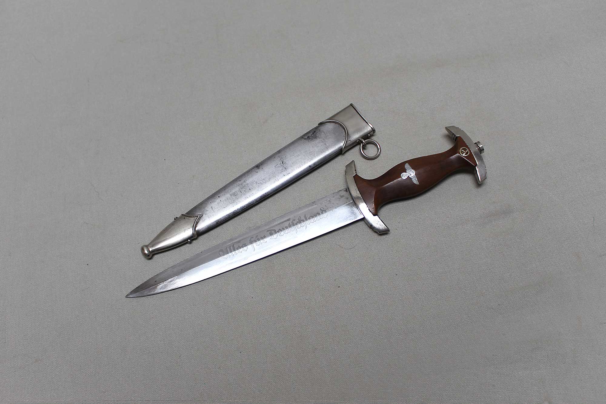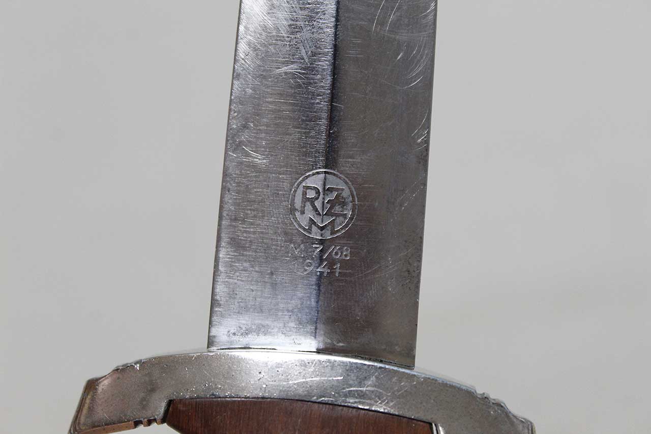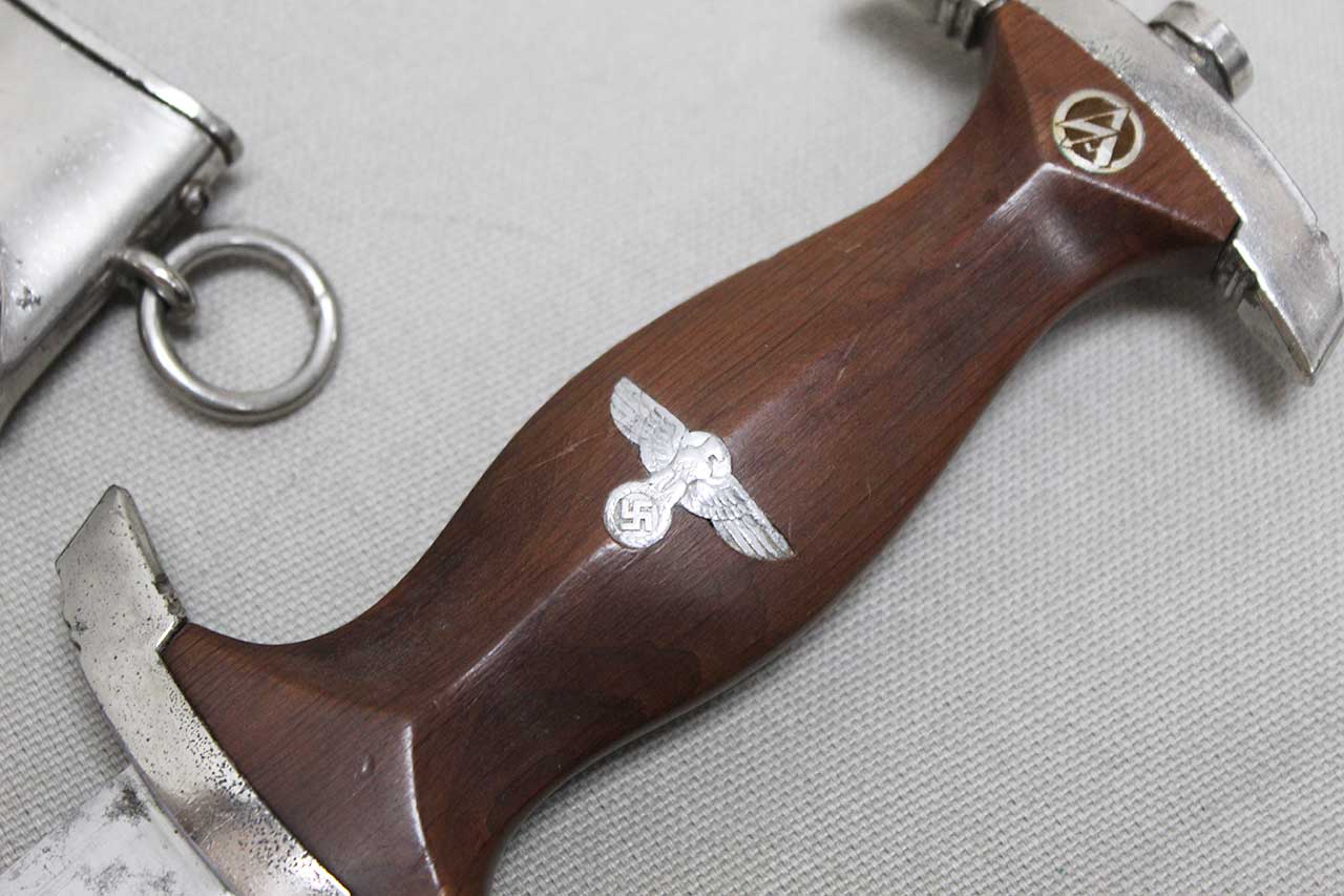 WW2 German SA Dagger. Blade marker marked RZM M7/68 1941 (for the maker of Tigerwerk Lauterjung & Co., Solingen and dated 1941) on one side and with acid etched “Alles für Deutschland” motto on other side of blade. Blade in very heavily worn condition with a lot of graying, spotting, scratches, and in-and-out marks. Also, blade was poorly sharpened. Plated grip fittings with a lot of wear. Hardwood handle has some wear to the handle. Scabbard paint is all worn away, rubbed off scabbard. One scabbard screw missing in top throat section and scabbard ball in decent shape. A very heavily worn condition dagger.