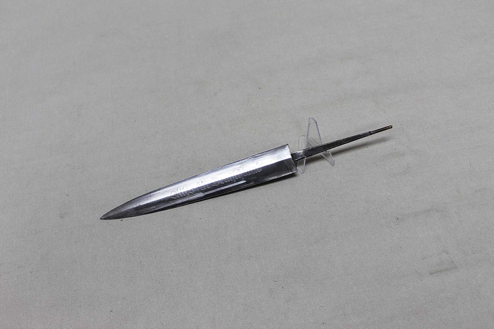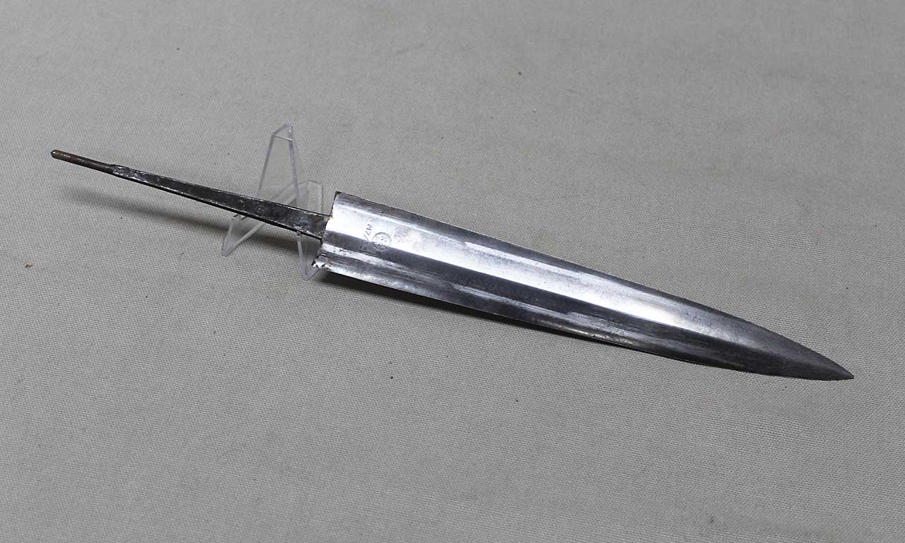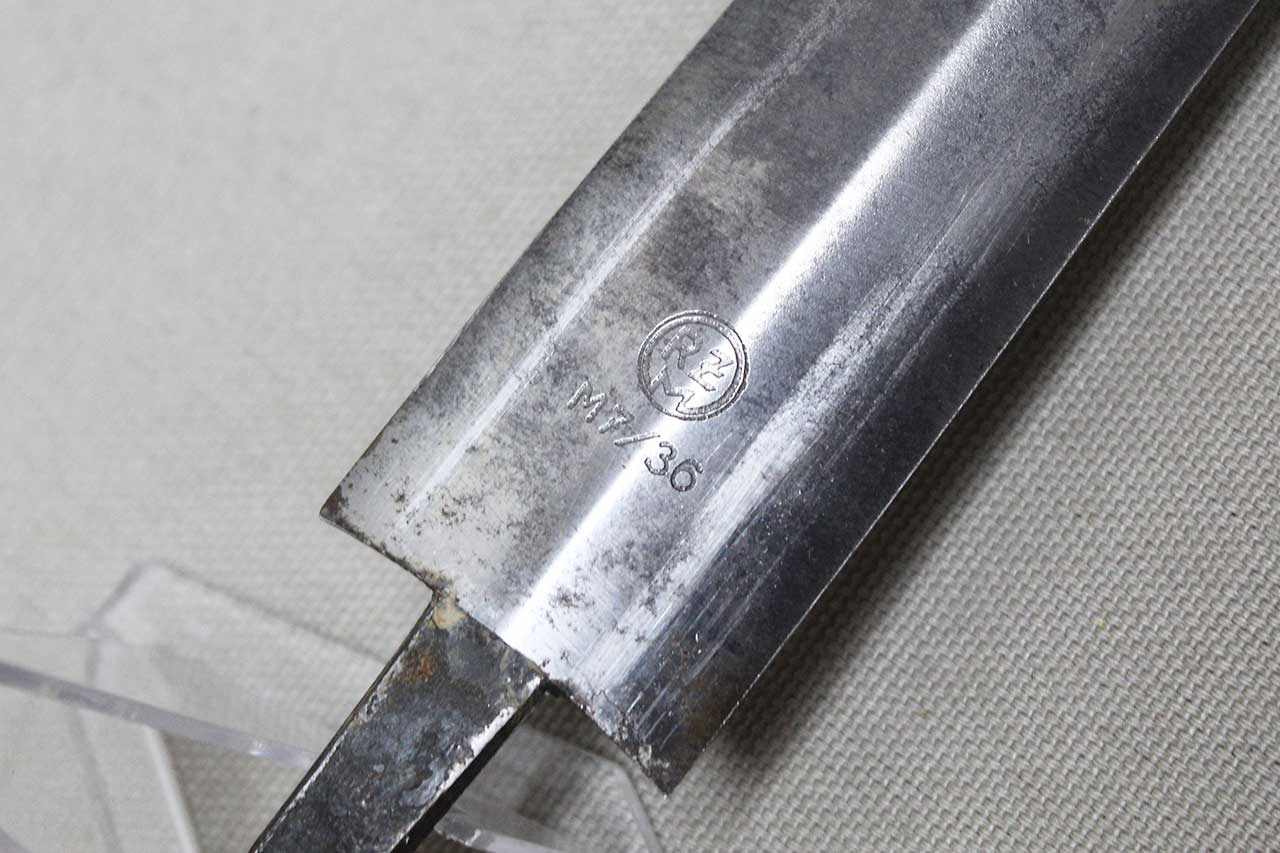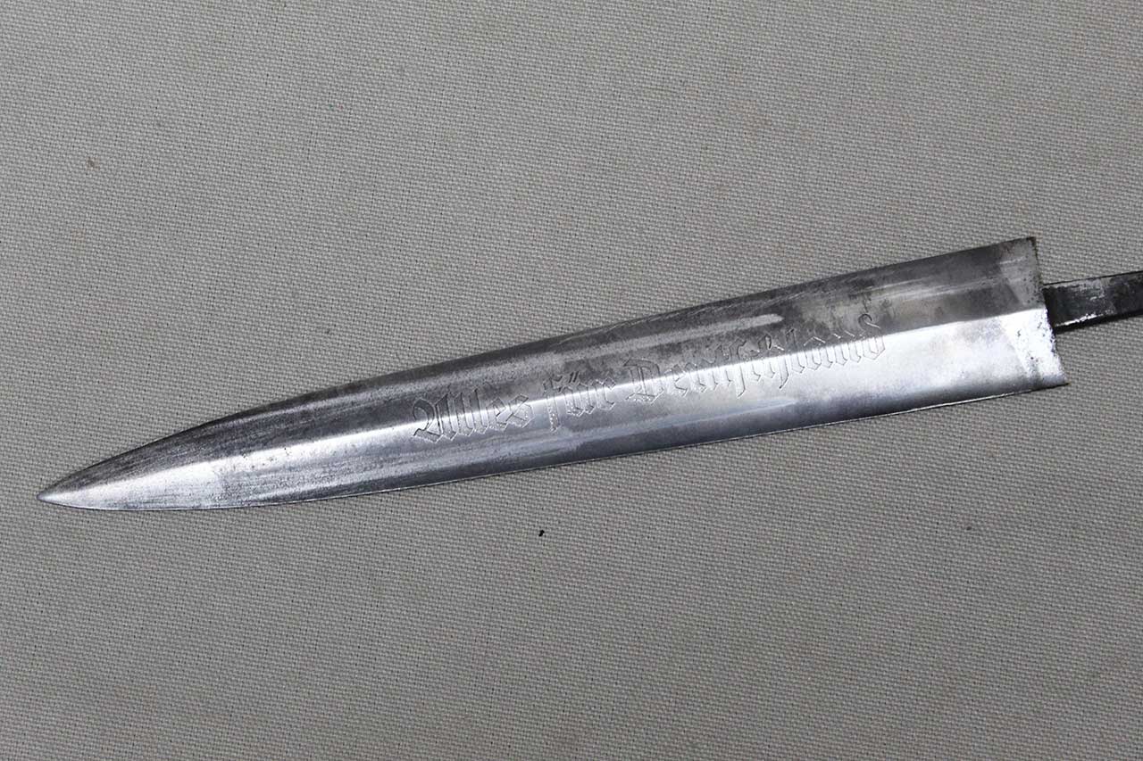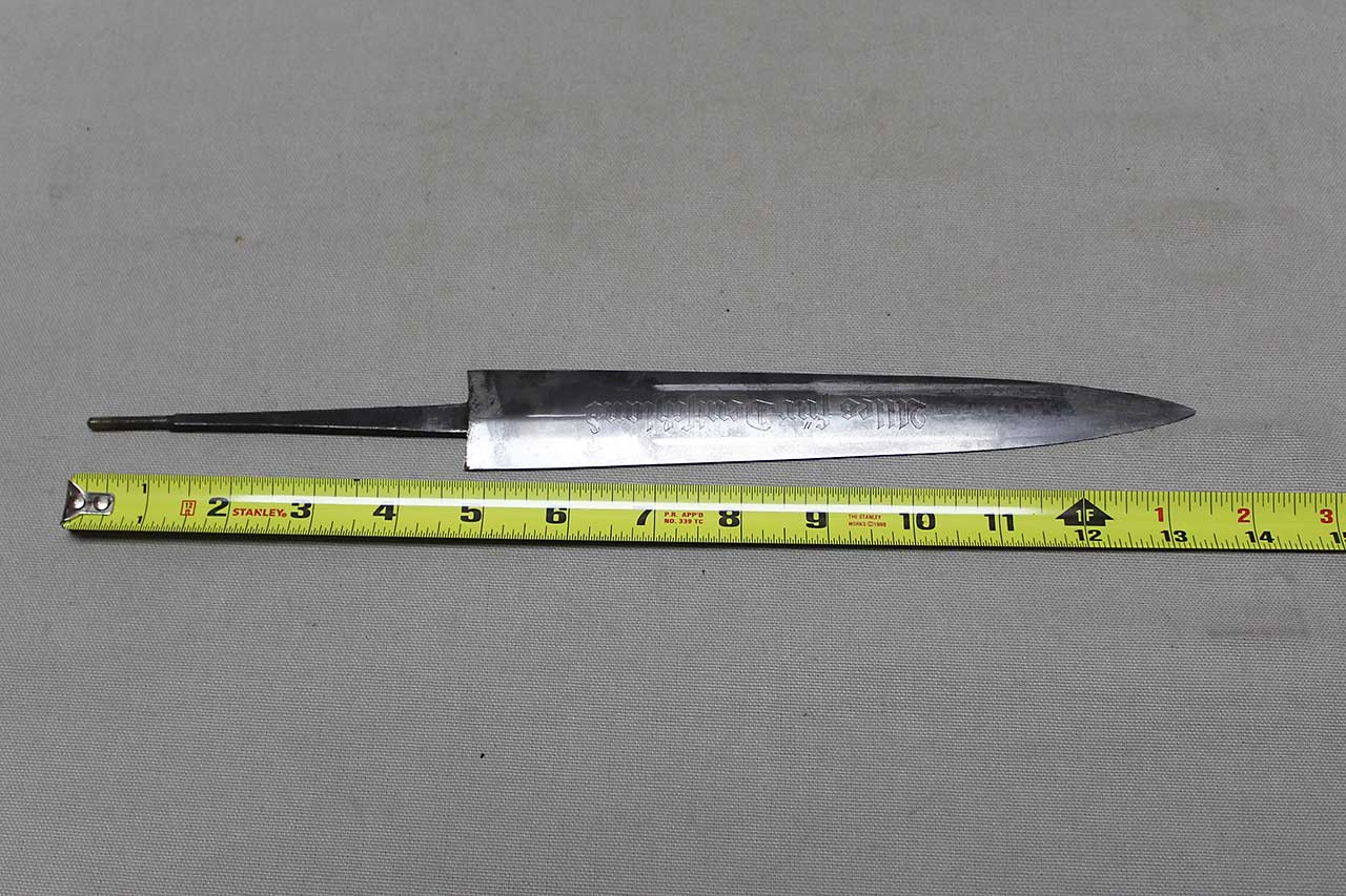 WW2 German SA Dagger Blade. Blade marker marked RZM M7/36 (for the maker of E. & F. Hörster, Solingen) on one side and with acid etched “Alles für Deutschland” motto on other side of blade. Blade in heavily worn condition with a lot of graying, spotting, scratches, and in-and-out marks. Blade tang also has the proper billet clamp seam on the sides of the tang. Blade only, good if you need for restoration project.