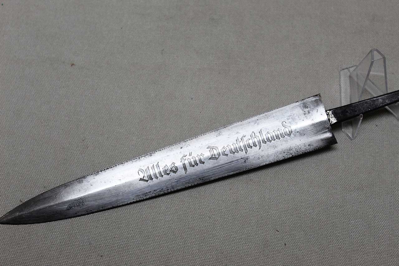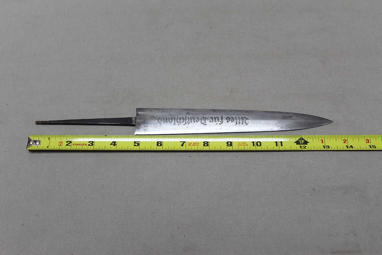 WW2 German SA Dagger Blade. Blade marker marked with the logo for Herm. Konejung A.G. Solingen on one side and with acid etched “Alles für Deutschland” motto on other side of blade. Blade in heavily worn condition with a lot of graying, spotting, sharpening, scratches, and in-and-out marks. Blade tang also has the proper billet clamp seam on the sides of the tang. Blade only, good if you need for restoration project.