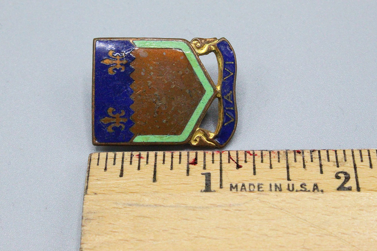 U.S. Army 127th Field Artillery Distinctive Insignia (DI). Single DI. Screw Post. Motto on DI is “Via Vi” or “A Way by Force”. WW2 Era.