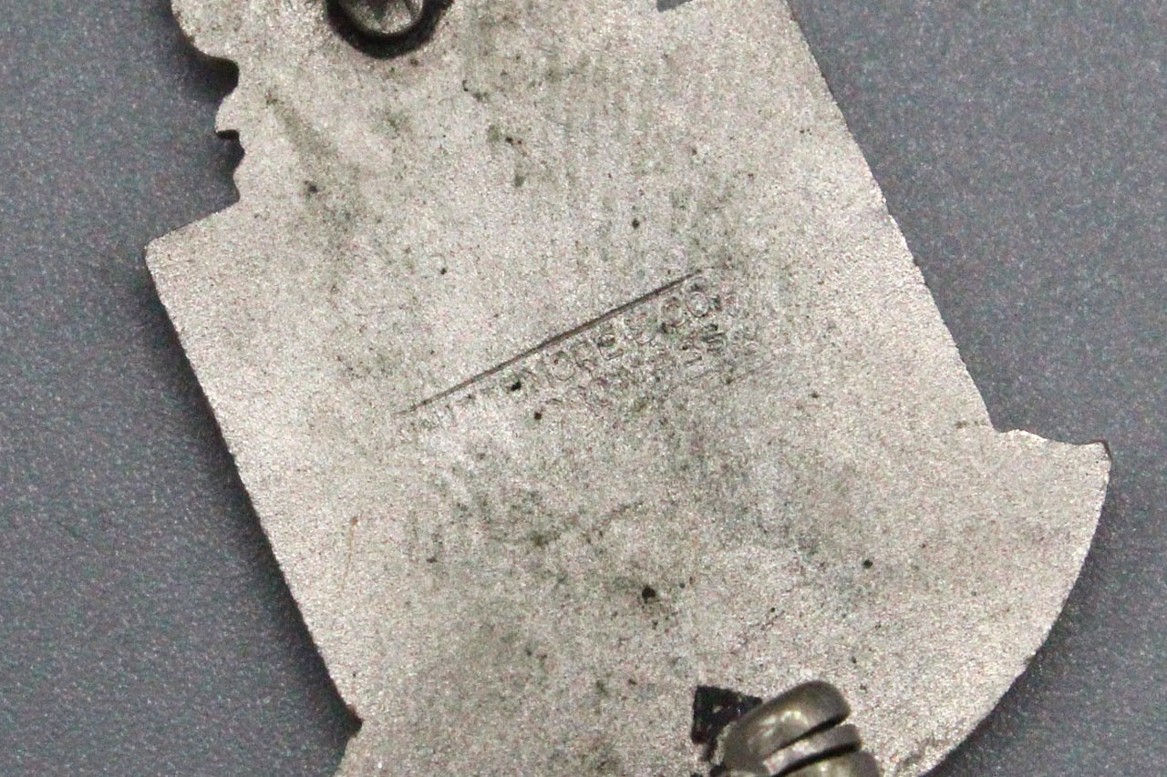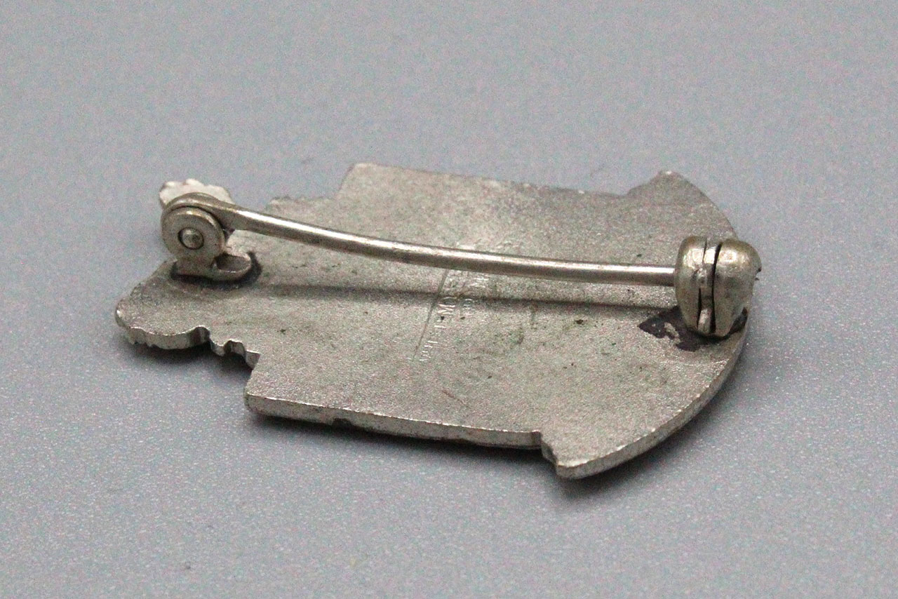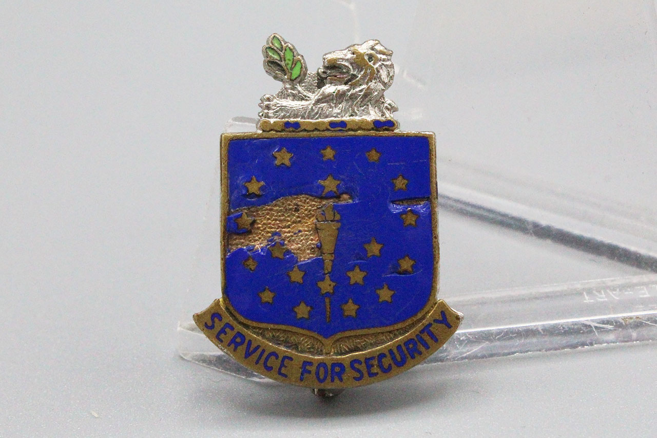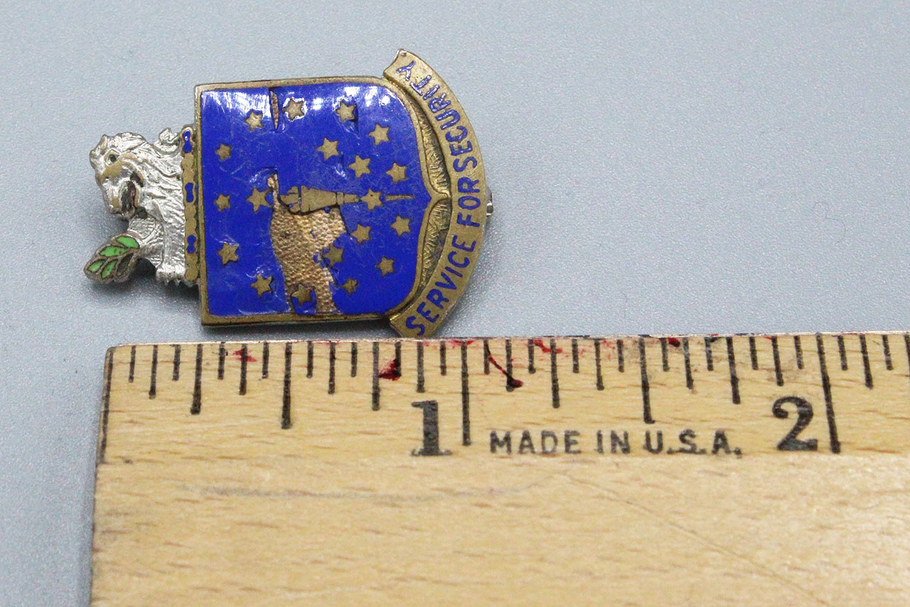 U.S. Army Indiana National Guard Distinctive Insignia (DI). Pin back. Single DI. Marker marked on back.. Motto on DI is “Service for Security”. WW2 era. Big enamel chips on front.