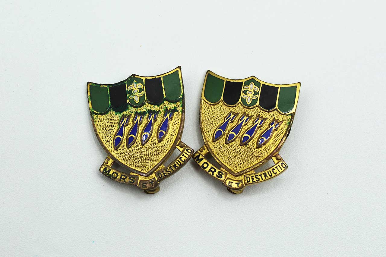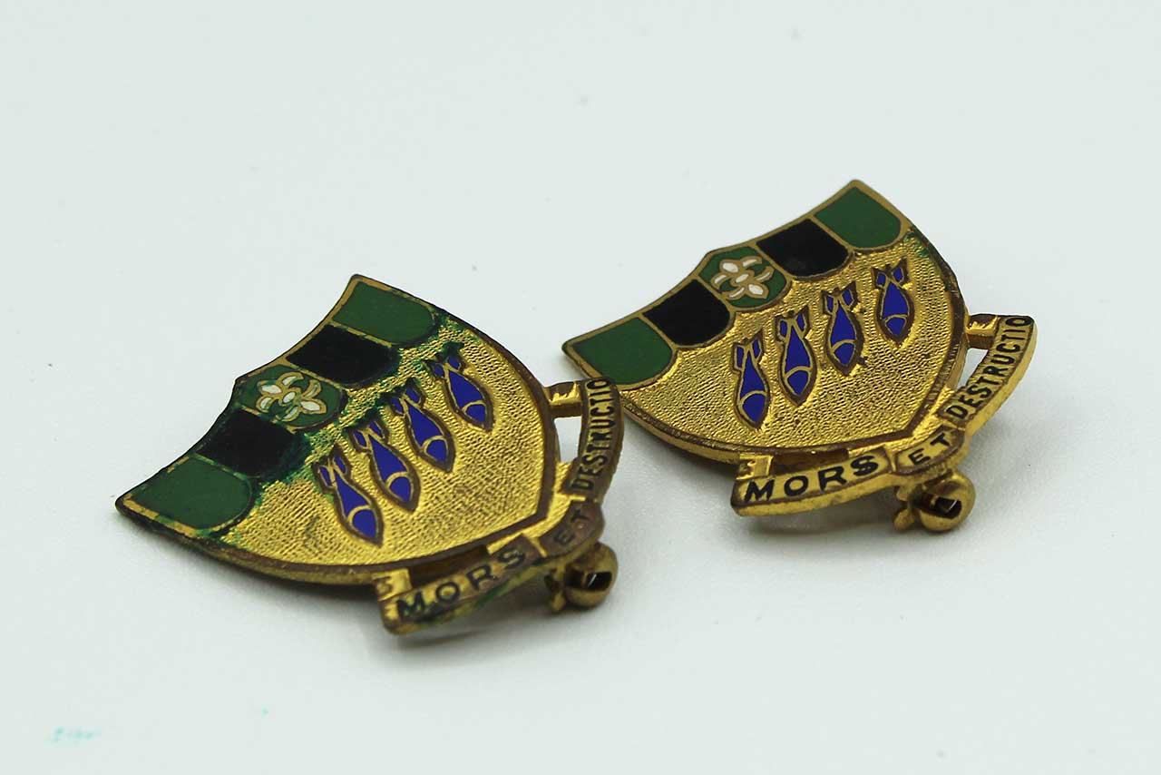 Additional Notes: The US Army Air Corps 2nd Bombardment Group’s distinctive insignia, “Mors Et Destructio,” was originally used during World War I. The motto was changed to “Libertatum Defendimus” (We Defend Liberty) in April 1940. The insignia features a shield divided into five stripes, with black and primitive green representing the colors used by the Army Air Service during World War I. The three green stripes symbolize the three major offensives the wing participated in: St. Mihiel, Lorraine, and Meuse-Argonne. The white fleur-de-lis at the top represents France, the theater of operations for the wing’s World War I achievements. The lower portion of the shield is Air Force golden yellow, charged with four aerial bombs in ultramarine blue, representing the original four combatant squadrons (11th, 20th, 96th, and 166th Aero Squadrons).