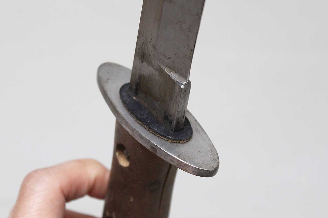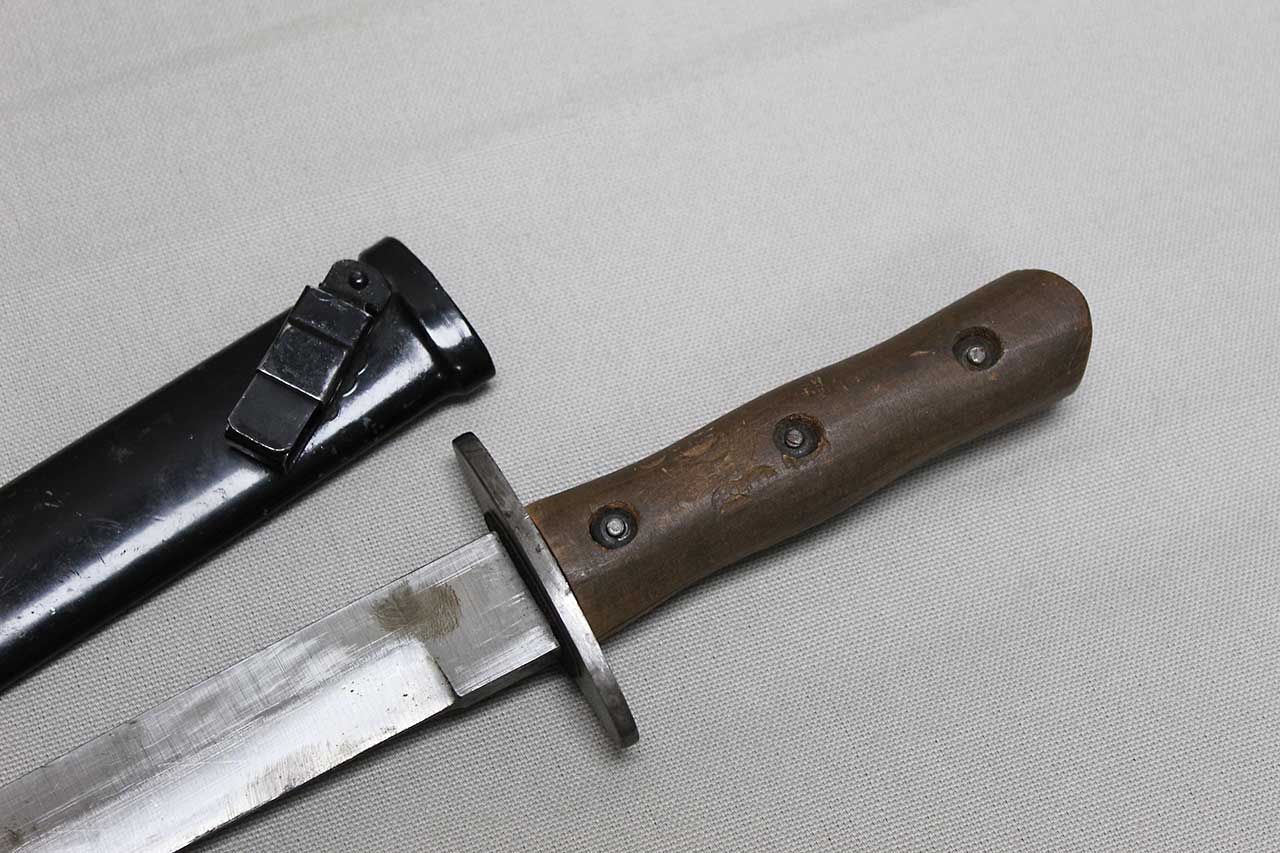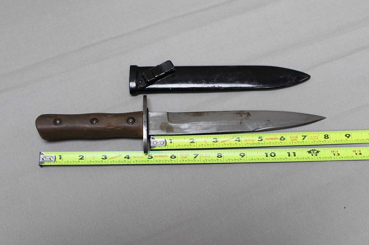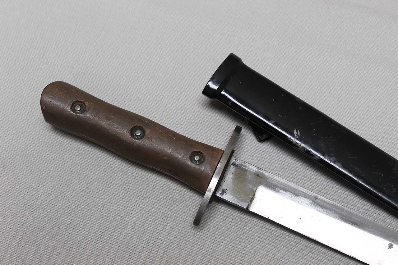WW2 Italian Army M39 Fighting Knife. This is the early 3 rivet version. Better condition than you typically see, wood handle is decent condition and 3 steel rivets with blacken steel washers still in place. The large 8 inch blade still in good overall condition. The scabbard is still in nice condition as well (typically, these are dented a bit), and the swivel belt loop still functions fine. Worn condition.
