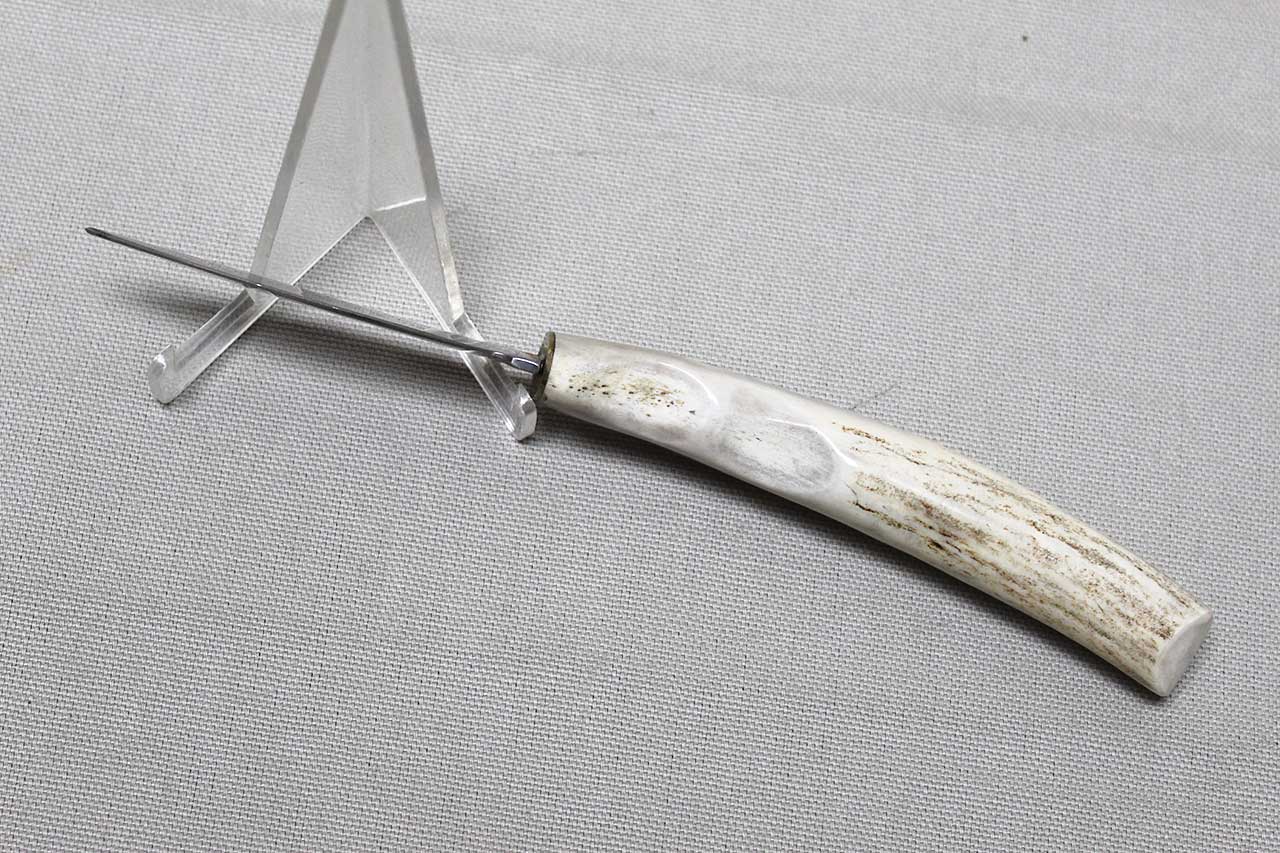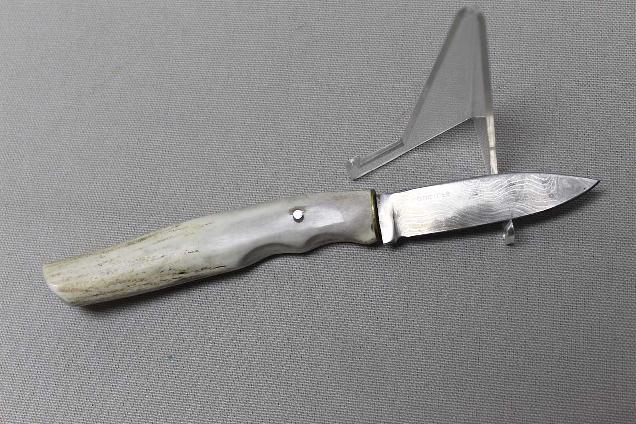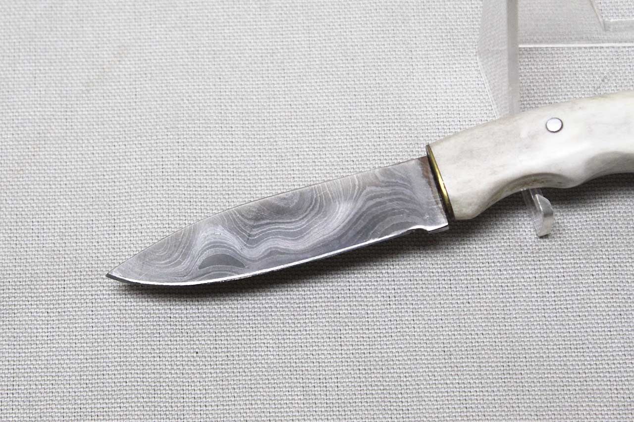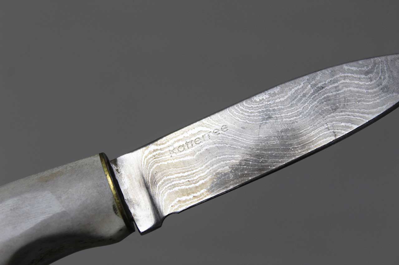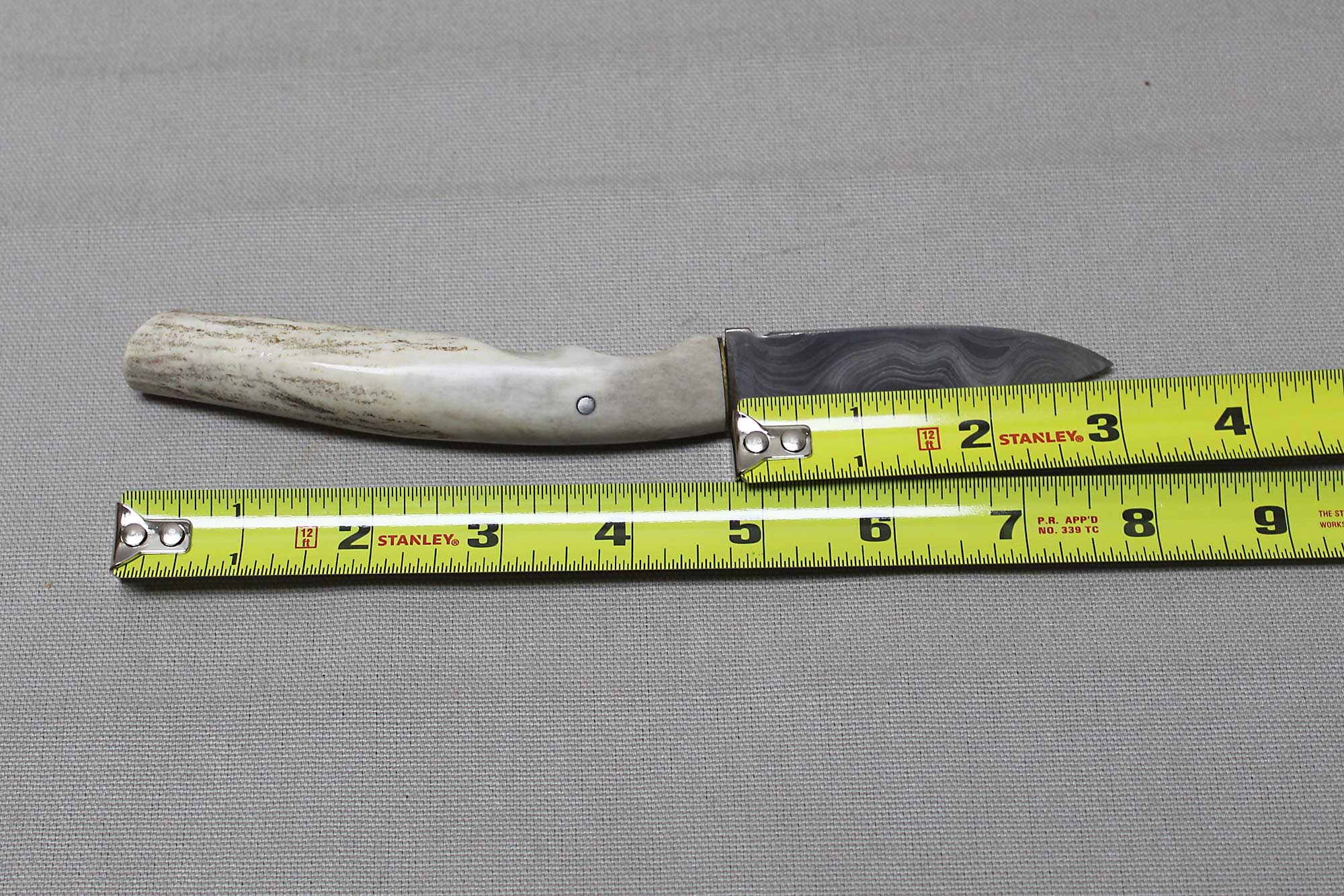 Vintage Knife marked Ratterre with white antler grip. Nice design on blade. Approximately 3 inch blade and 7 3/4 inches in overall length. A dent looking most likely custom-made knife.