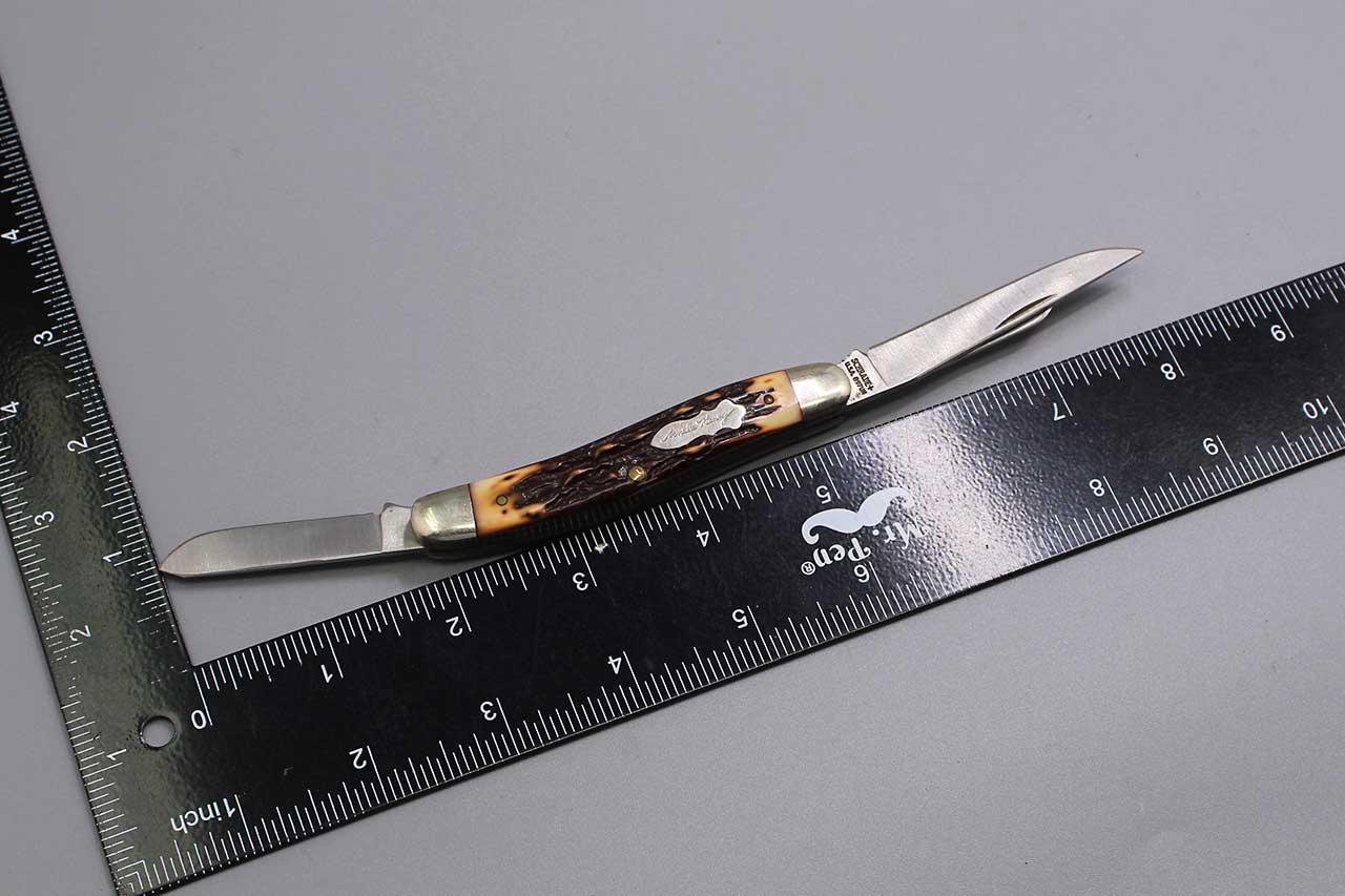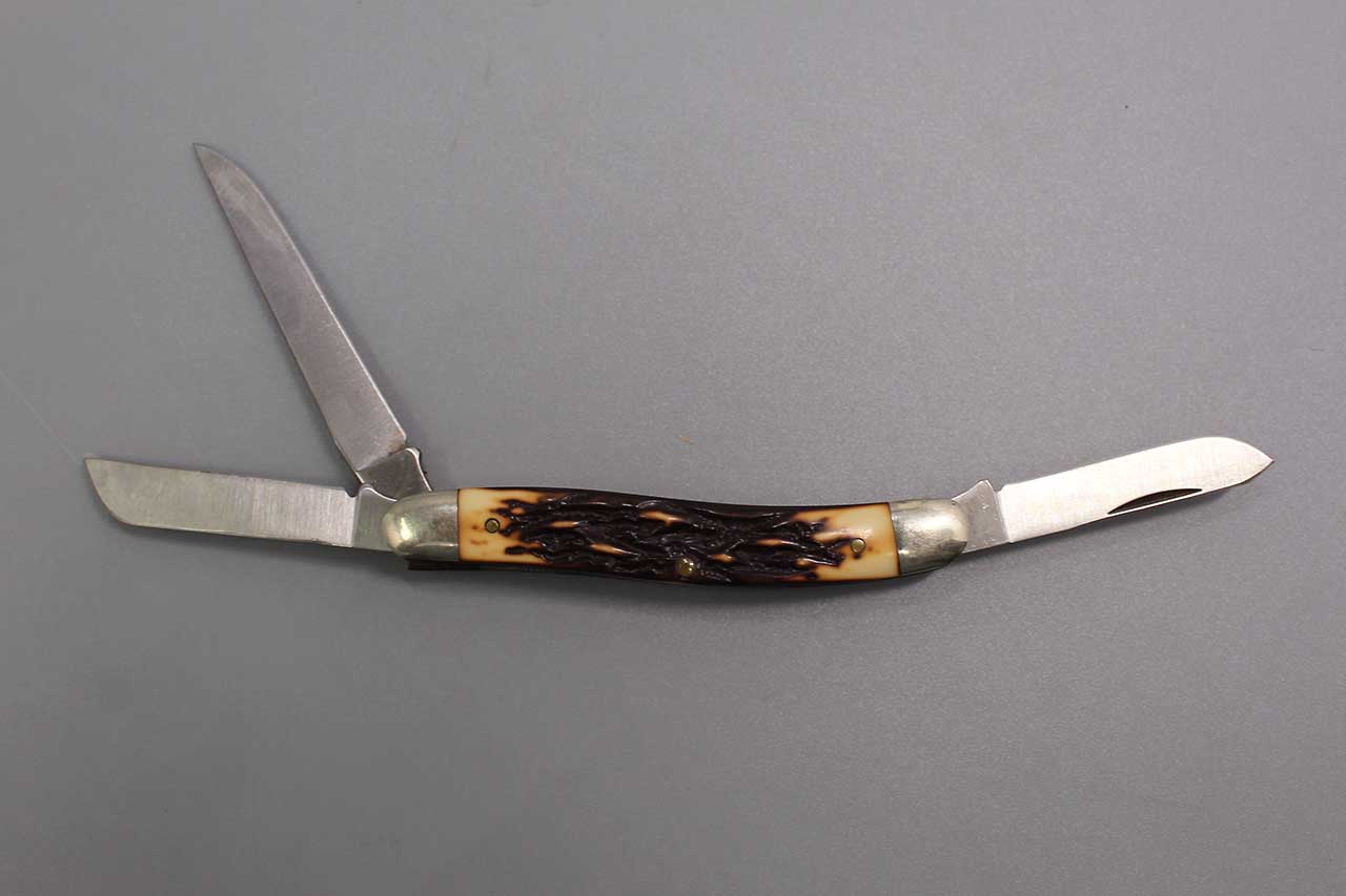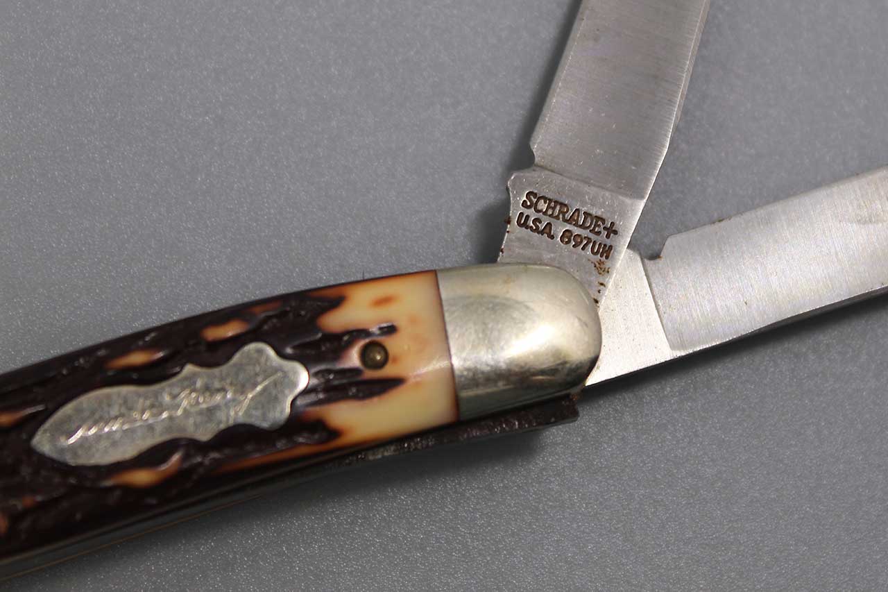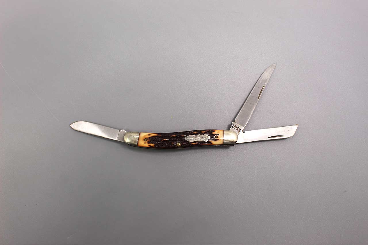 Vintage United States 3 blade Uncle Henry Pocket Knife Schrade+ 897UH. Marker marked on largest blade: Schrade+ U.S.A. 897UH. Blade fold in and out nicely and no wobble. Good overall condition.