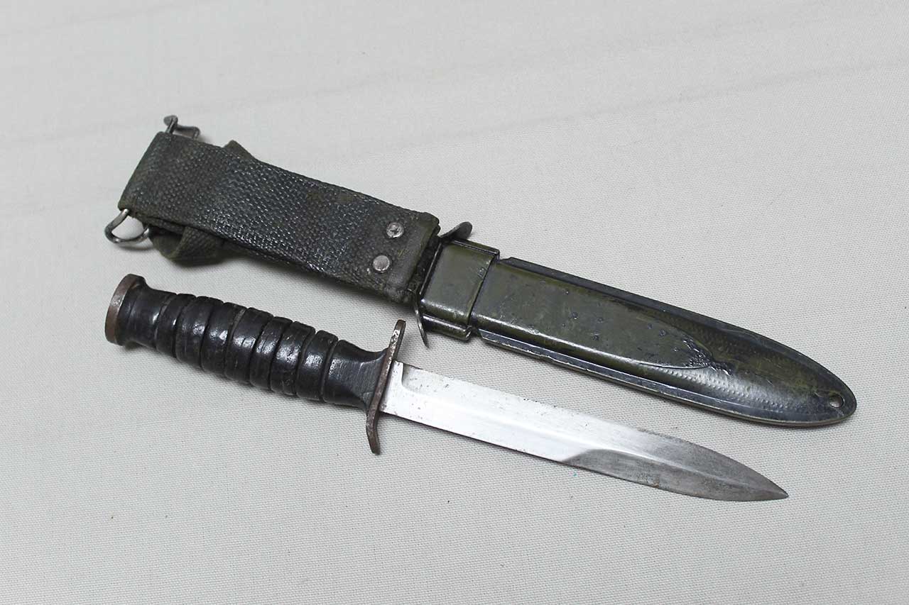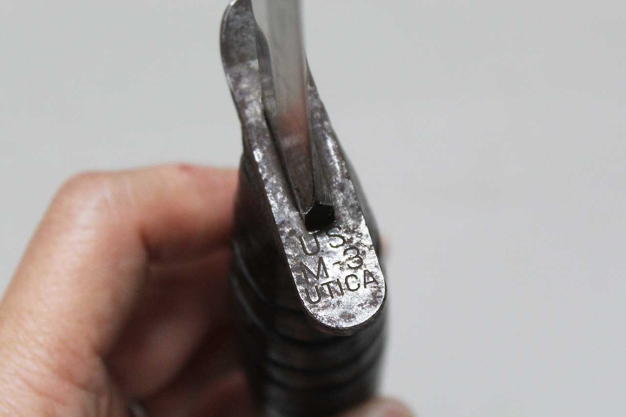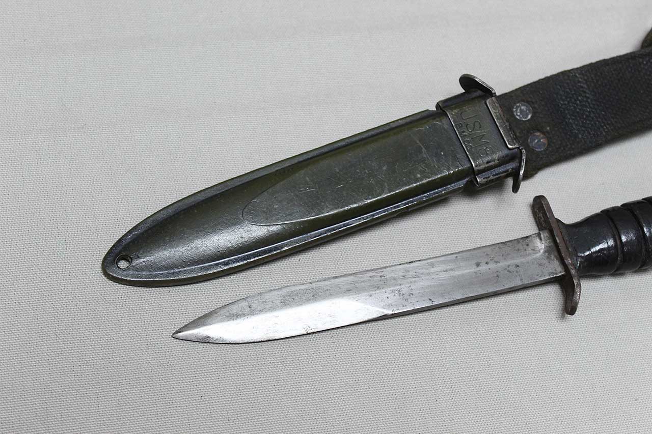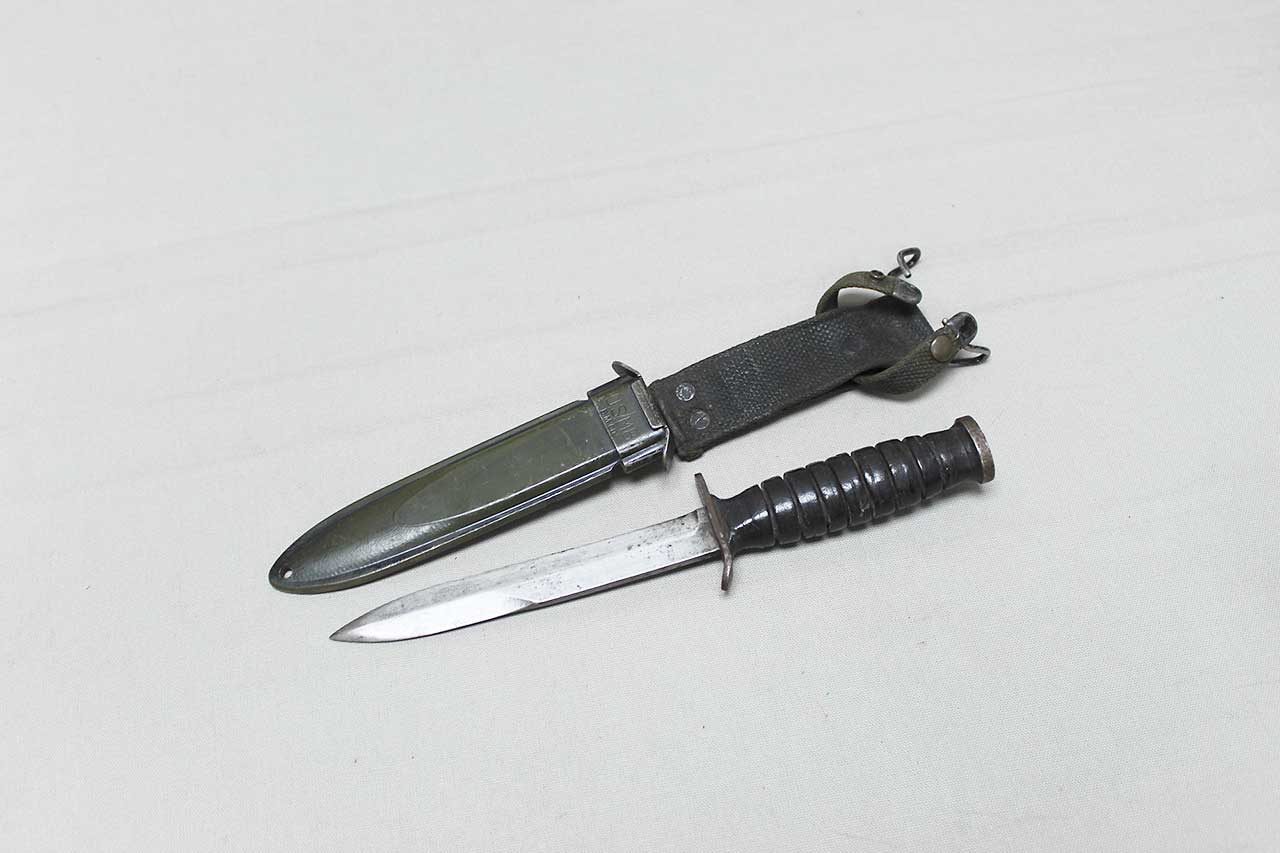 Additional Notes: The M3 fighting knife was an American military combat knife first issued in March of 1943. The M3 was originally designated for issue to soldiers not otherwise equipped with a bayonet. However, it was particularly designed for use by forces in need of a close combat knife, such as Airborne Units and Army Rangers, so these units received priority for the M3 at the start of production. As more M3 knives became available in 1943 and 1944, the knife was issued to other soldiers such as Army Air Corps crewmen and soldiers not otherwise equipped with a bayonet.
