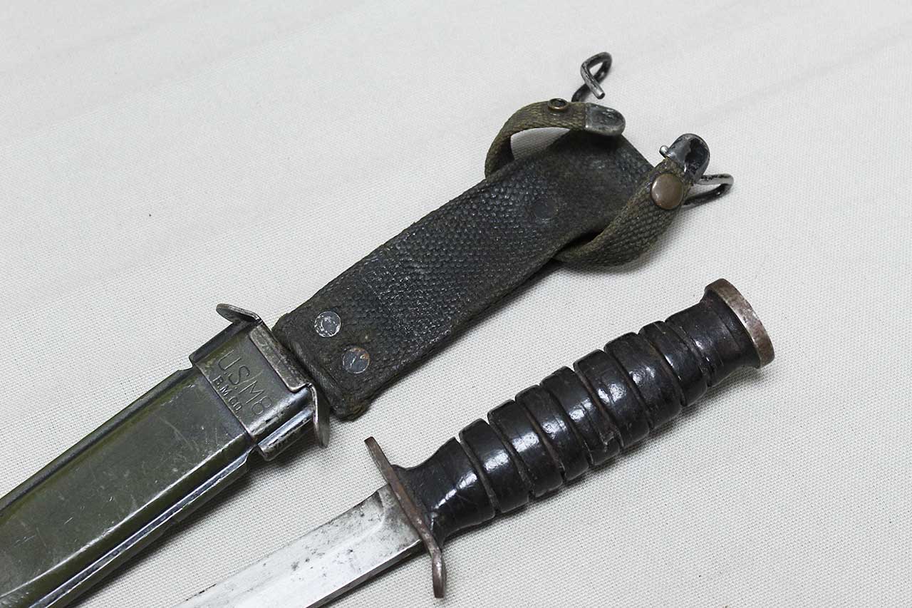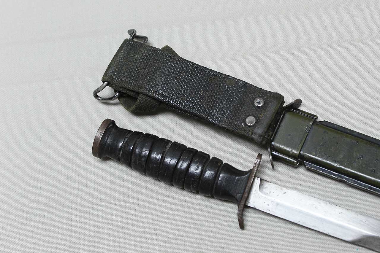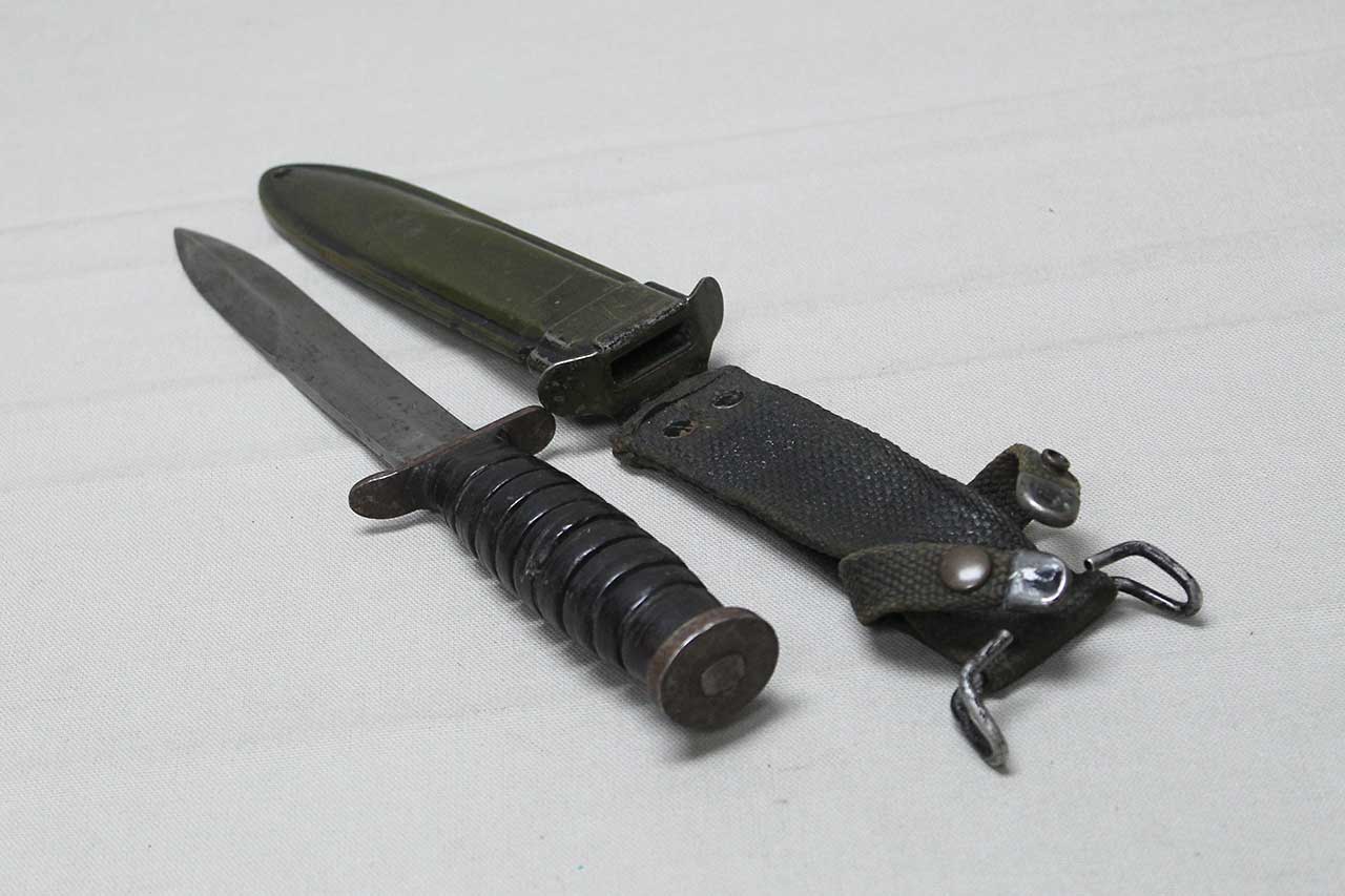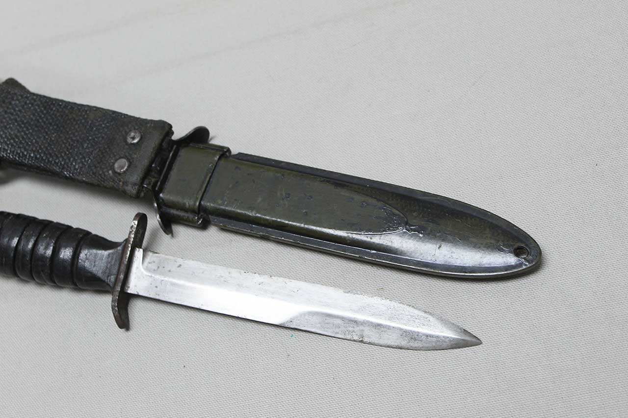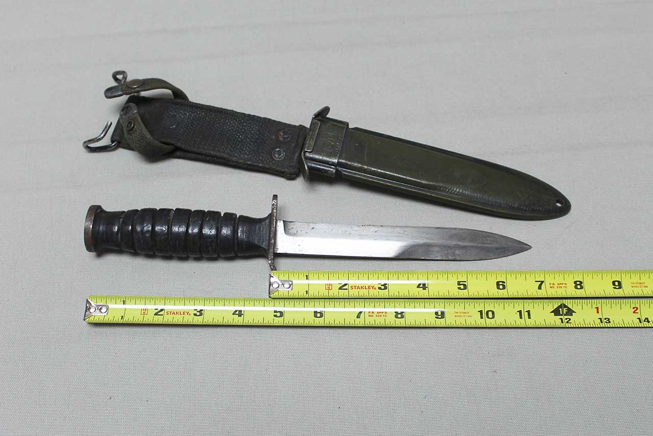 Additional Notes: The M3 fighting knife was an American military combat knife first issued in March of 1943. The M3 was originally designated for issue to soldiers not otherwise equipped with a bayonet. However, it was particularly designed for use by forces in need of a close combat knife, such as Airborne Units and Army Rangers, so these units received priority for the M3 at the start of production. As more M3 knives became available in 1943 and 1944, the knife was issued to other soldiers such as Army Air Corps crewmen and soldiers not otherwise equipped with a bayonet.