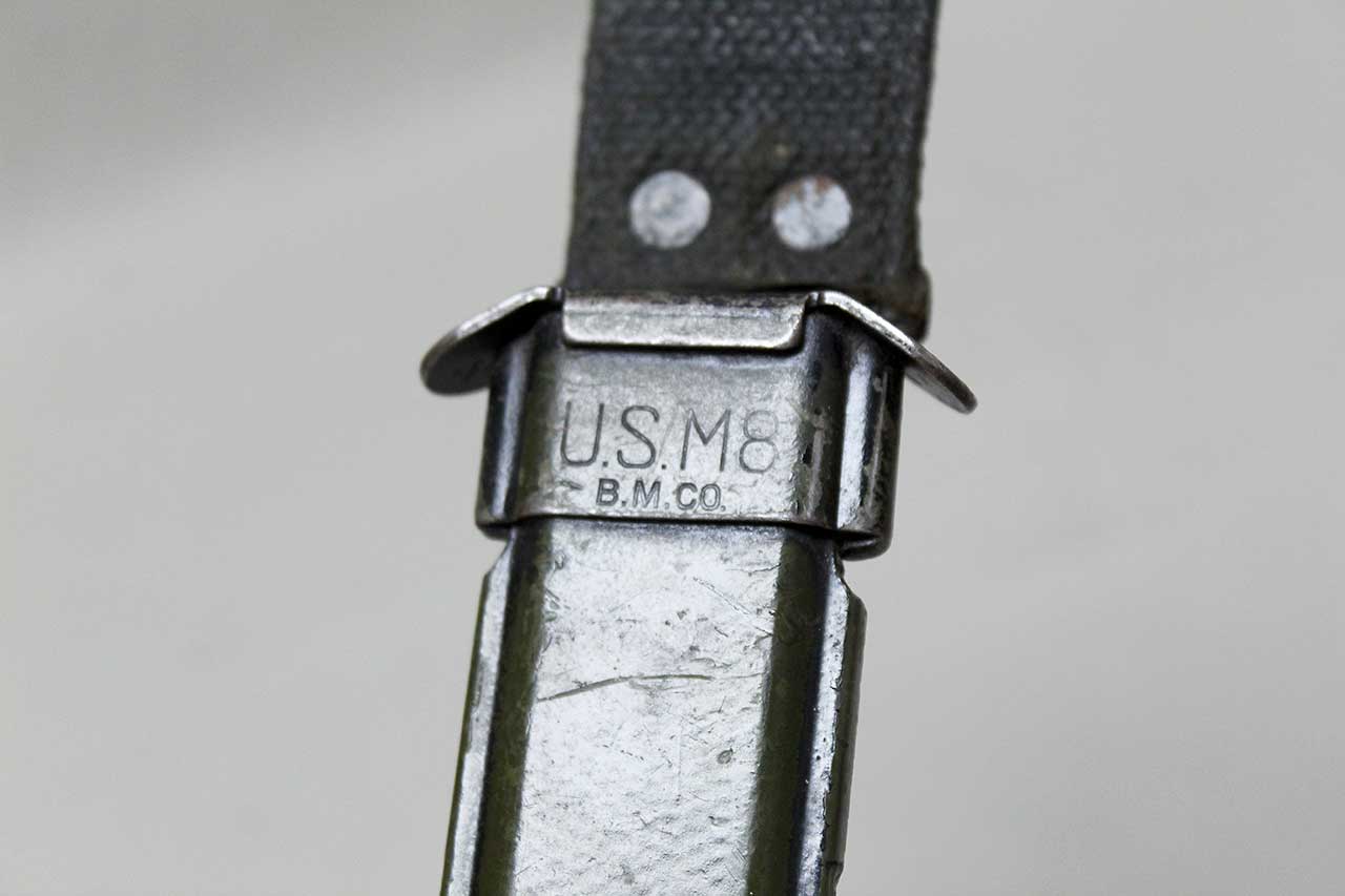 WW2 United States M3 Combat Fighting Knife. This one is cross guard marked: US M-3 Utica. Worn condition stacked leather handle. Heavily worn condition blade with a lot of wear and use. However, handle and blade are still nice and tight. The top of the pommel has the U.S. “Flaming Bomb” proof mark. Knife has the US M8 B.M.Co marked scabbard, however, appears like it might have been repainted on the scabbard or some type of finish applied on top of the strap and scabbard. 1940s (ww2) era. Overall, a heavily worn condition combat fighting knife.