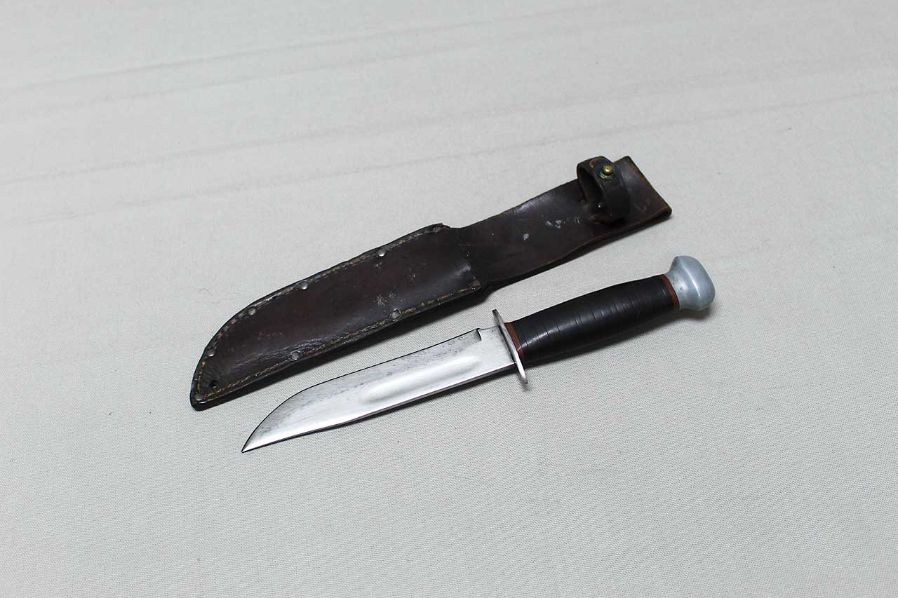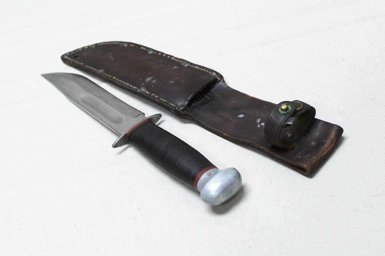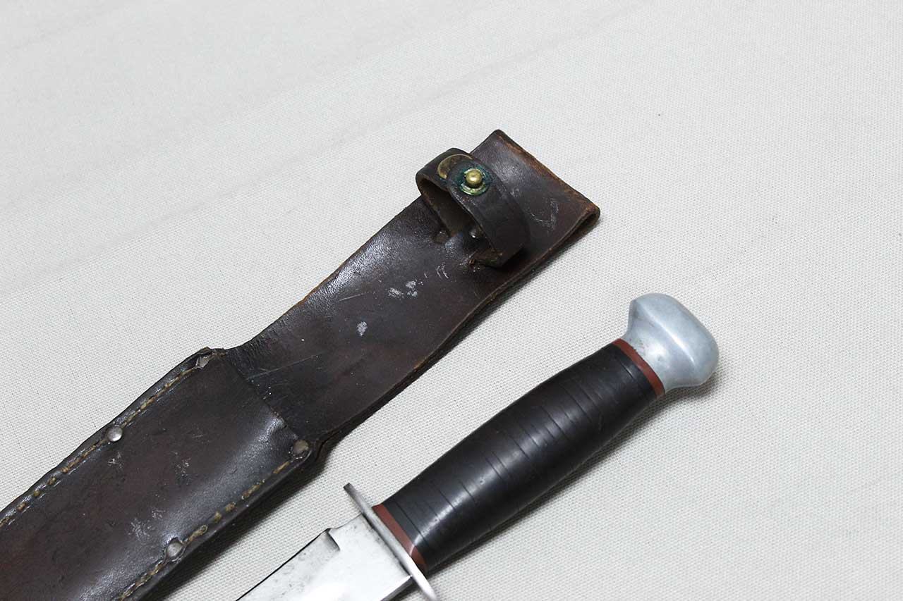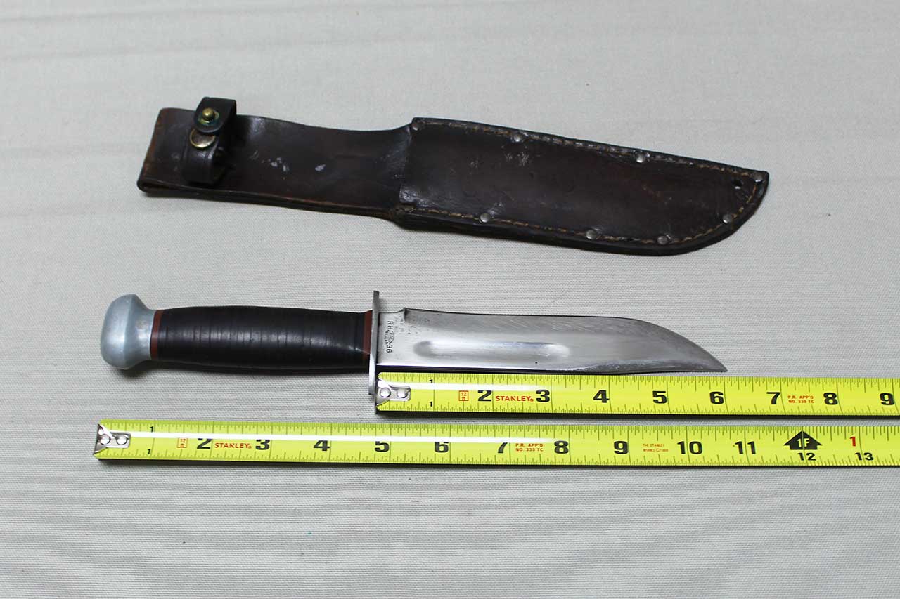 United States WW2 PAL RH-36 Combat Knife with sheath. Finished bright blade with black and red spacers at the guard and pommel. Blade ricasso marked PAL RH-36 MADE IN USA. The blade is heavily worn condition with edge sharpening. Sheath is the medium duty with 9 black rivets, this is the most commonly found sheath on the PAL RH-36 knives, very worn condition. Aluminum pommel and steel guard. Blade length approximately 6 1/8 inches. Heavily worn condition.