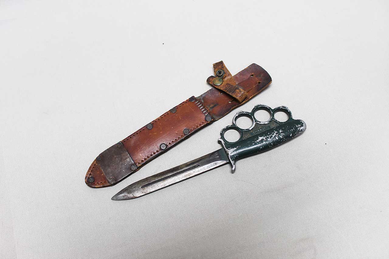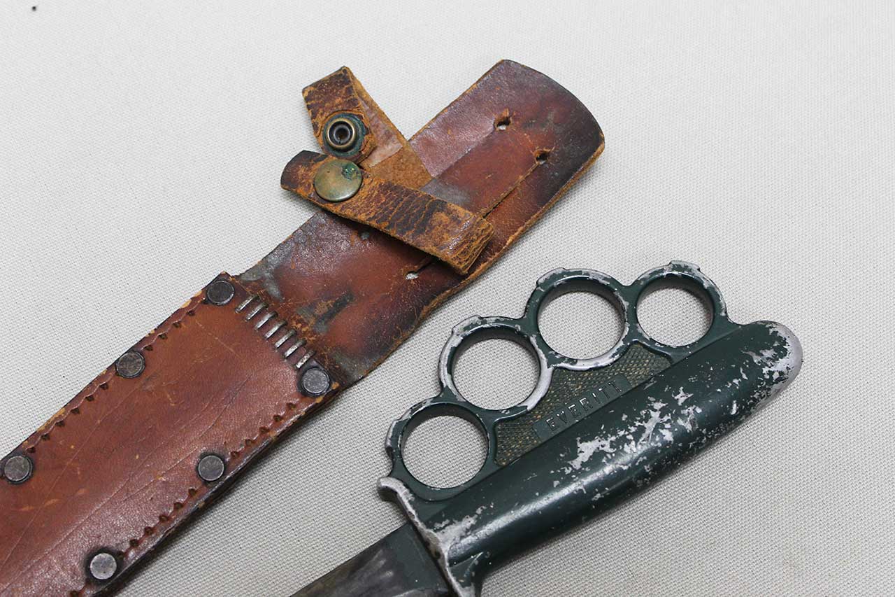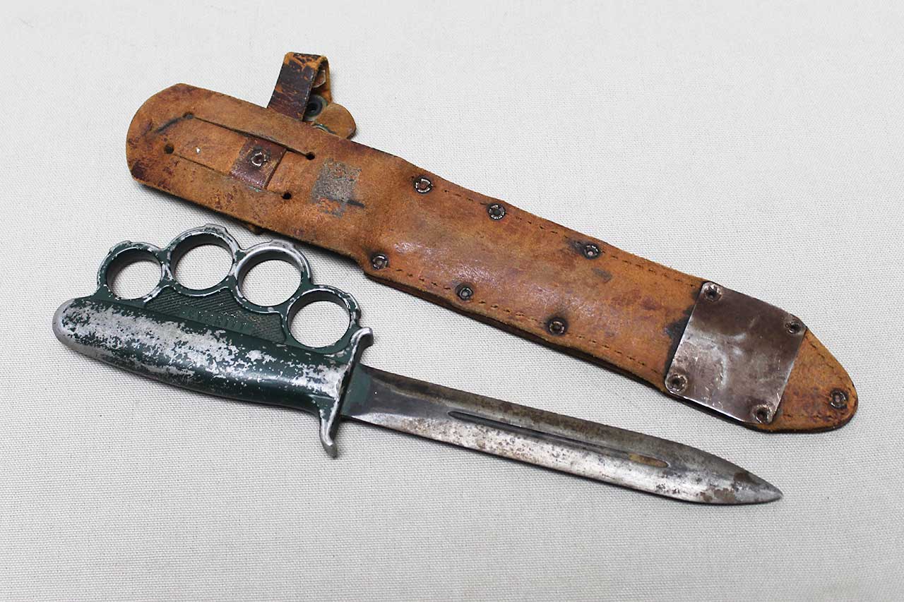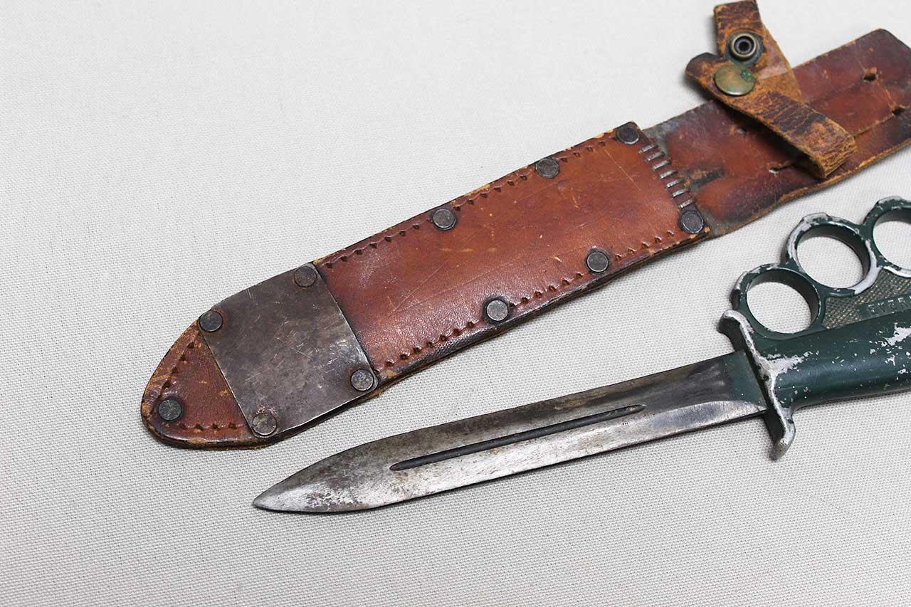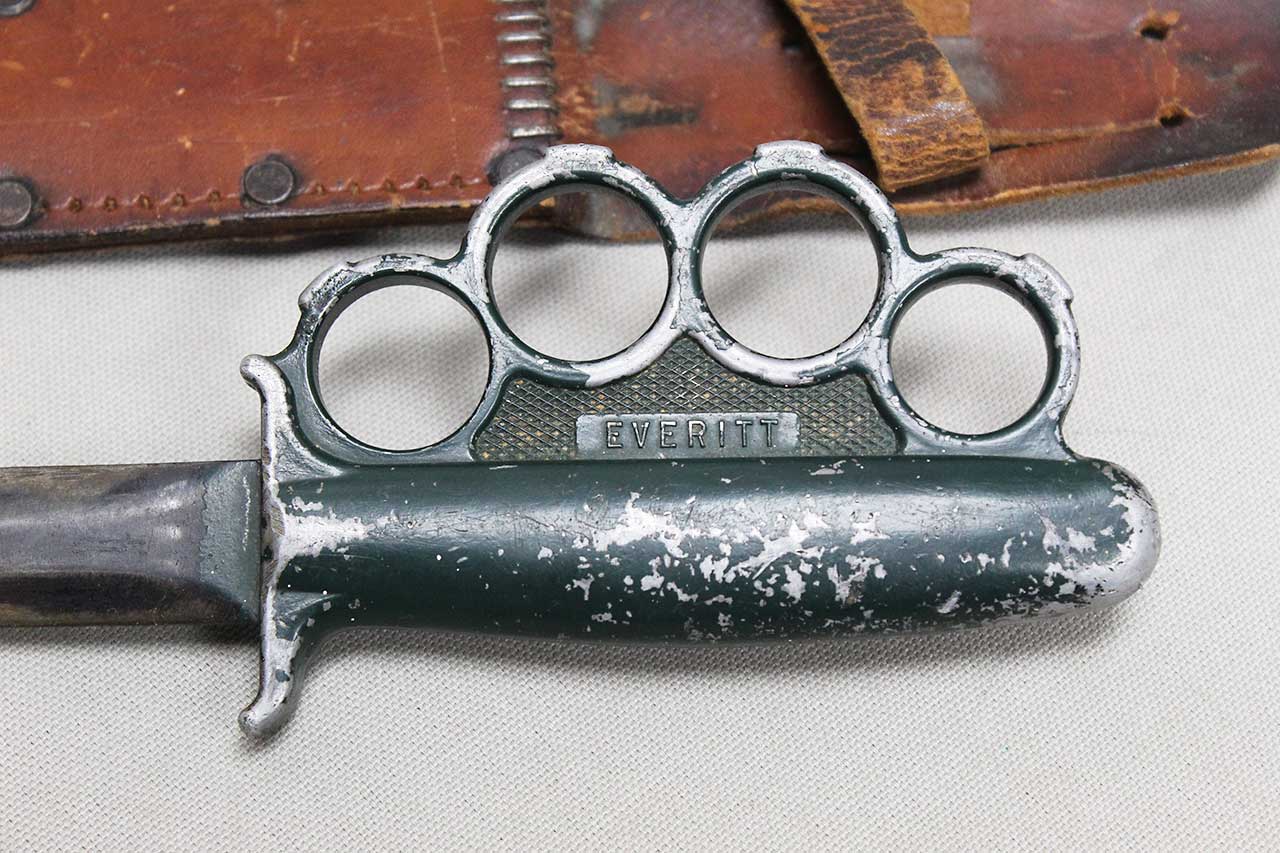 United State WW2 Everitt Knuckle Knife with Leather Sheath. This is the harder to find Green painted aluminum handle knife (The Everitt knife came in both Black and Green painted handles, the Green is much harder to find). Also, has the proper blacken blade. Nice, detailed checkering between the handle and knuckles with crisp Everitt stamping. Blade has narrow central blade fuller. Also, has the variation leather sheath (metal plate on both sides of sheath instead of just on one side) and rivet instead of hole on bottom, very heavily worn condition, snap strap section especially heavily worn. A very hard knife to find.