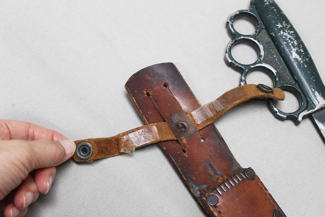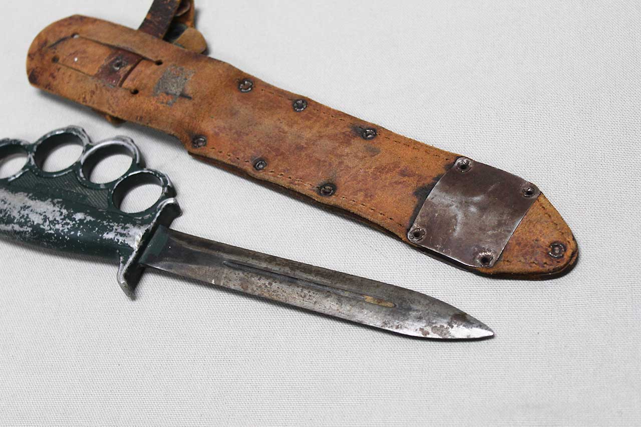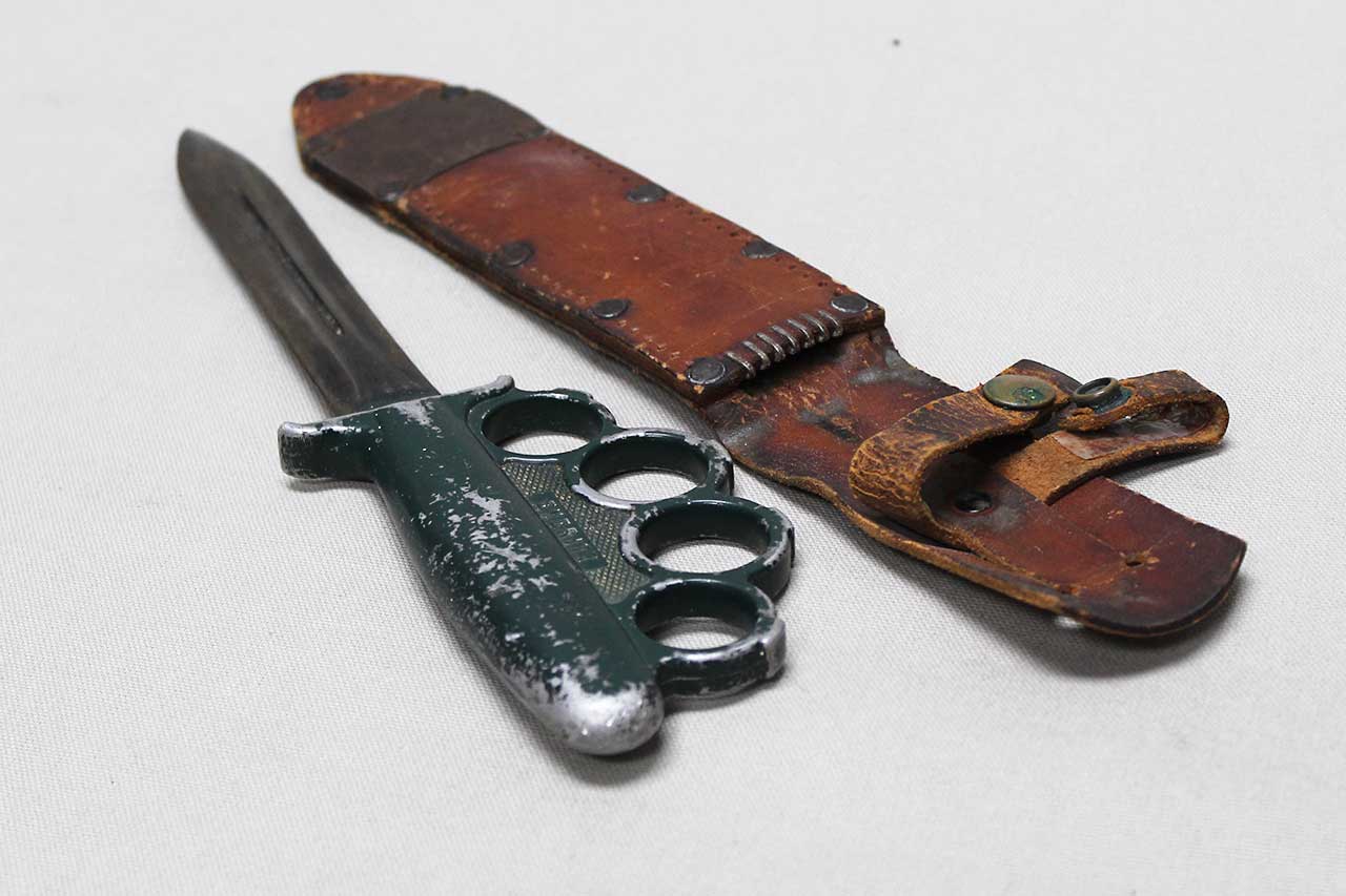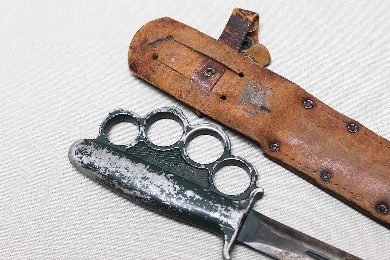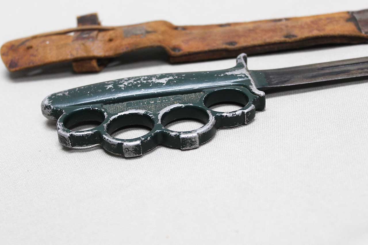 United State WW2 Everitt Knuckle Knife with Leather Sheath. This is the harder to find Green painted aluminum handle knife (The Everitt knife came in both Black and Green painted handles, the Green is much harder to find). Also, has the proper blacken blade. Nice, detailed checkering between the handle and knuckles with crisp Everitt stamping. Blade has narrow central blade fuller. Also, has the variation leather sheath (metal plate on both sides of sheath instead of just on one side) and rivet instead of hole on bottom, very heavily worn condition, snap strap section especially heavily worn. A very hard knife to find.