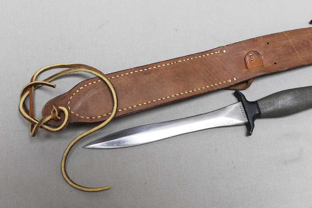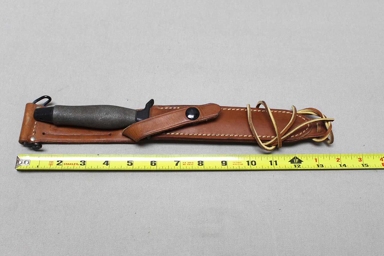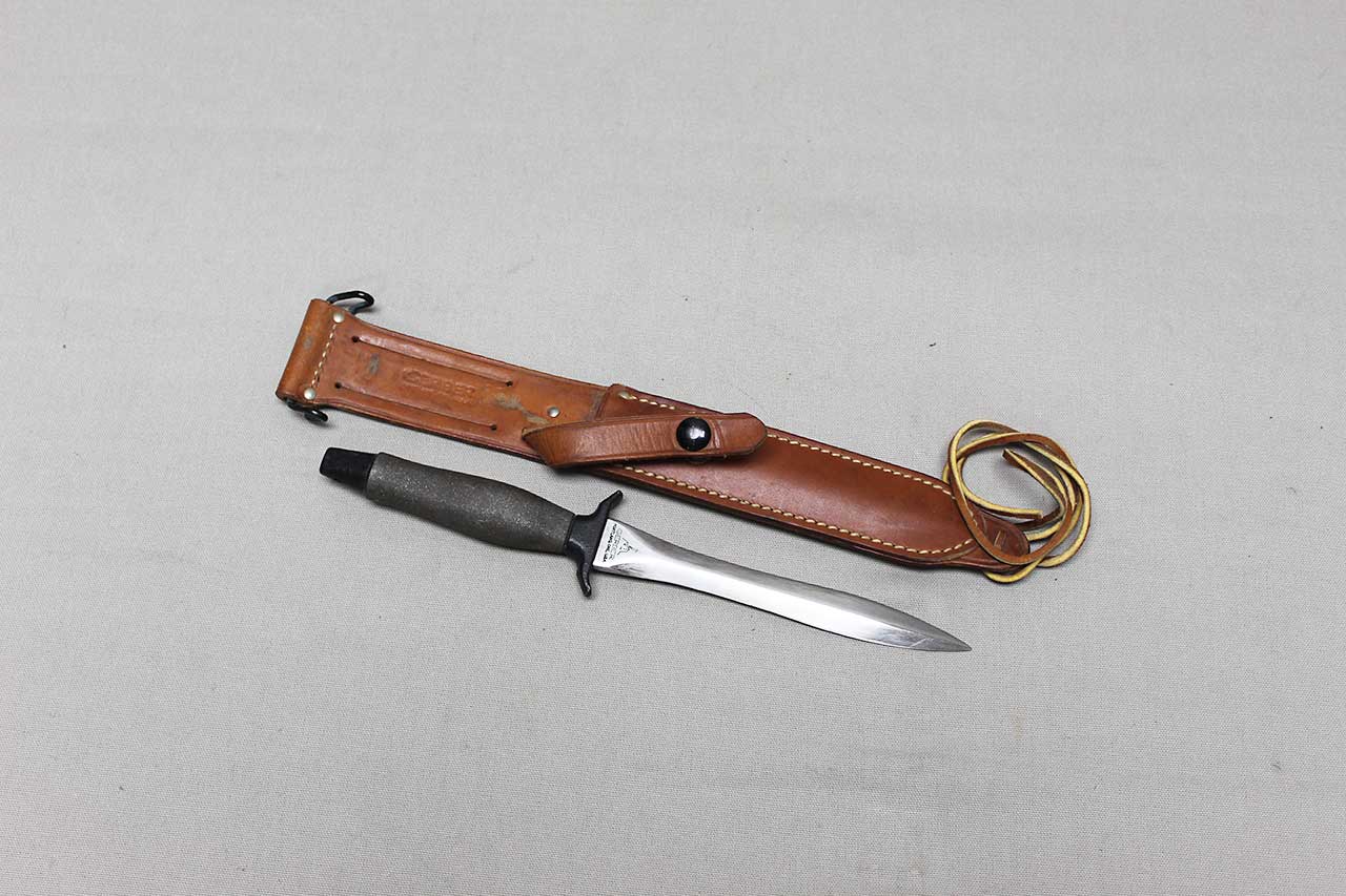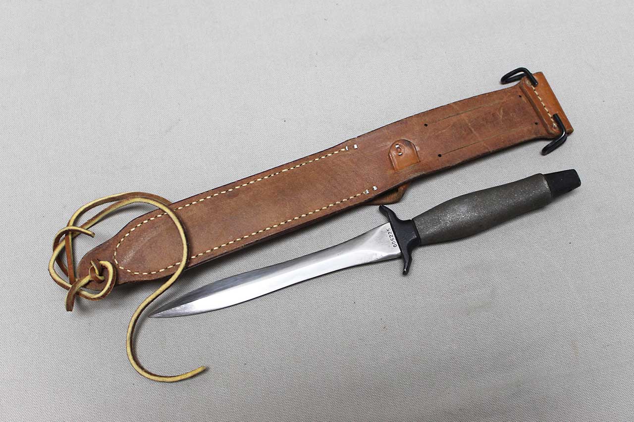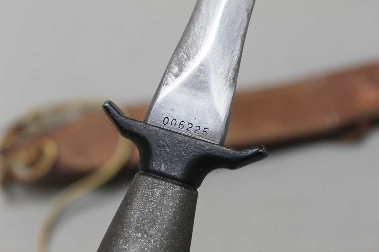 United States Gerber Mark II knife with sheath. Cat’s Tongue handle. I believe this one is a Cat’s Tongue Type 2 (CT2) knife. Combat knife with L6 Steel and Slant 1 logo. Narrow wasp blade with no teeth serrations. Blade has a bit of wear and sharpening. Serial number on blade is 006225 which would date this one to 1968. Combat sheath has some wear and has the round end with right-strap, rivets at throat and hanger, and two-line sheath stamp. Worn condition.