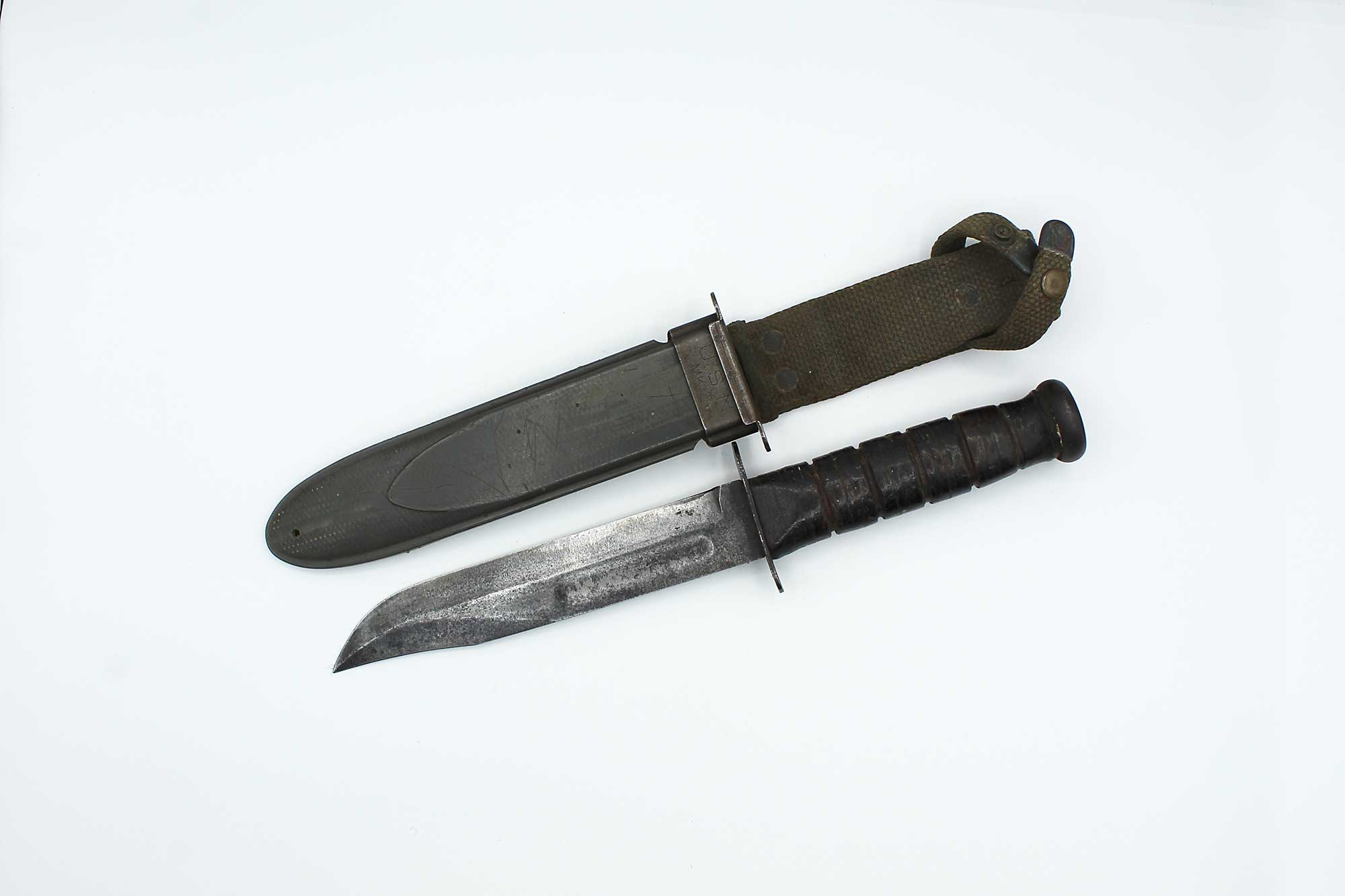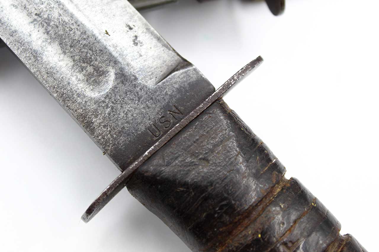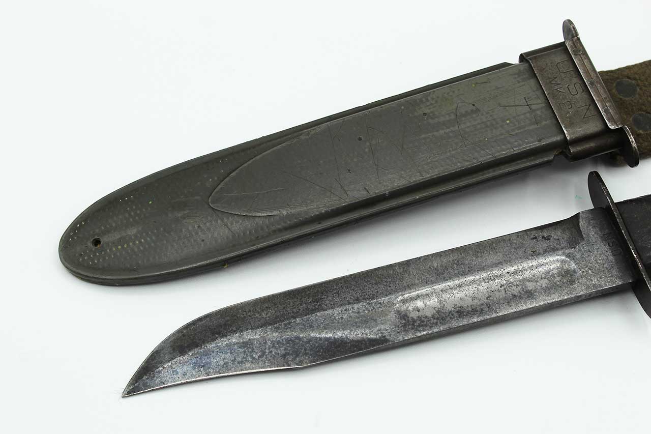 Additional Notes: The United States Navy Mark 2 Fighting Utility Knife, often referred to as the “KA-BAR”, is one of the most iconic combat knives of WW2. Officially known as the 1219C2 Fighting Utility Knife, it was adopted by the U.S. Marine Corps in November of 1942 and later by the Navy as the US Navy Utility Knife, Mark 2. It was designed to replace outdated WW1 era trench knives and served both as a combat weapon and a general-purpose utility tool. The blade was a 7-inch clip point blade made of carbon steel, ideal for both stabbing and cutting. The handle utilized stacked leather washers for grip.