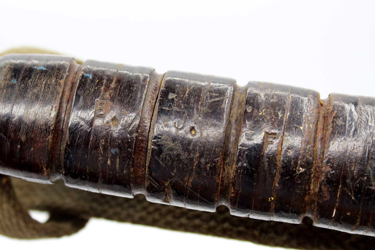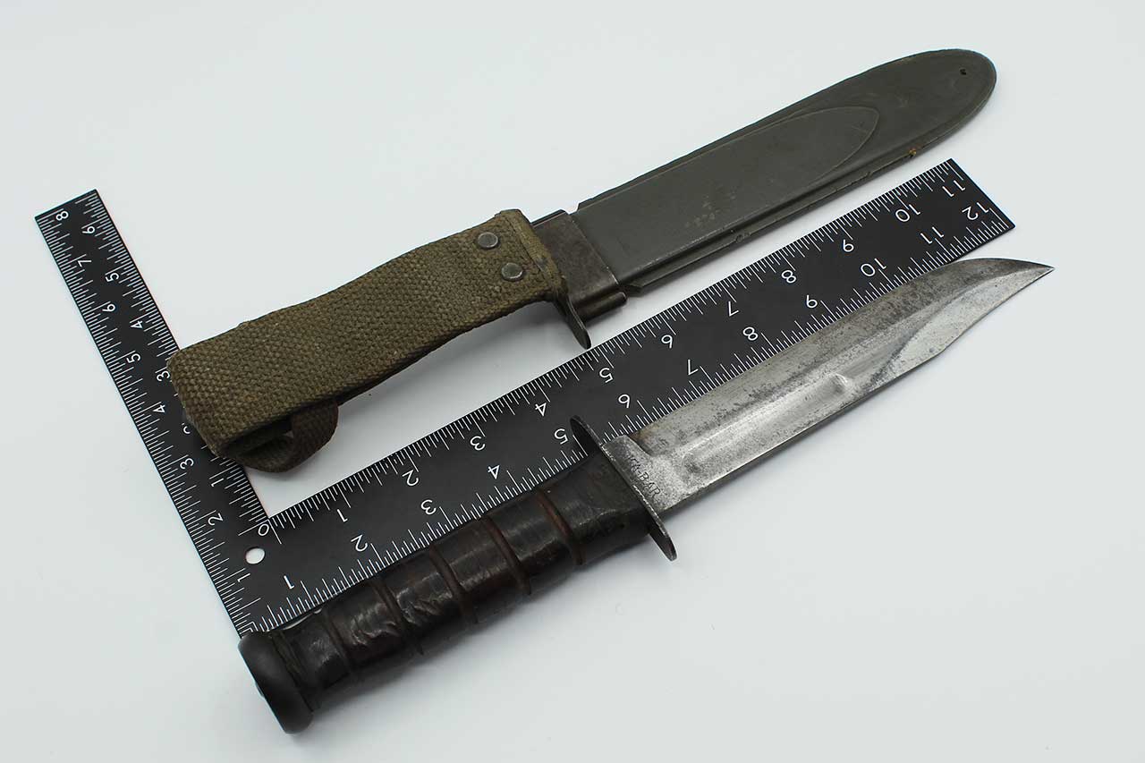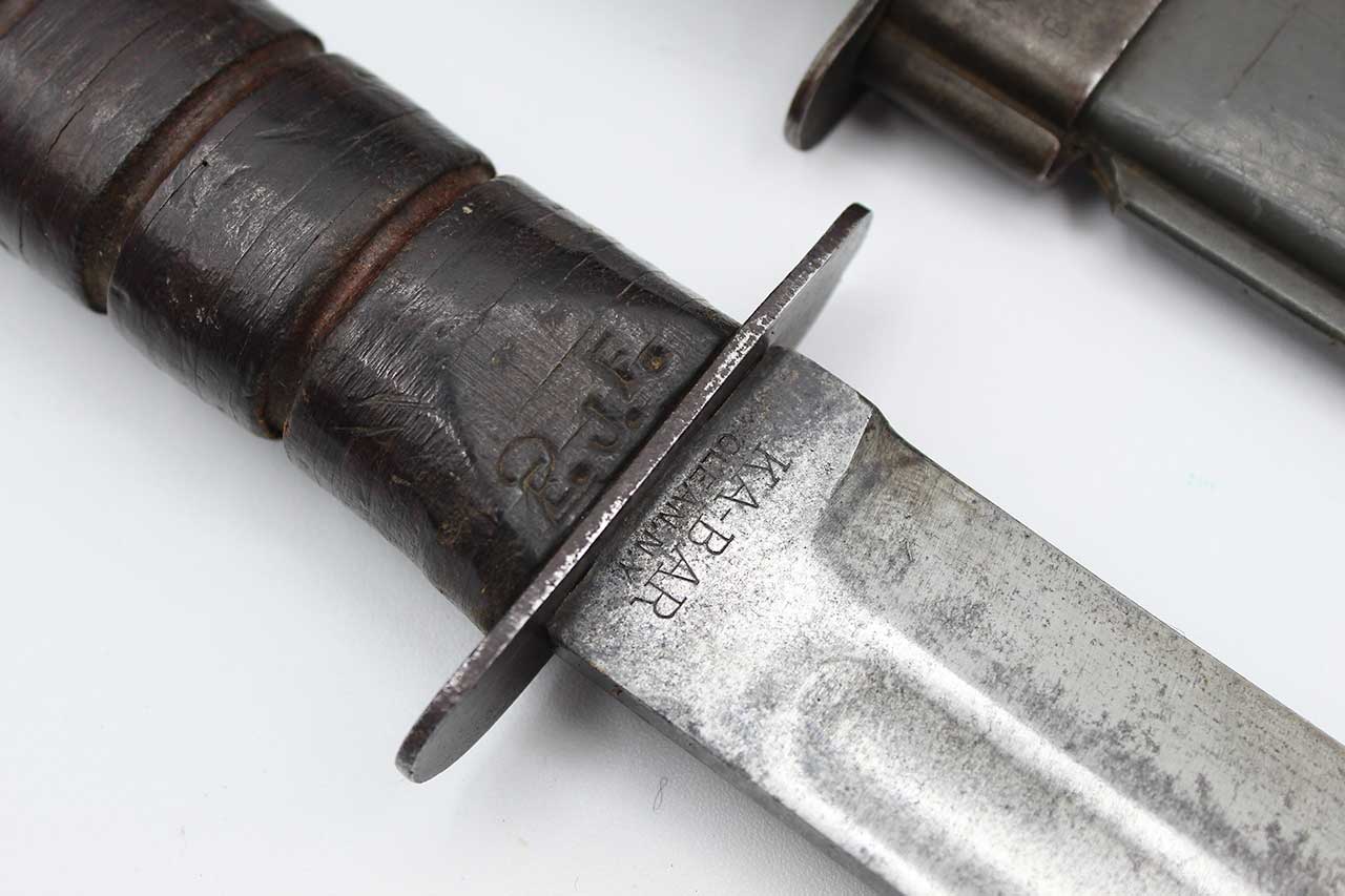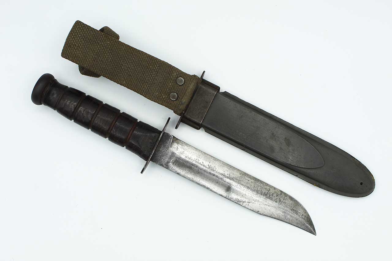 Additional Notes: The United States Navy Mark 2 Fighting Utility Knife, often referred to as the “KA-BAR”, is one of the most iconic combat knives of WW2. Officially known as the 1219C2 Fighting Utility Knife, it was adopted by the U.S. Marine Corps in November of 1942 and later by the Navy as the US Navy Utility Knife, Mark 2. It was designed to replace outdated WW1 era trench knives and served both as a combat weapon and a general-purpose utility tool. The blade was a 7-inch clip point blade made of carbon steel, ideal for both stabbing and cutting. The handle utilized stacked leather washers for grip.