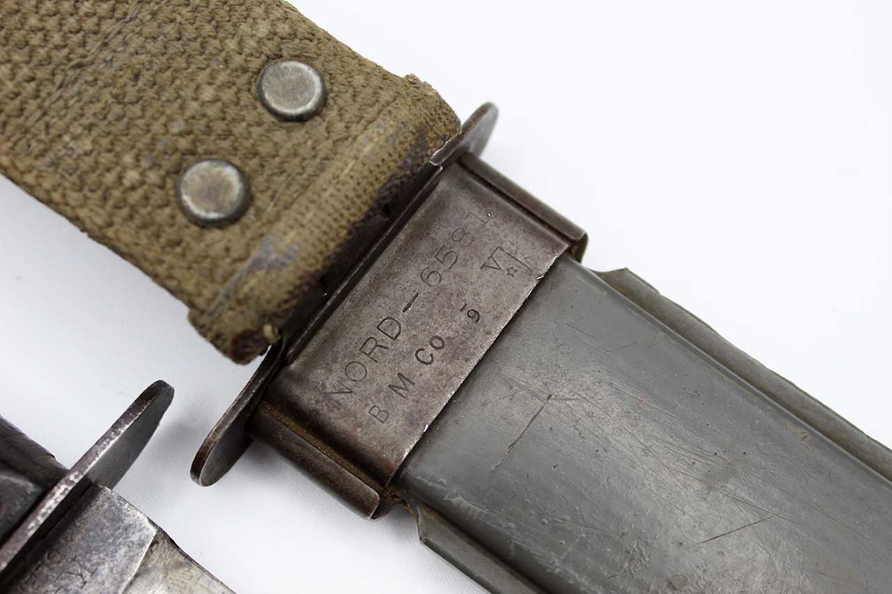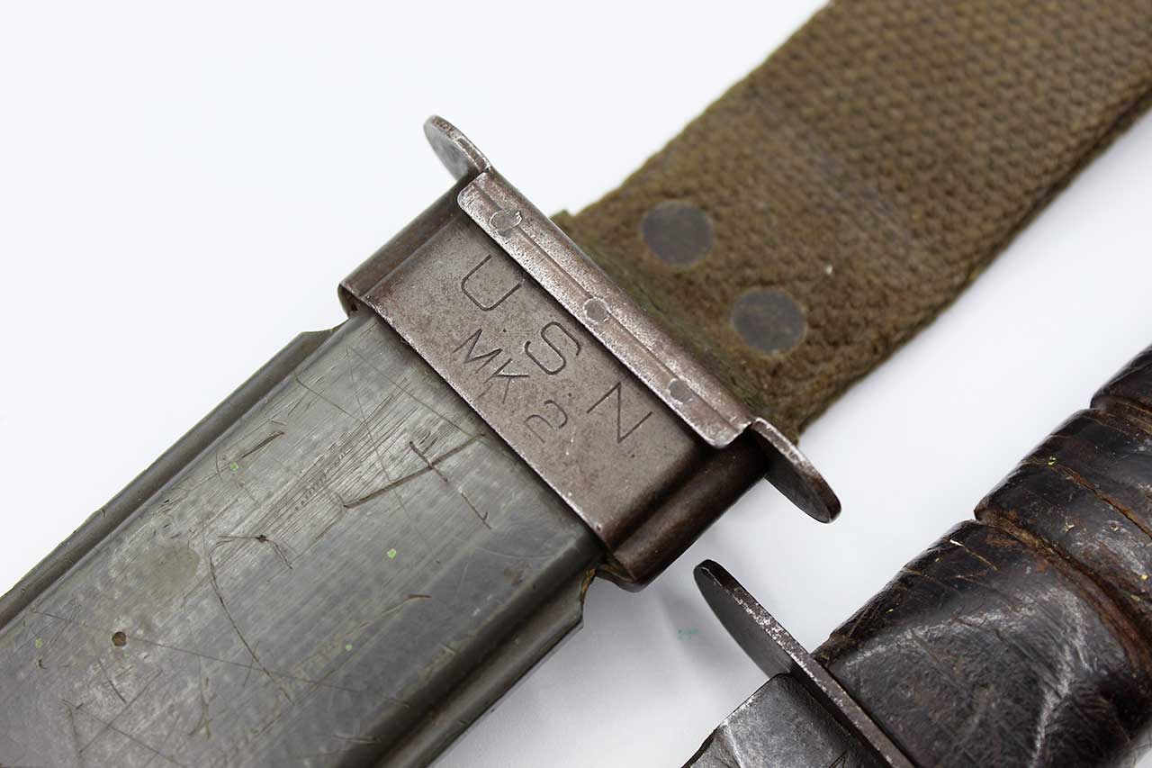 United States Navy WW2 Mark 2 Ka-Bar Combat Knife. This is the first generation USN KA-BAR Mark 2 with the thick round peened pommel and light gray parkerized blade. It is the only KA-BAR USN Mark 2 with the stamped KA-BAR OLEAN N.Y. mark on the blade. The knife has the blade ricasso marked on one side: “U.S.N.” and other the other side: “KA-BAR Orlean N.Y.”. Worn condition stacked leather handle has soldier’s initials: “E.J.F.” on handle. Blade with spotting, staining, and with a bit of wear to the blade and the light gray parkerizing, however, the handle and blade are still nice and tight. Approximately 7-inch blade. Knife has the USN MK 2 composite plastic scabbard with quite of bit of wear, scabbard is marked Nord – 6581 B.M.Co VP (which dates the scabbard to about June 1944). Overall, a worn condition ww2 combat first generation Ka-Bar Mark 2 fighting knife.