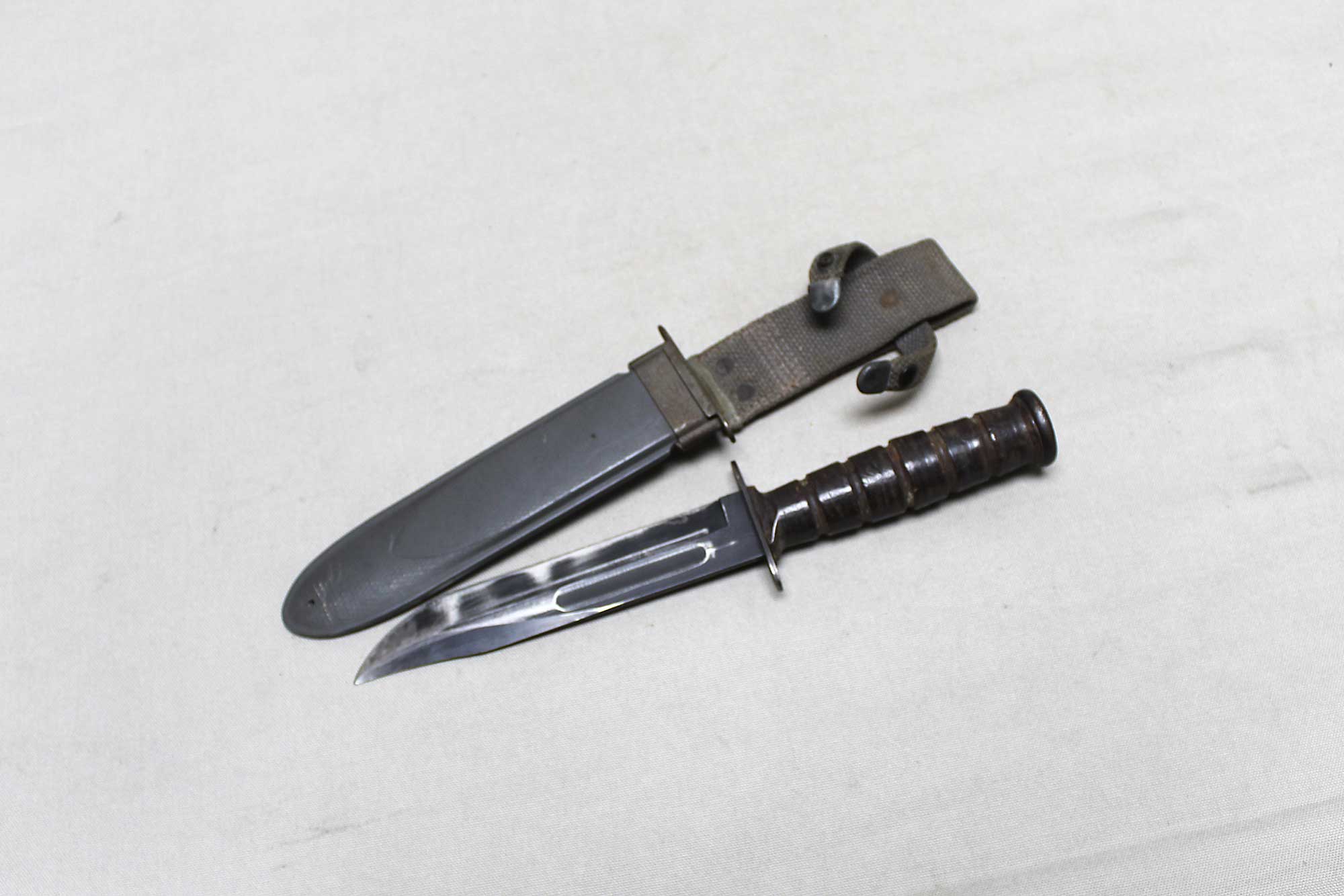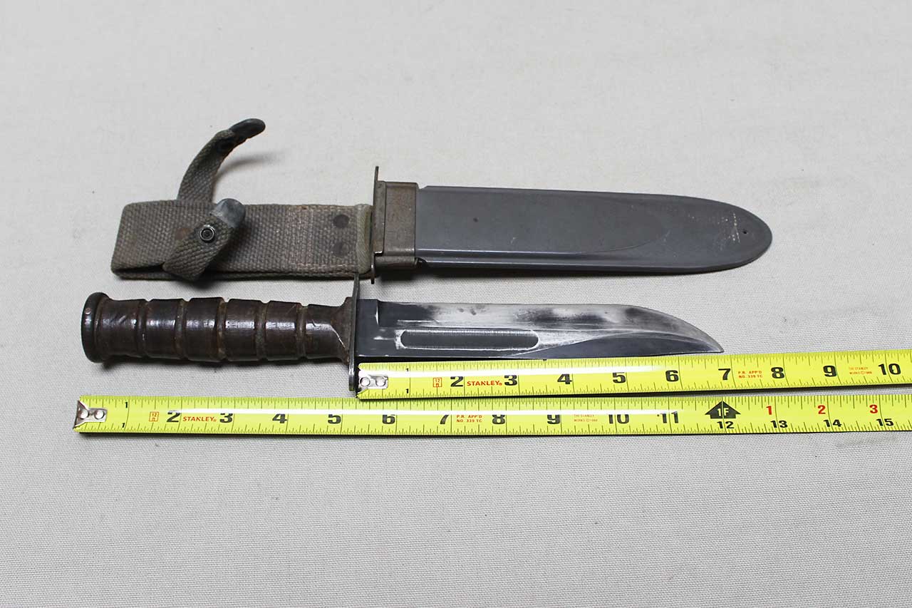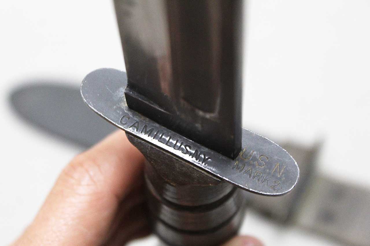 United States Navy Mark 2 fighting knife with sheath. Marked on cross guard” U.S.N. Mark 2″ and “Camillus, N.Y.”.  This is a 1940s (ww2) era knife that is guard marked with parkerized blade and pinned pommel. The blade has a bit of wear to the parkerization and some sharpening. The fiber scabbard is marked on front of scabbard throat U.S.N. MK.2. Worn condition.