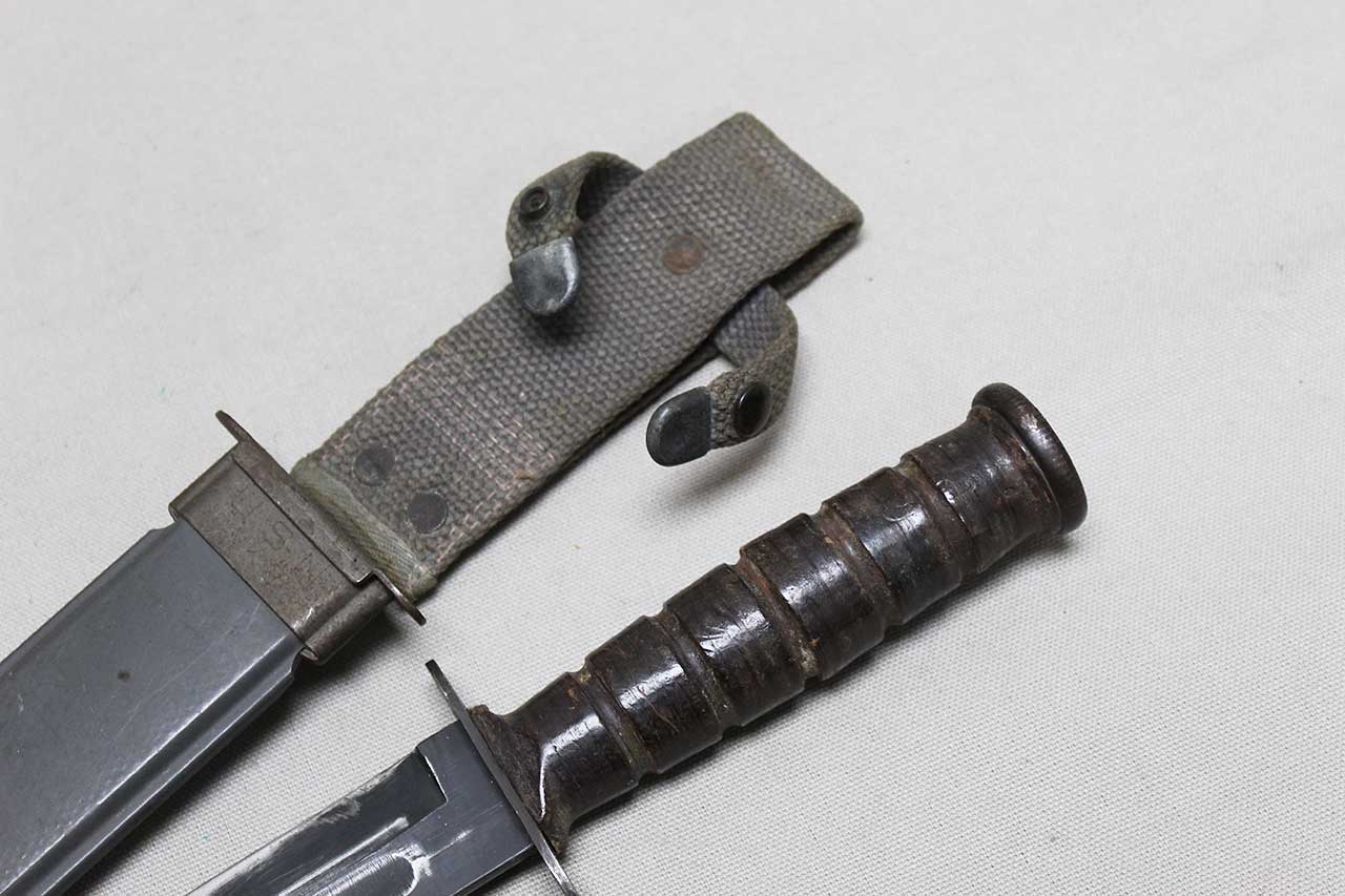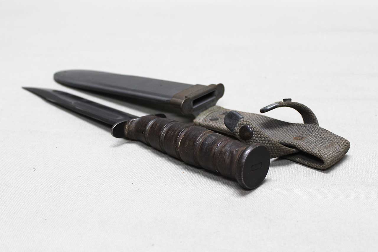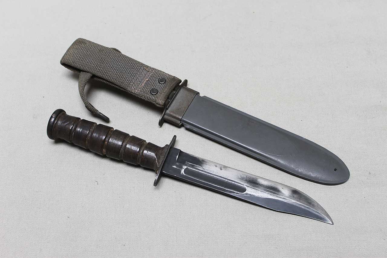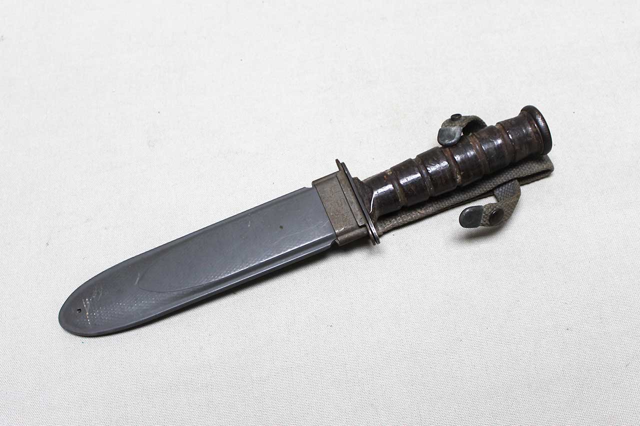 Additional Notes: The United States Navy Mark 2 Fighting Utility Knife, often referred to as the “KA-BAR”, is one of the most iconic combat knives of WW2. Officially known as the 1219C2 Fighting Utility Knife, it was adopted by the U.S. Marine Corps in November of 1942 and later by the Navy as the US Navy Utility Knife, Mark 2. It was designed to replace outdated WW1 era trench knives and served both as a combat weapon and a general-purpose utility tool. The blade was a 7-inch clip point blade made of carbon steel, ideal for both stabbing and cutting. The handle utilized stacked leather washers for grip.