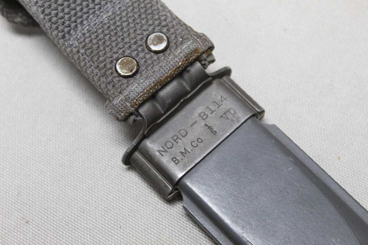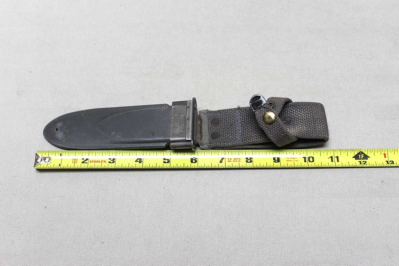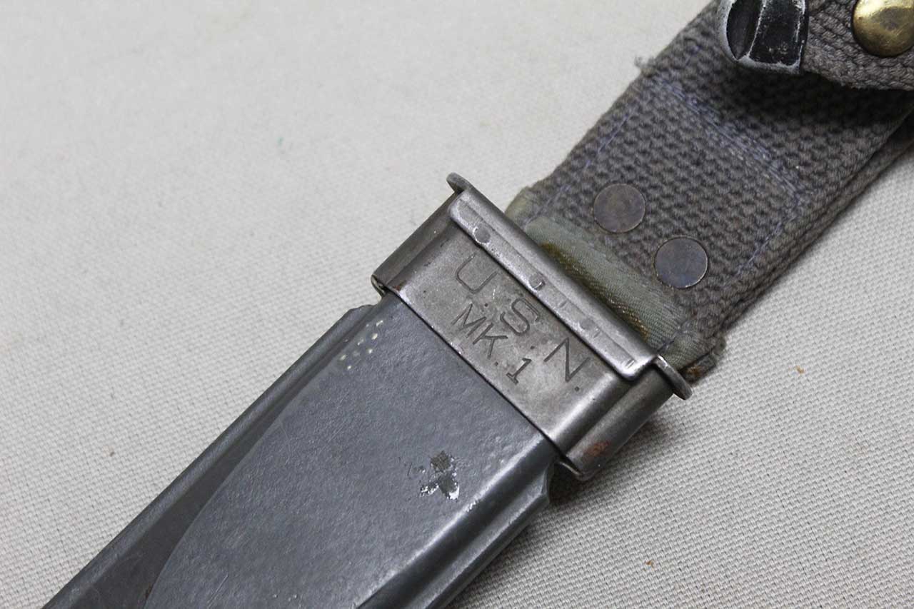 WW2 United States Navy Mark 1 Scabbard for the Mark 1 combat knife. No knife, scabbard only. Marked on front of scabbard throat U.S.N. MK.1 and marked on back of scabbard: NORD-8114 B.M.Co 1/5 vp. (dating to about mid 1945). Snap works fine. Worn condition and good if you need to upgrade a missing or damaged scabbard.