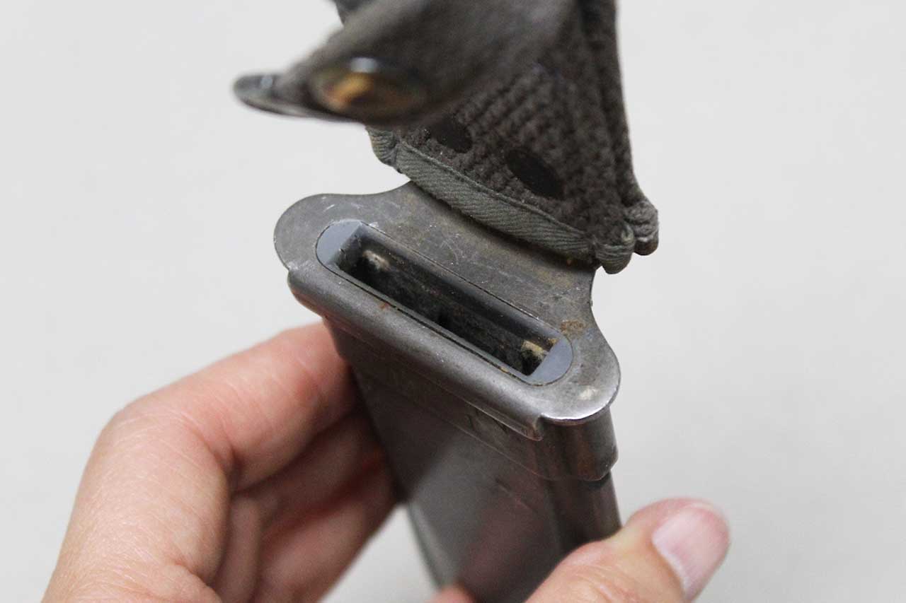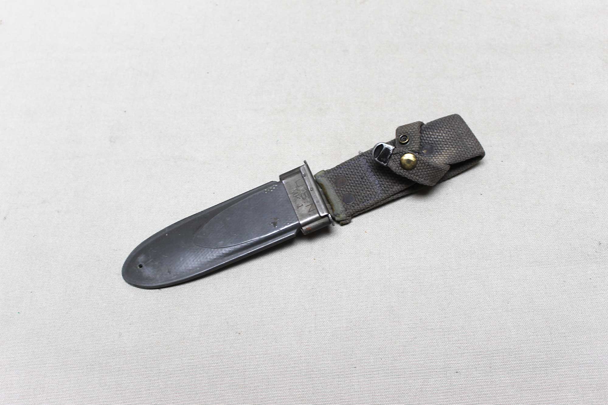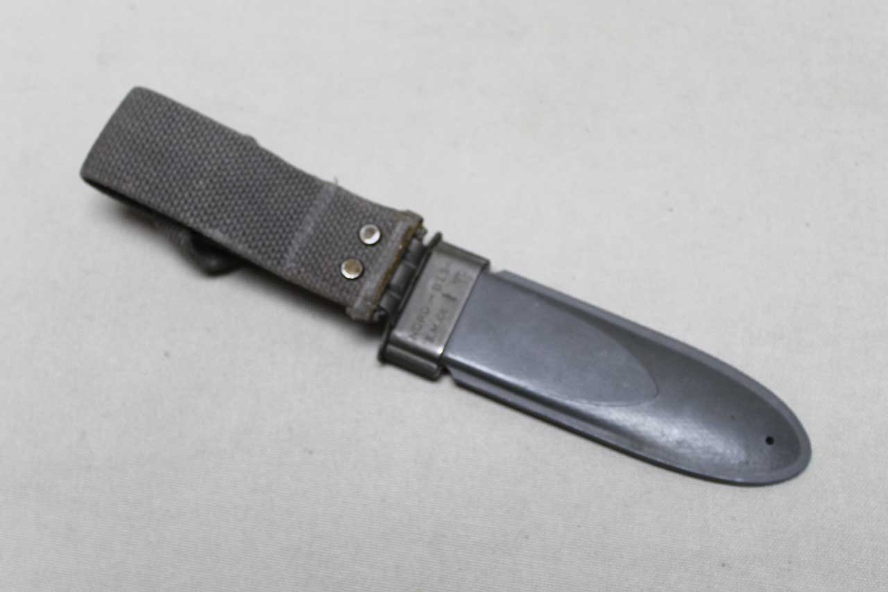 WW2 United States Navy Mark 1 Scabbard for the Mark 1 combat knife. No knife, scabbard only. Marked on front of scabbard throat U.S.N. MK.1 and marked on back of scabbard: NORD-8114 B.M.Co 1/5 vp. (dating to about mid 1945). Snap works fine. Worn condition and good if you need to upgrade a missing or damaged scabbard.