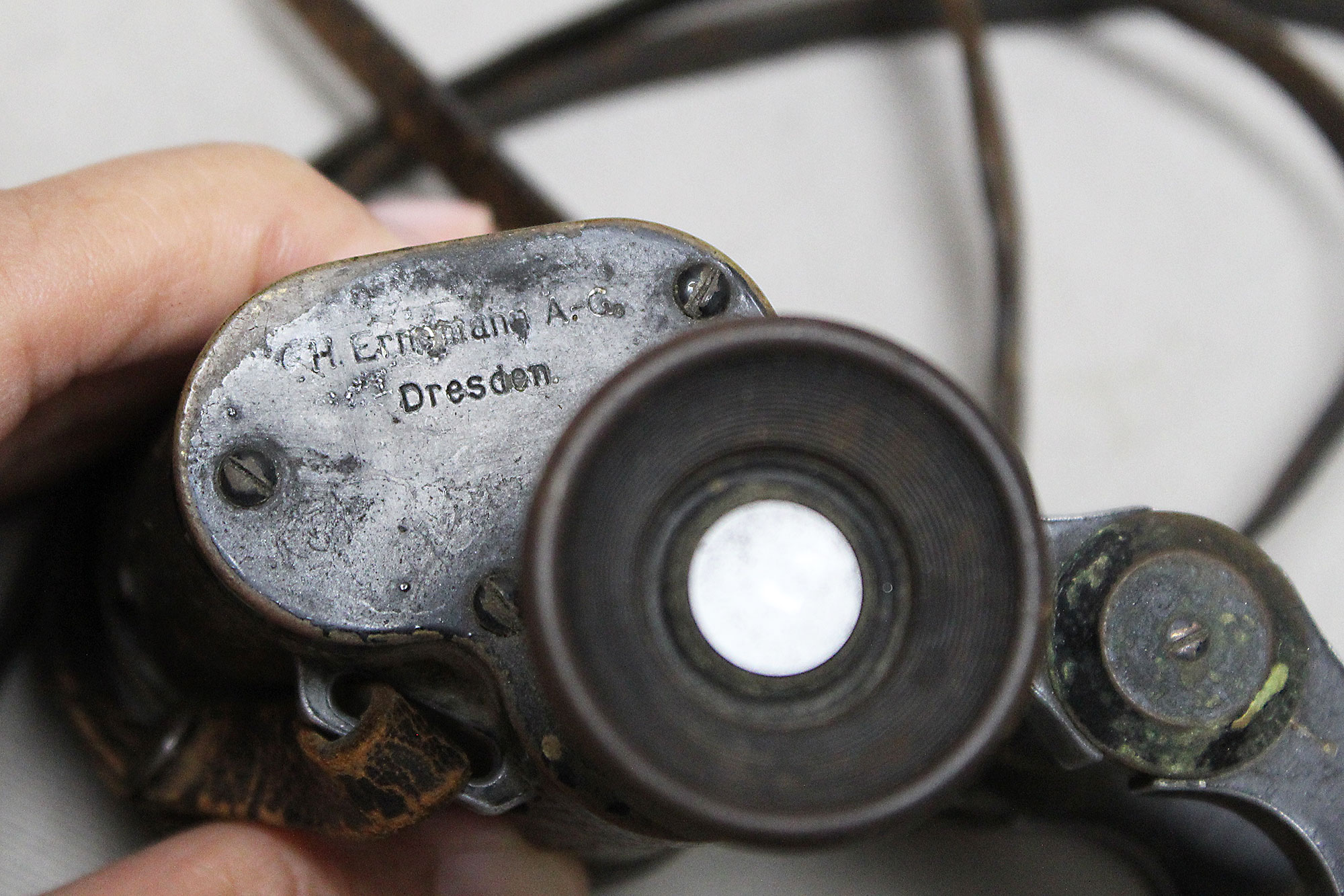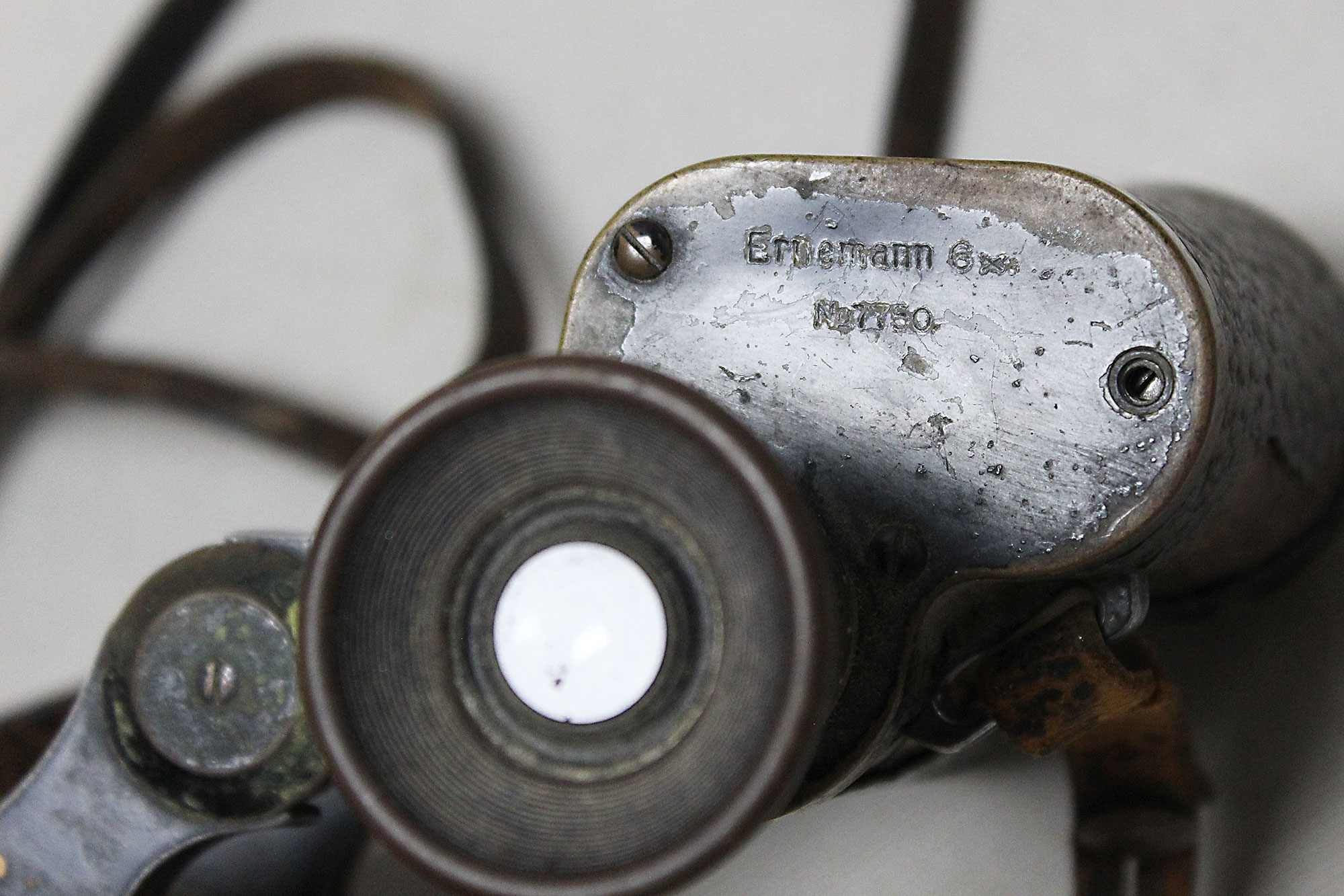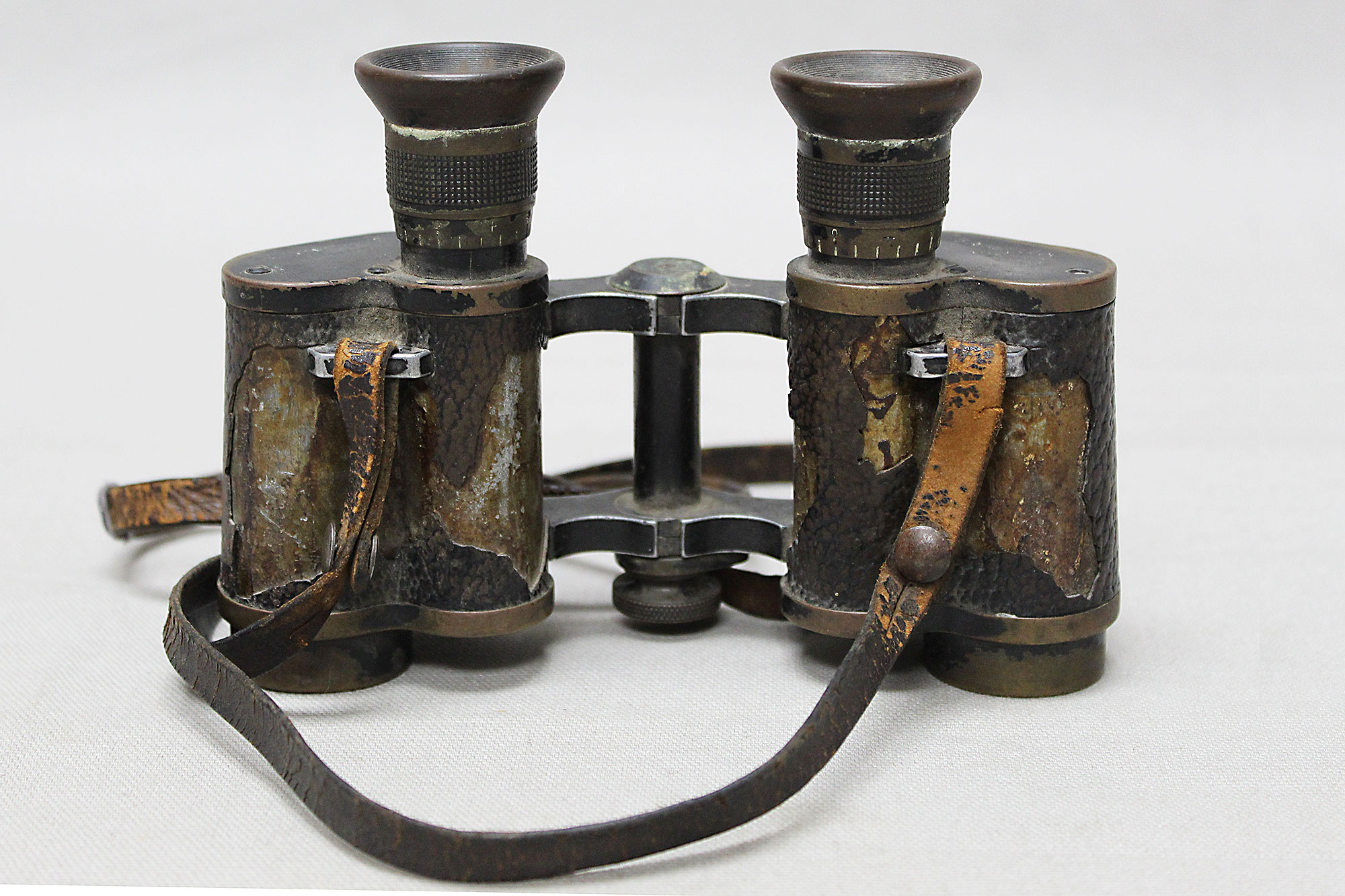 Imperial German Army Binoculars. Marked on binoculars H. Ernemann A-G Dresden on one side and Ernemann 6x No7750 on other side. Binocular strap in heavily worn and damaged condition. A lot of heavy wear and damage to leather covering. Optics in decent condition. Overall heavily worn and used condition.