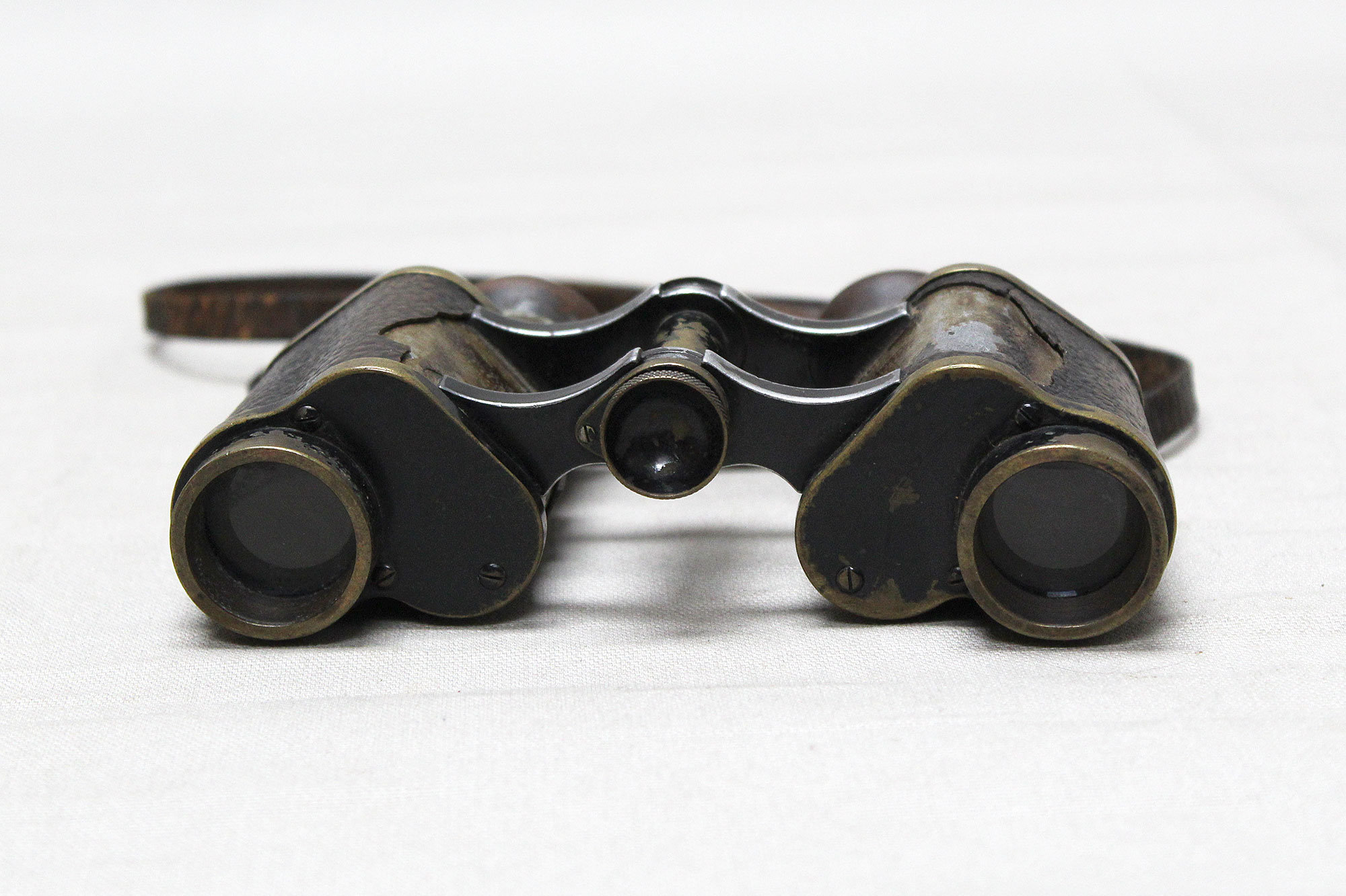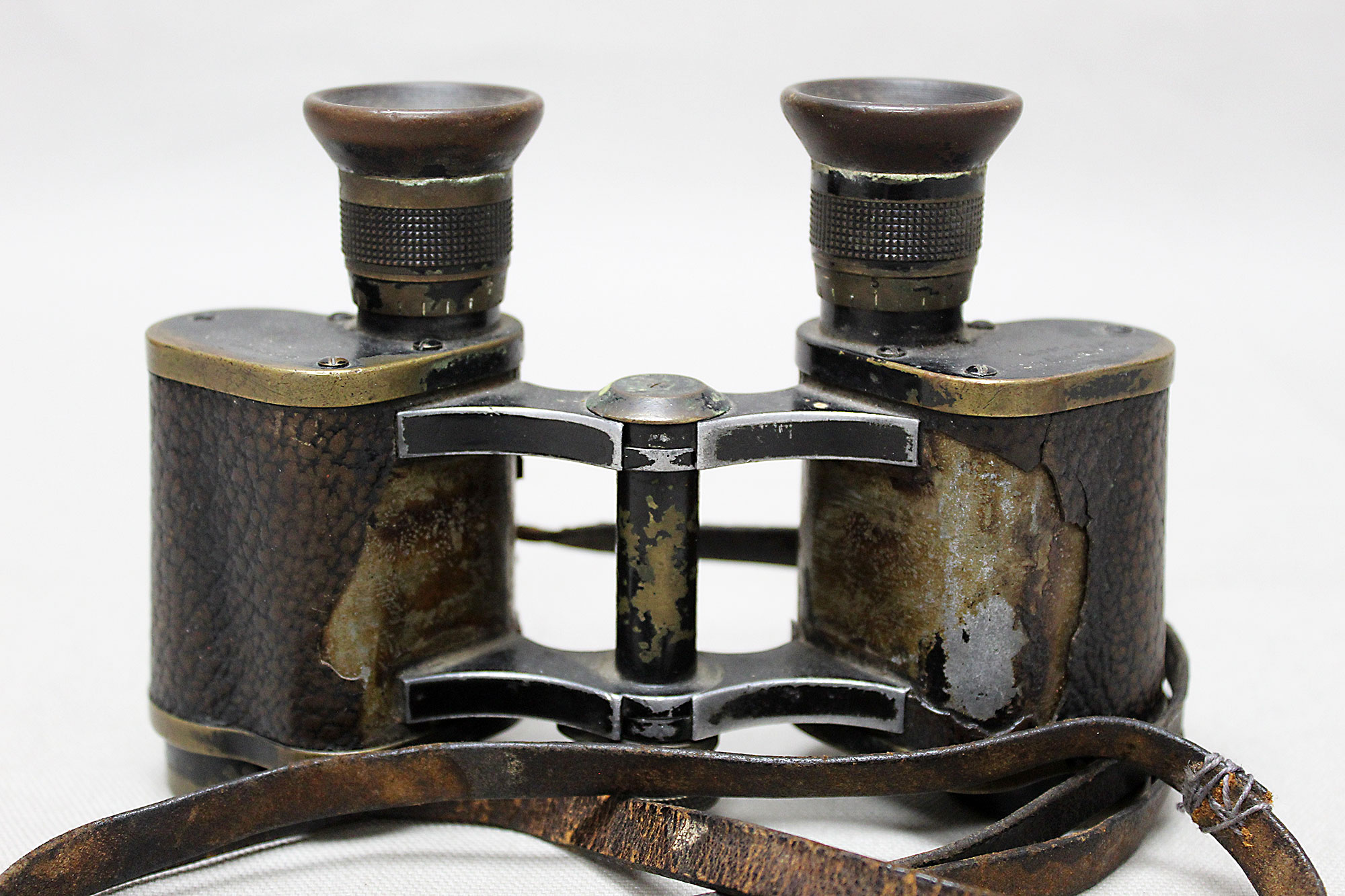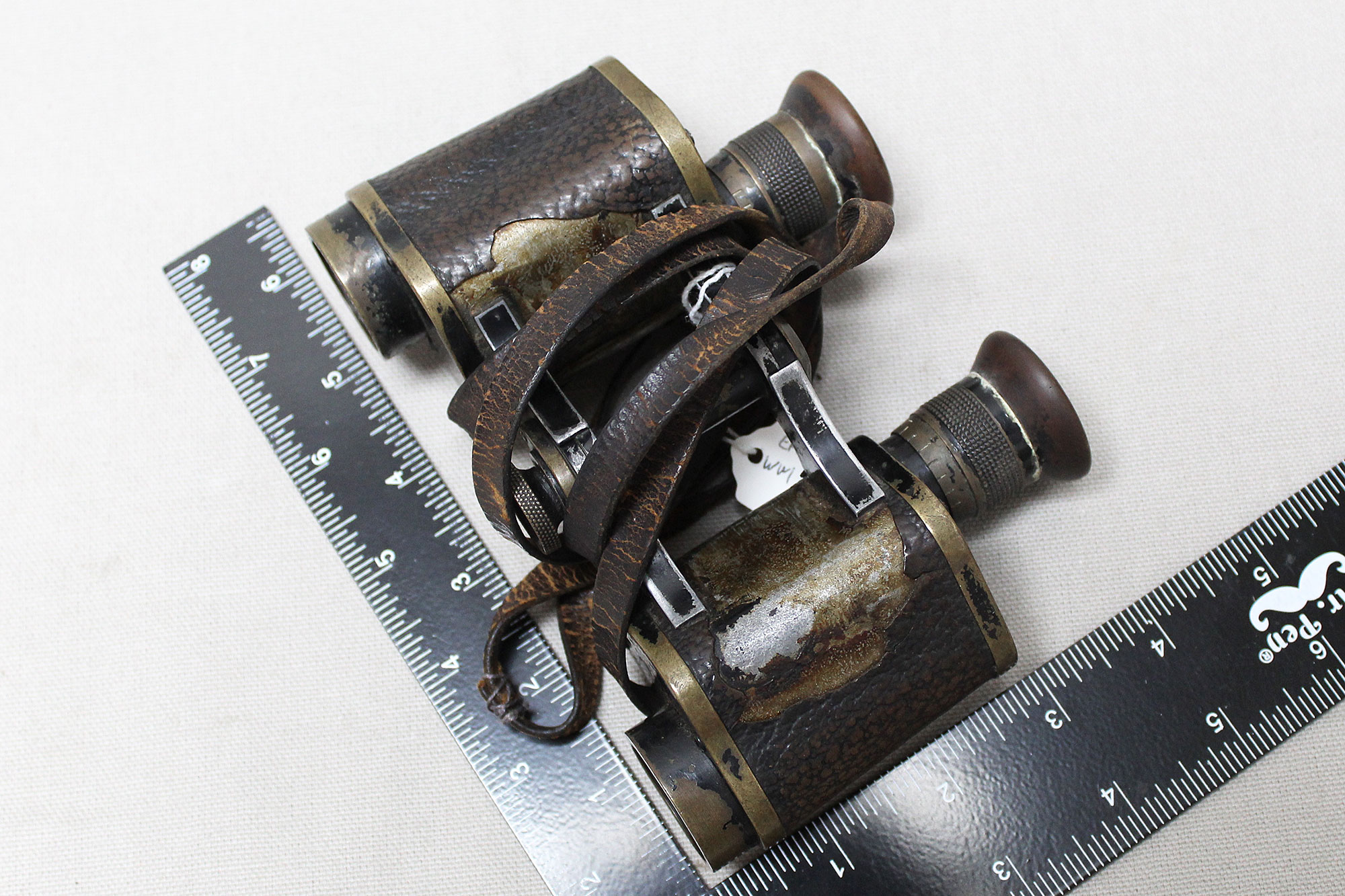 Imperial German Army Binoculars. Marked on binoculars H. Ernemann A-G Dresden on one side and Ernemann 6x No7750 on other side. Binocular strap in heavily worn and damaged condition. A lot of heavy wear and damage to leather covering. Optics in decent condition. Overall heavily worn and used condition.