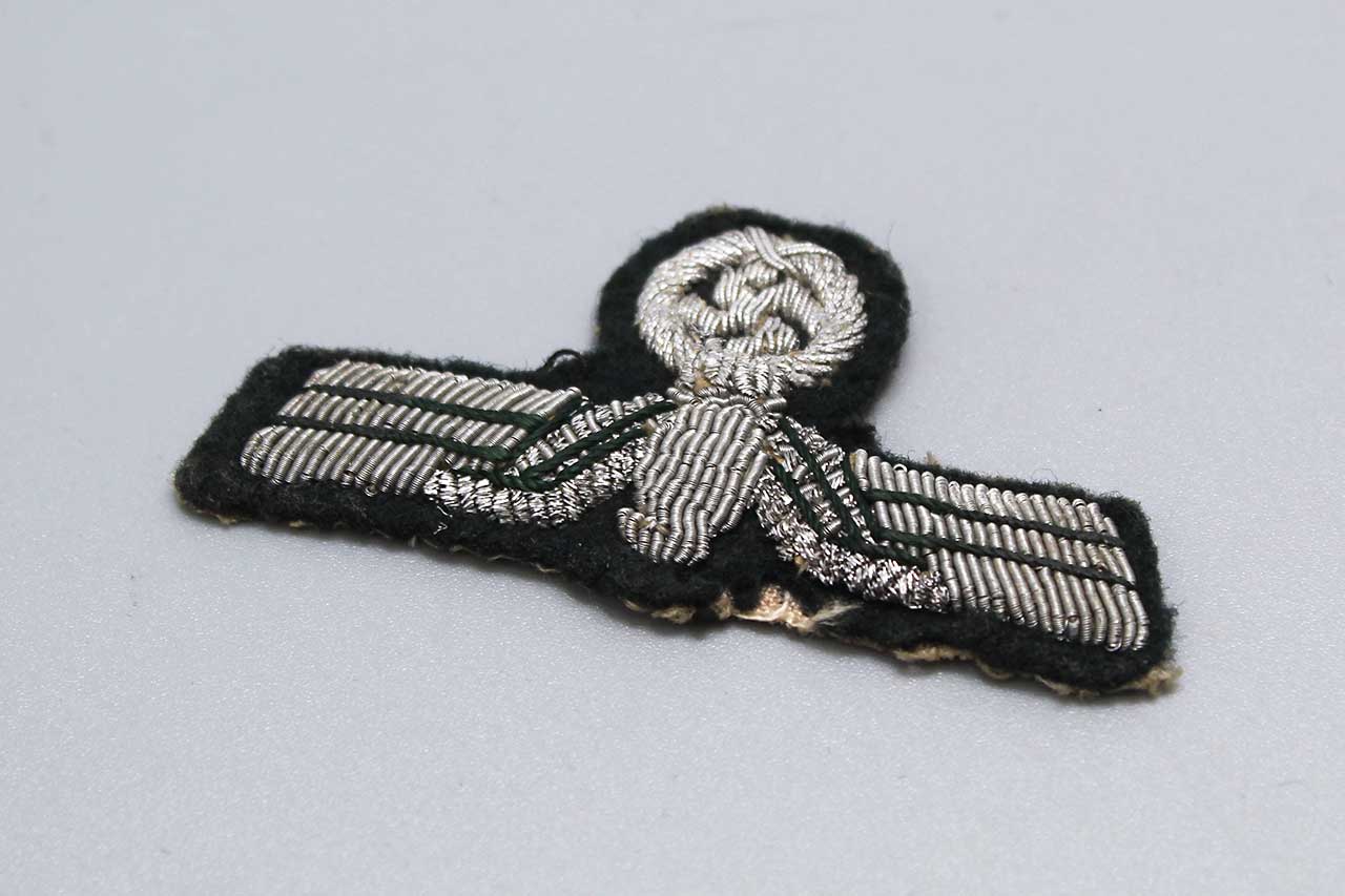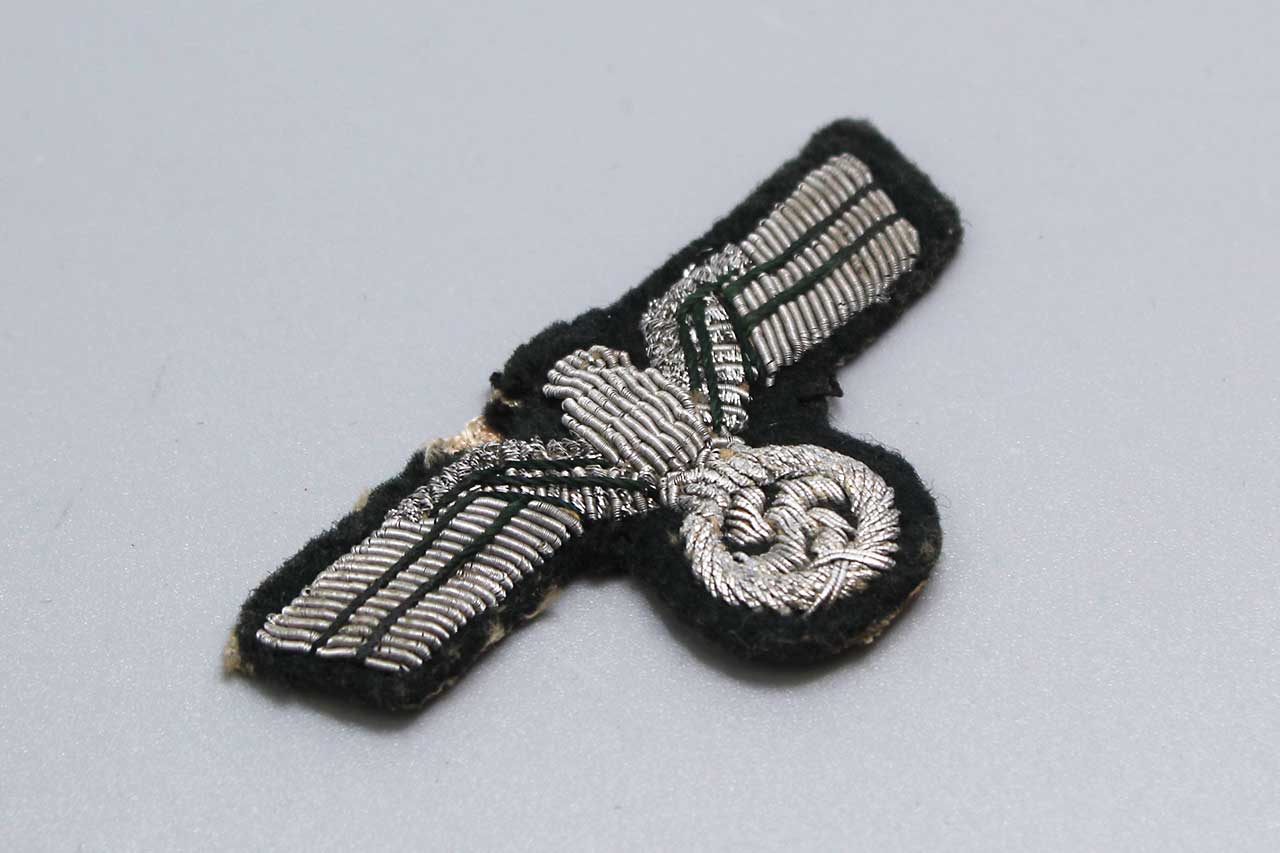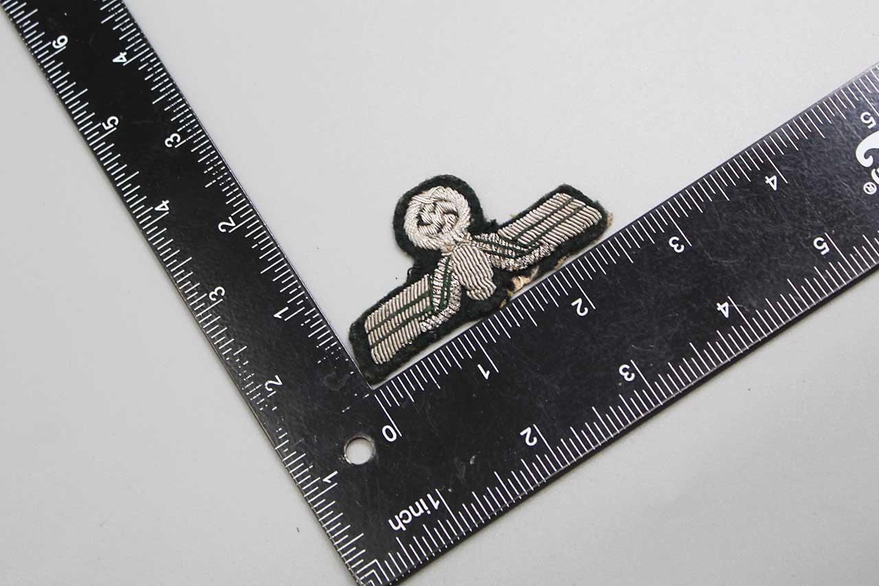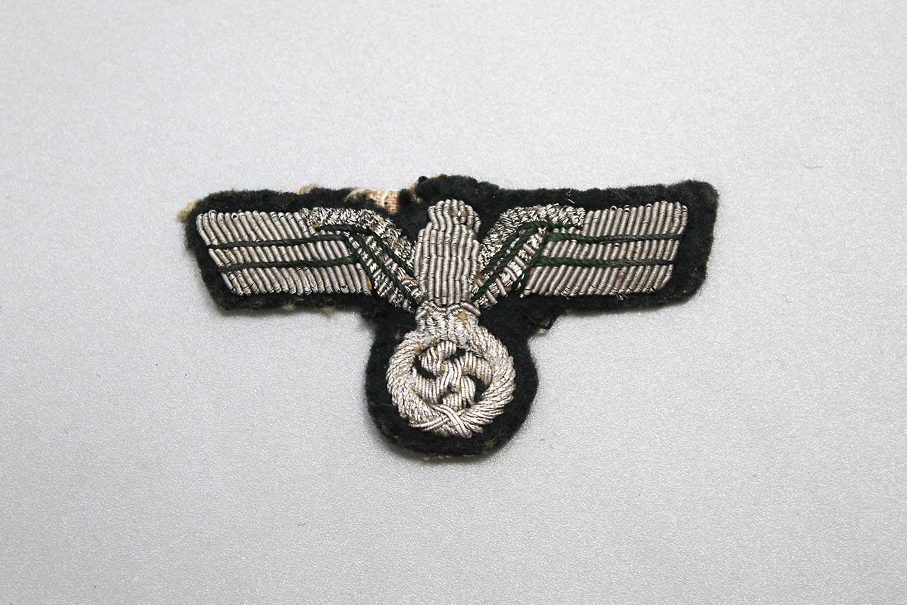 WW2 German Officer Cap Eagle. Nice silver bullion cap eagle. Appears to be cap removed. Size approximately 2 1/2 inches across. Worn condition.