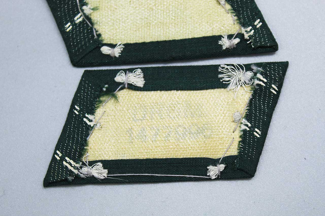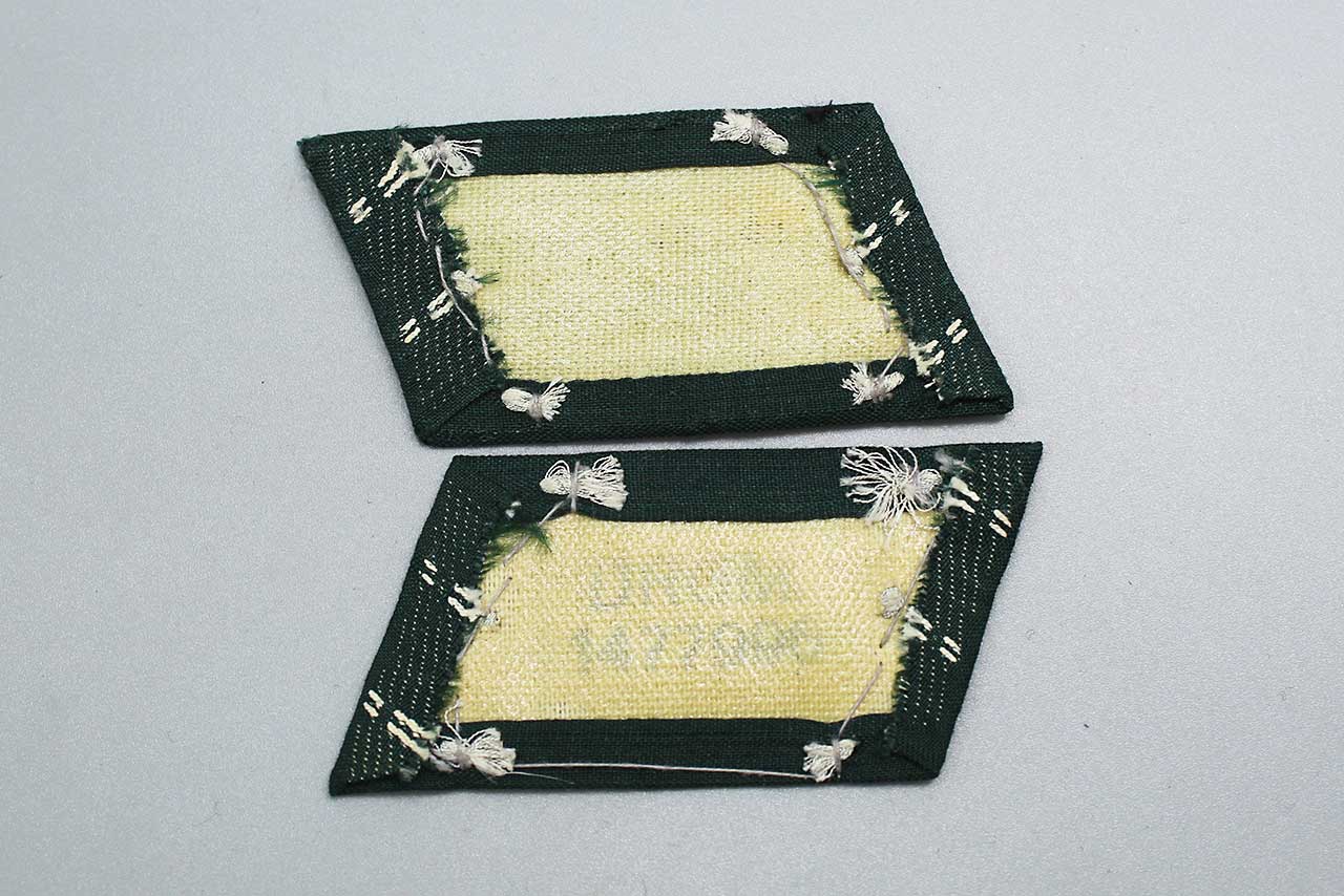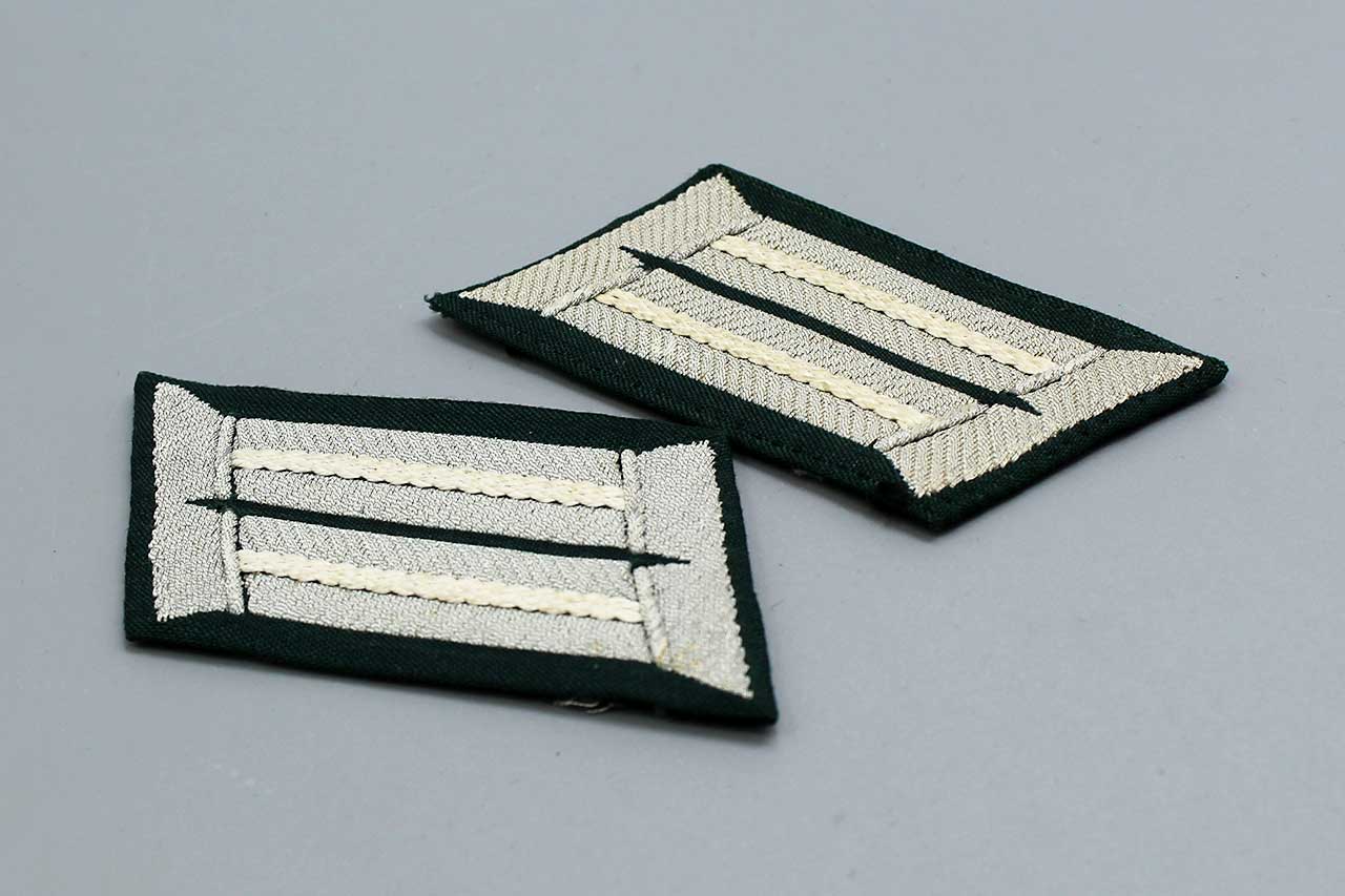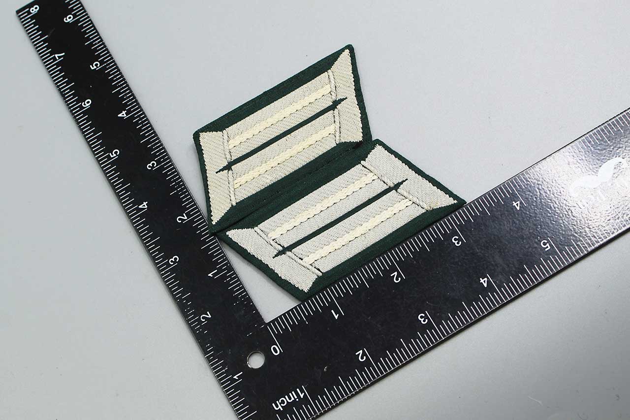WW2 German Army Infantry Officer Collar Tab pair. Embroidered litzen in silver-aluminum wire thread with white branch of service stripes for Infantry on dark blue-green cloth base. Collar tabs with light buckram backing material. Nice condition collar tabs.